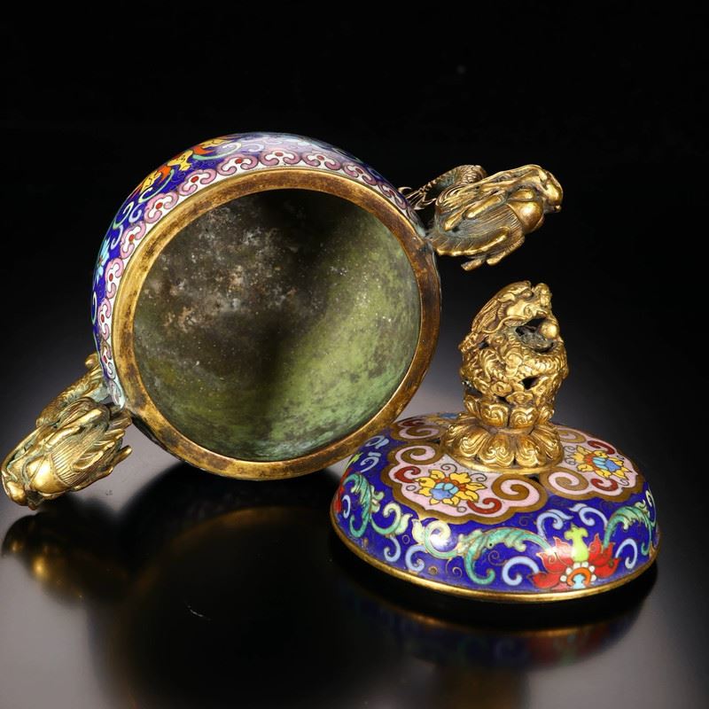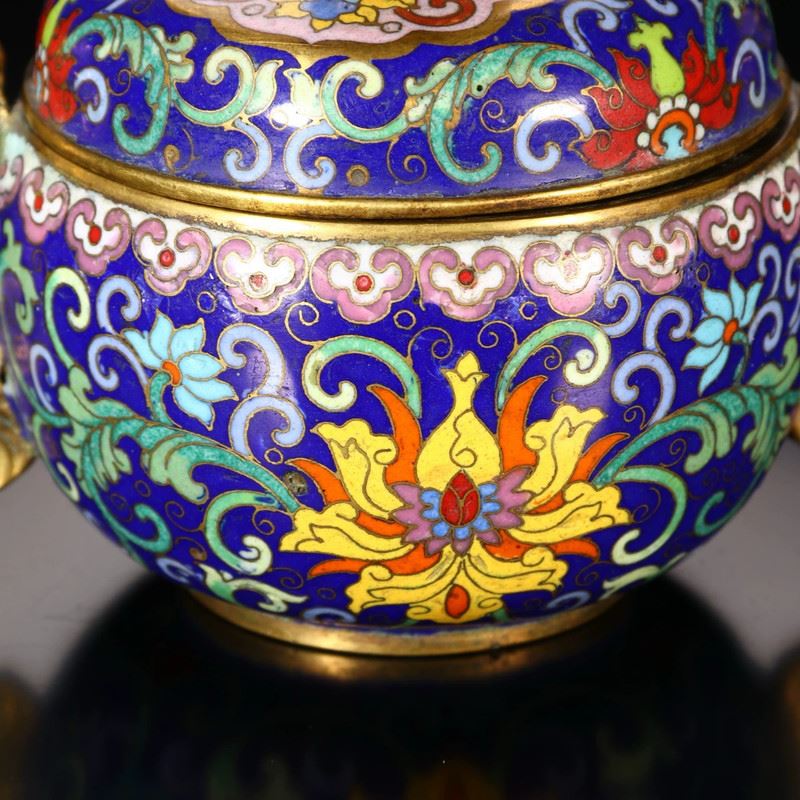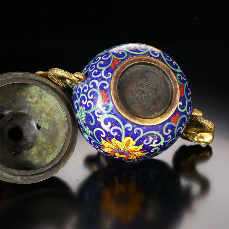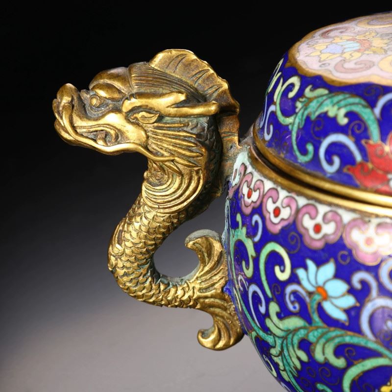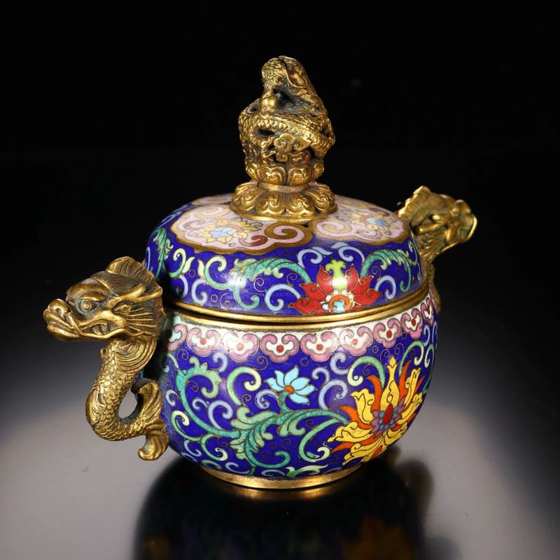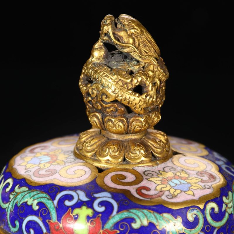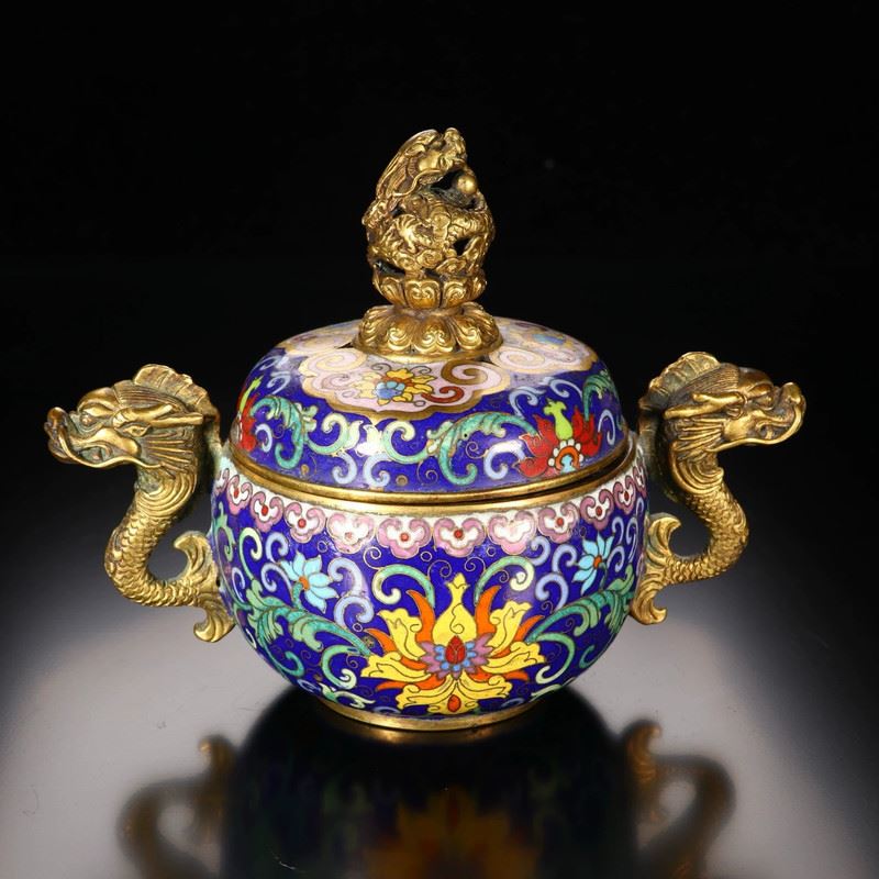This gilded copper cloisonné enamel double dragon-ear incense burner showcases the grandeur and exquisite craftsmanship of Qing Dynasty court art. The body of the incense burner is made of copper, treated with fine gilding for a brilliant finish. The double dragon ears symbolize power and auspiciousness, with the cloisonné enamel work on the dragons' bodies rich in color and intricate patterns, highlighting the superb skill of traditional craftsmanship. The small dragon carving at the top of the lid adds a sense of mystery and majesty, making this incense burner not only functional but also a highly collectible piece of imperial art.