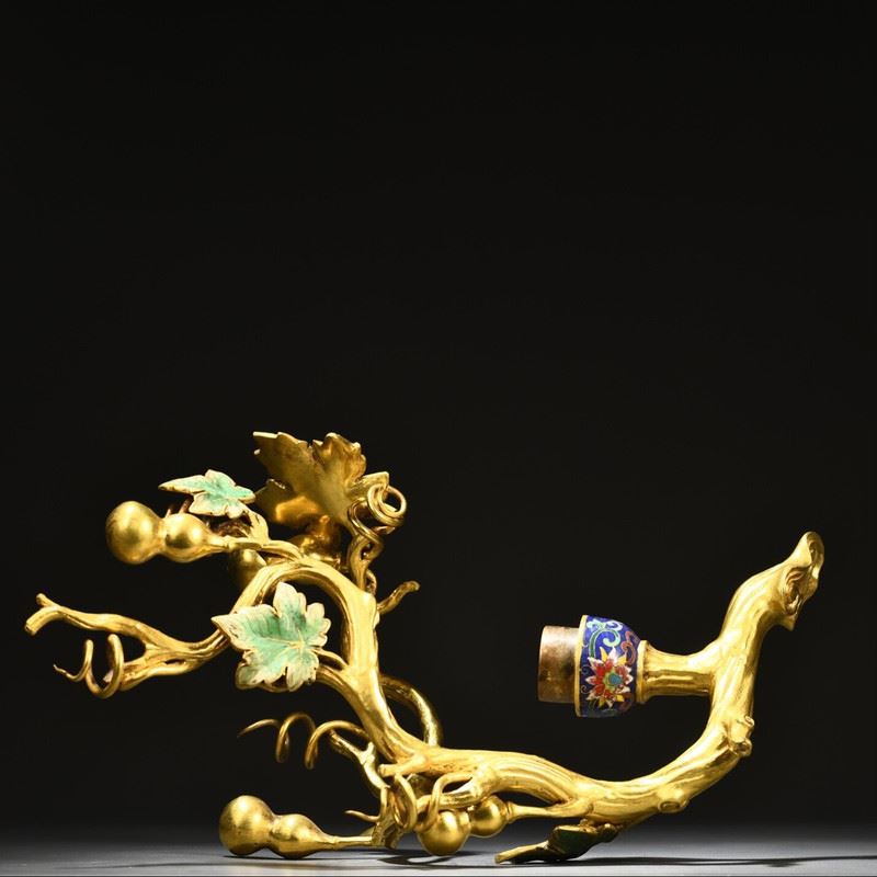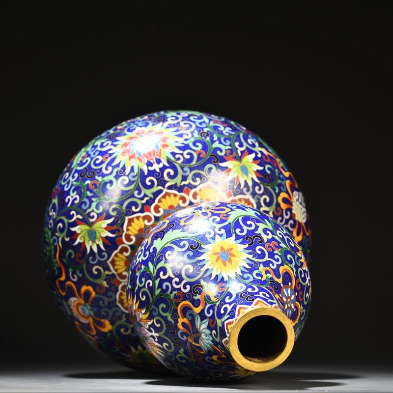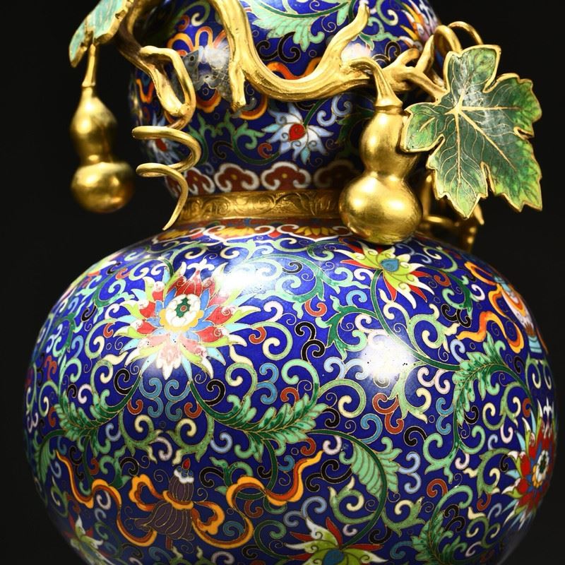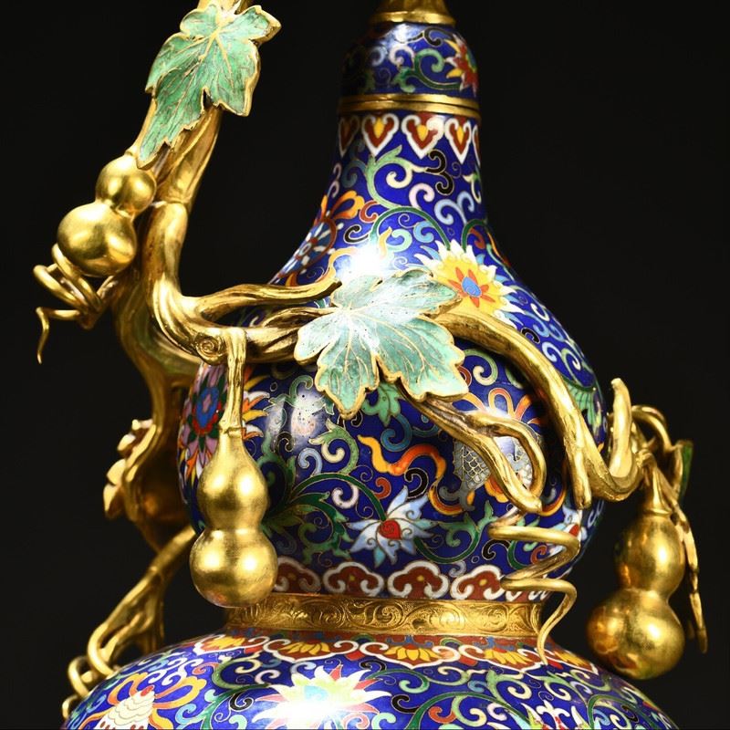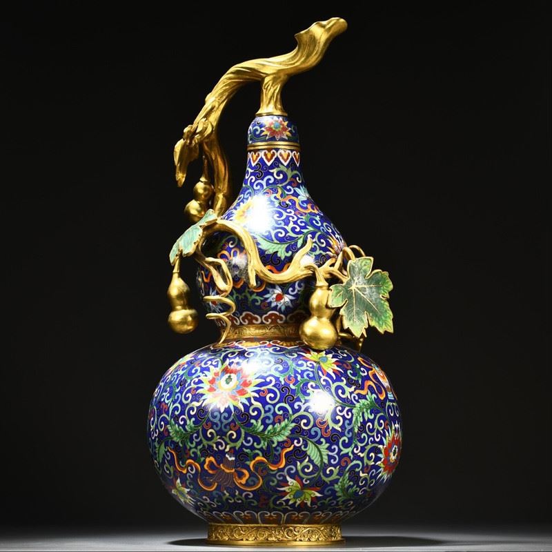 This gilded copper cloisonné enamel gourd floral vase seamlessly combines the shape of a gourd with exquisite cloisonné craftsmanship, showcasing the perfect fusion of traditional art and natural elements. The vase is adorned with vibrant floral patterns, with superb craftsmanship, while the golden vines and leaves enhance its luxurious feel. The gourd symbolizes good fortune and prosperity, and the gilded accents emphasize its value and nobility. The overall design is both artistically beautiful and symbolically rich, making it a highly collectible art piece.