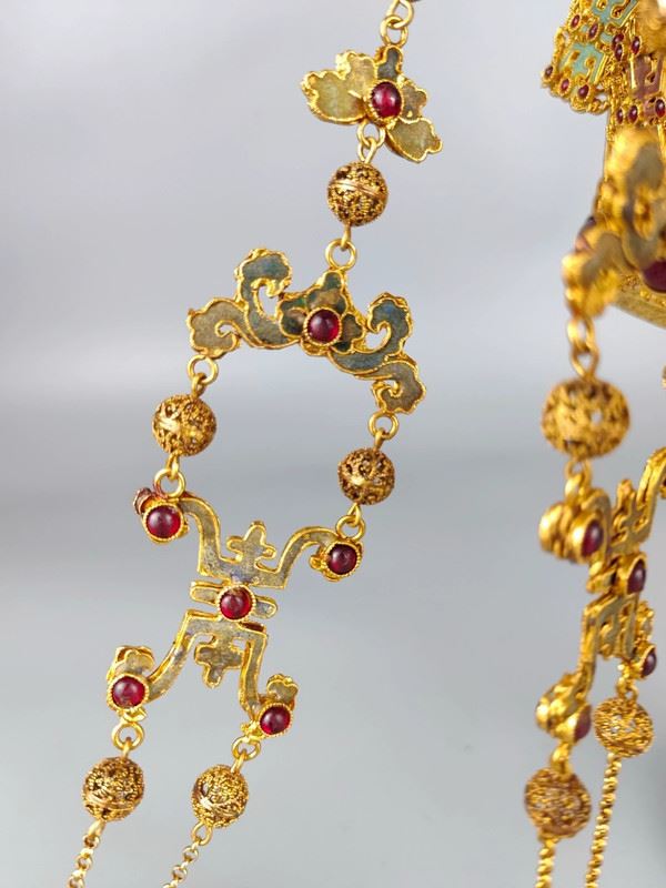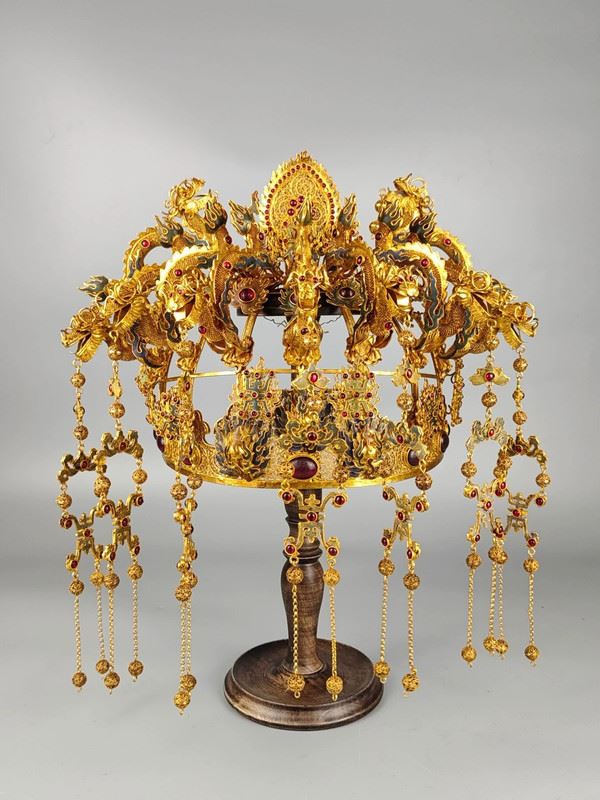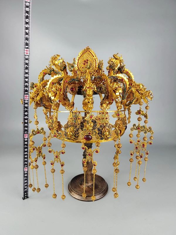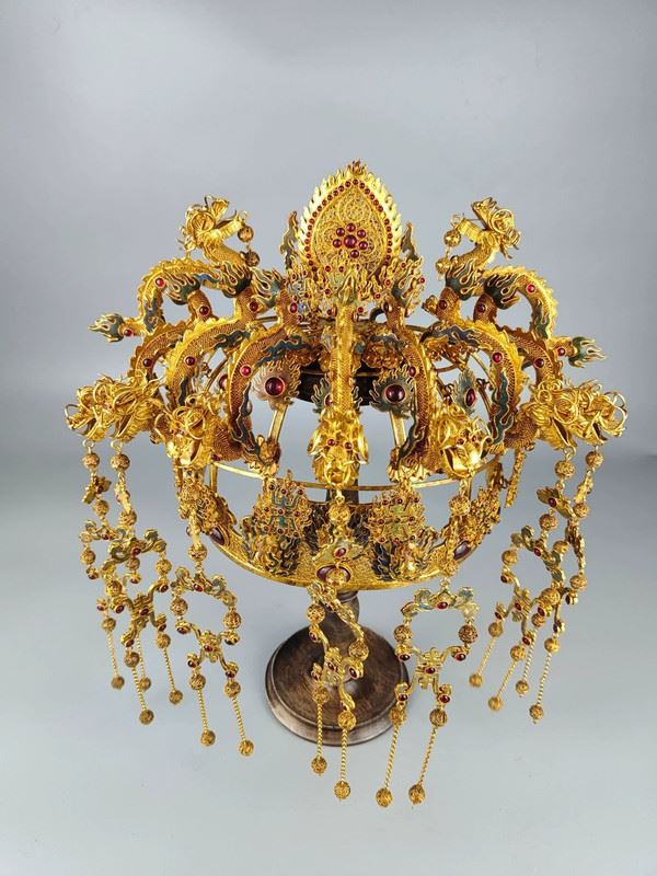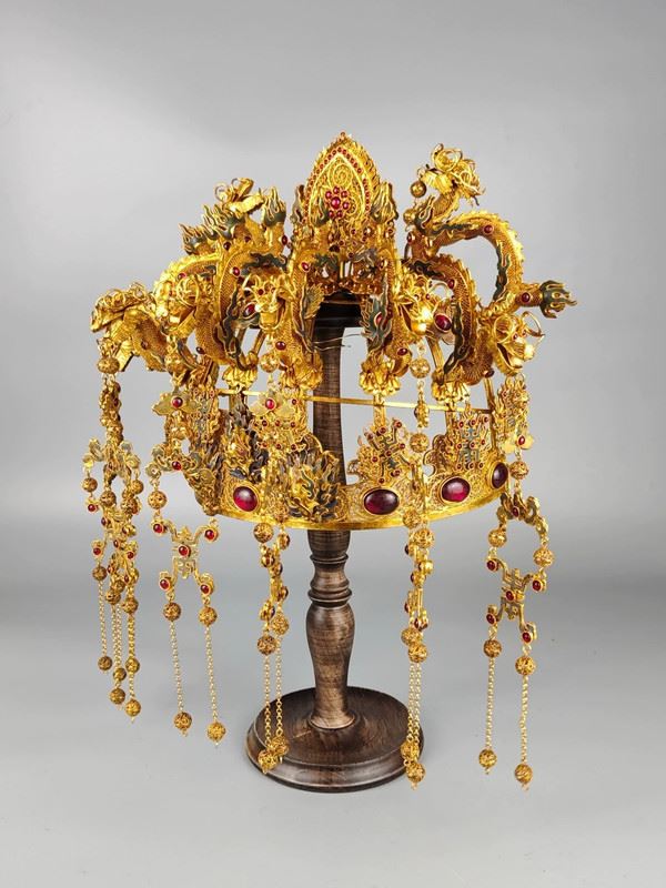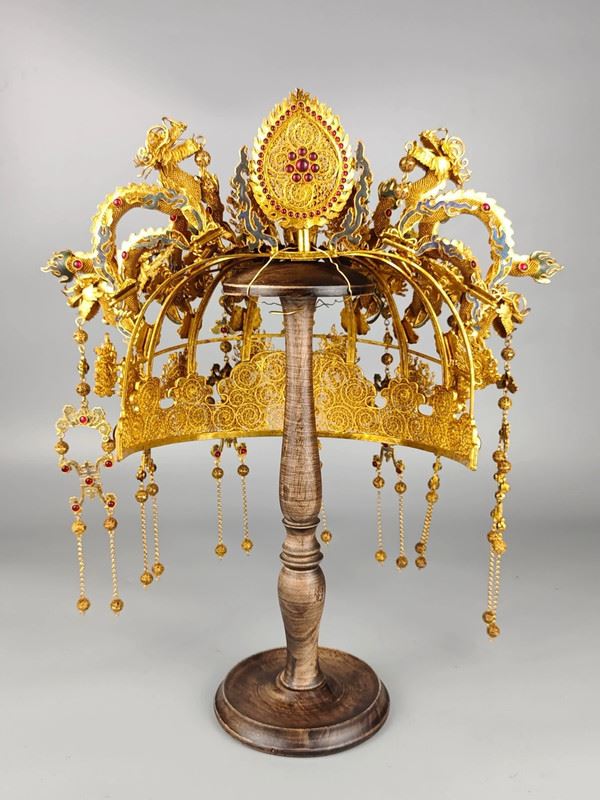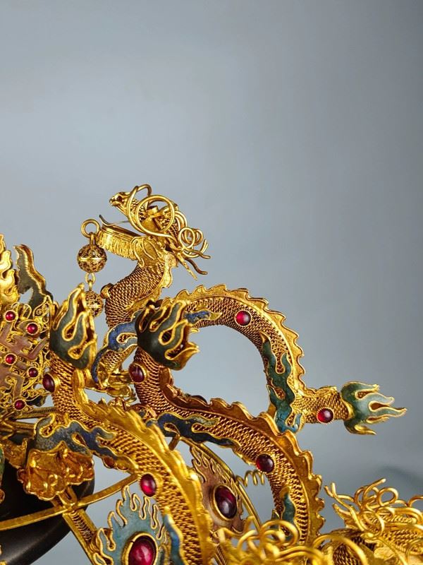 This gilded copper dragon crown with gold filigree showcases the grandeur and luxury of Qing Dynasty court art. The delicate combination of gold filigree and copper gives the crown a unique luster and opulent feel. The design incorporates intricate dragon carvings and luxurious gemstone embellishments, symbolizing imperial power and auspiciousness. The finely detailed crown top and hanging beaded chains further emphasize the superb craftsmanship and artistic value of this royal artifact. This crown is not only a symbol of power but also a highly collectible piece of historical artistry.