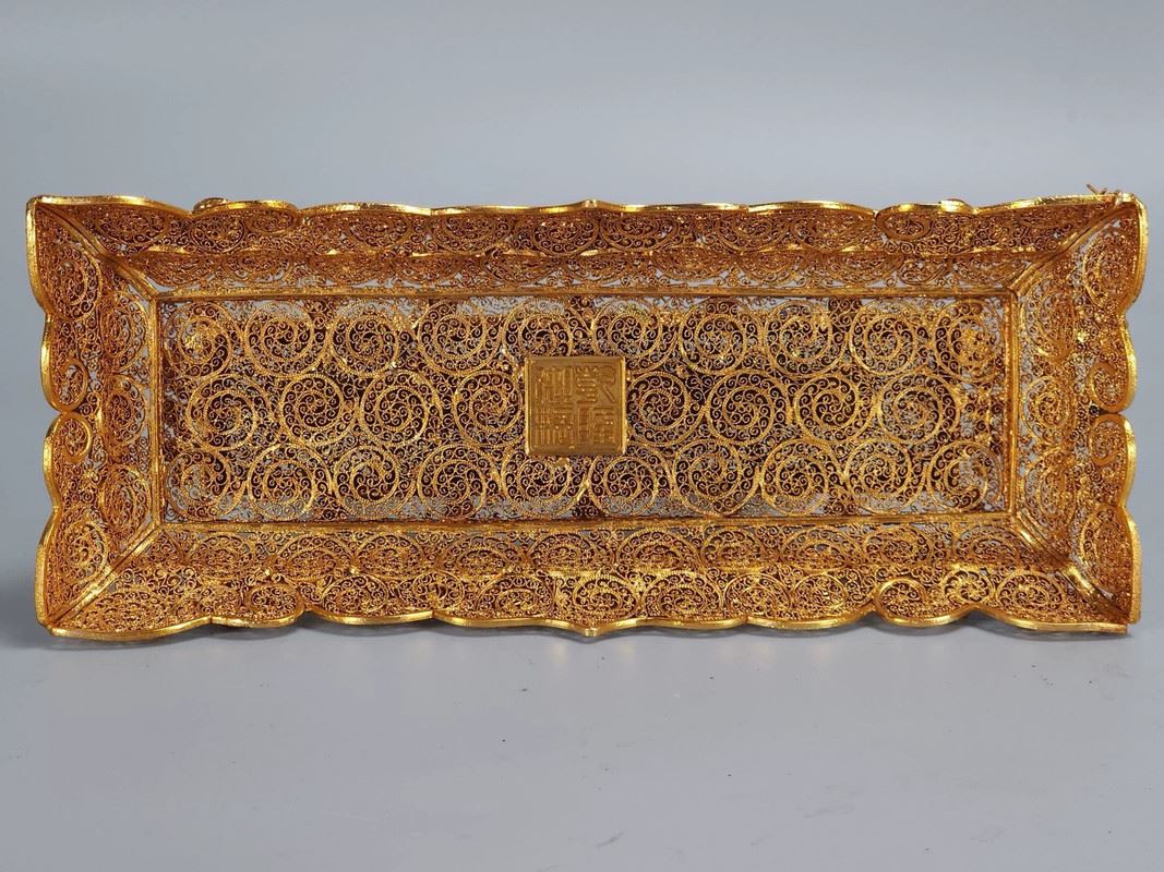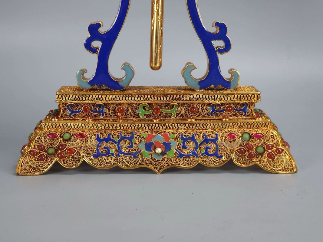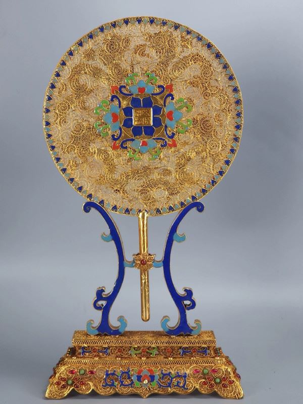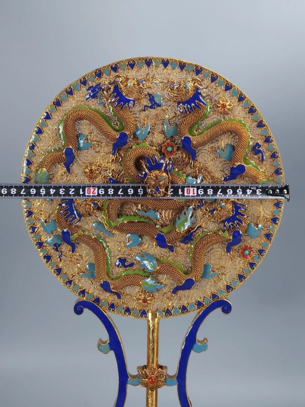 This pair of gilded copper filigree dragon and phoenix hand fans showcases the grandeur and exquisite craftsmanship of Qing Dynasty court art. The fans are made of copper with intricate gilding, giving them a brilliant shine. Each fan features vivid dragon and phoenix designs, symbolizing auspiciousness and power, with vibrant colors and rich details. The fan handles are decorated with gold filigree craftsmanship, reflecting the highest level of traditional artistry. These hand fans are not only decorative items from the royal court but also highly collectible art treasures.
