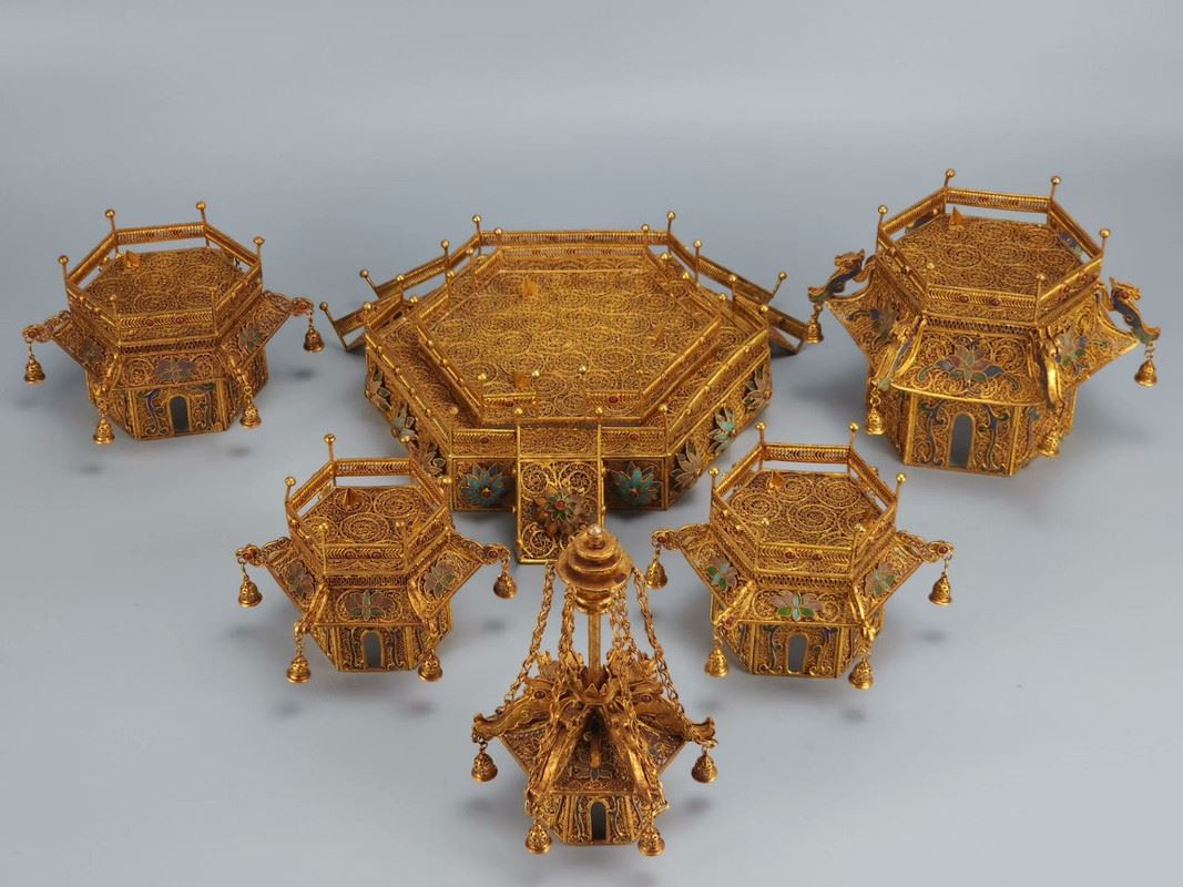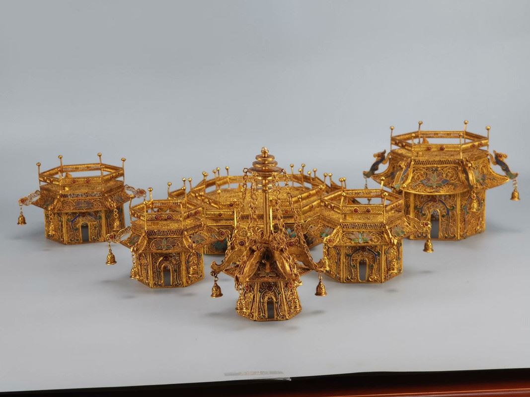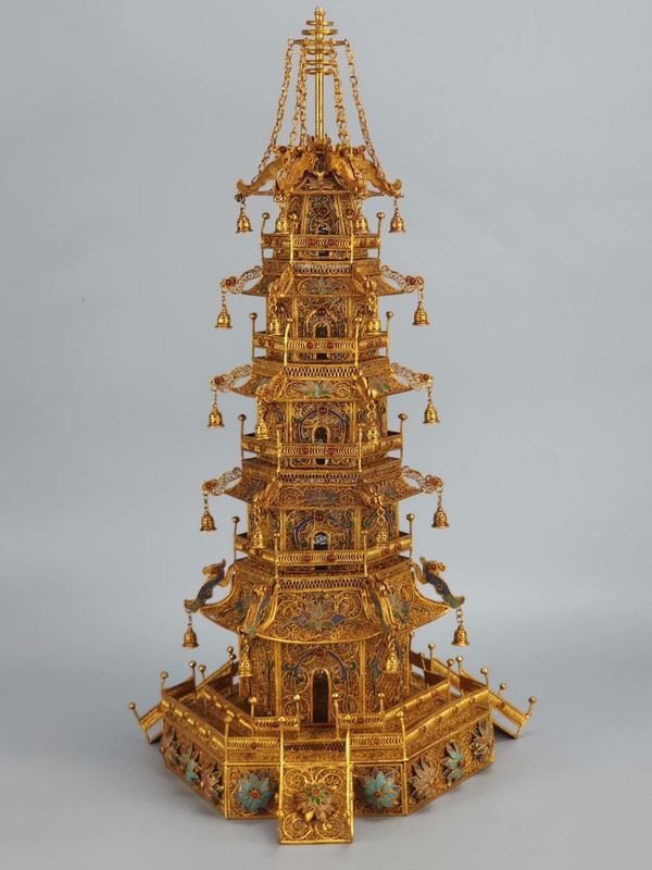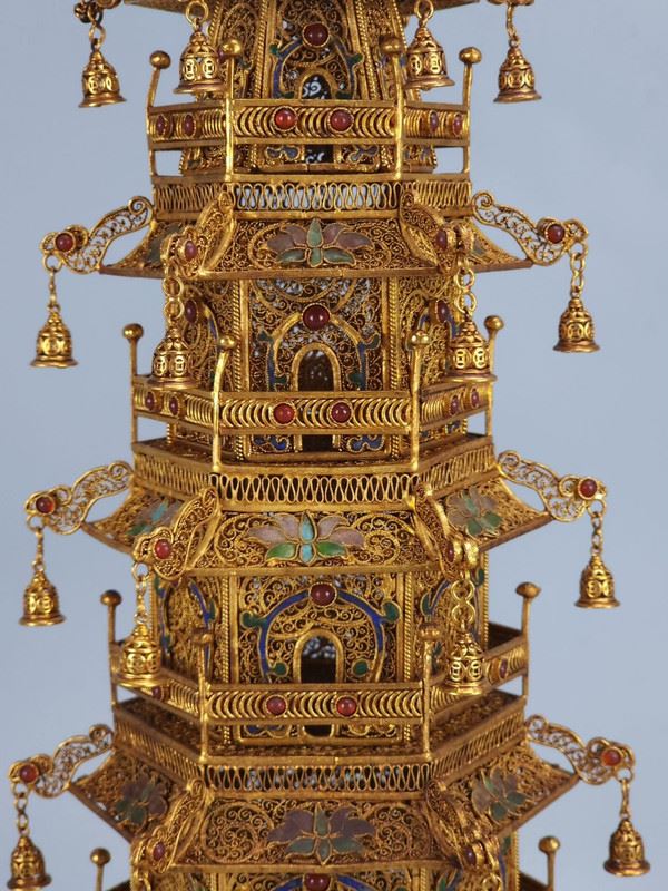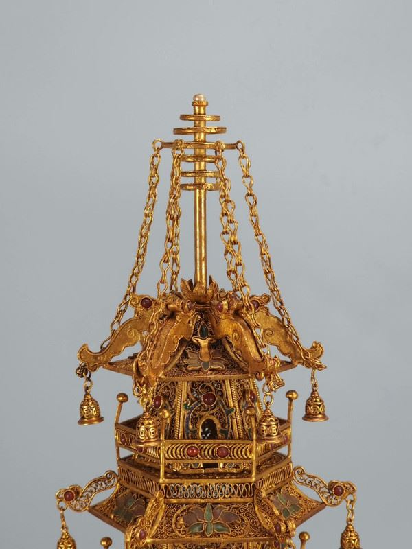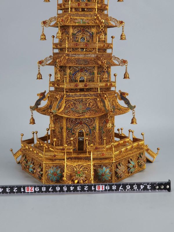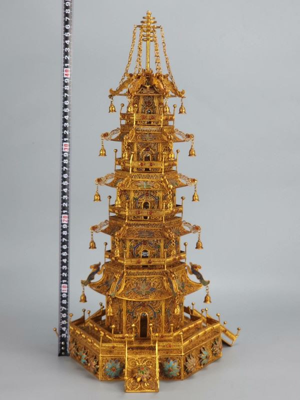 This gilded copper filigree pagoda showcases the grandeur and exquisite craftsmanship of Qing Dynasty court art. The pagoda is made from copper and meticulously gilded, giving it a brilliant shine. Each level of the pagoda is adorned with intricate filigree and gemstones, rich in detail and full of delicate decorations and complex structure. The small bells hanging from the top add movement and depth to the piece. This artwork not only reflects the perfect fusion of traditional goldwork and jewelry craftsmanship but also embodies the opulence and nobility of imperial art, making it a highly collectible masterpiece.