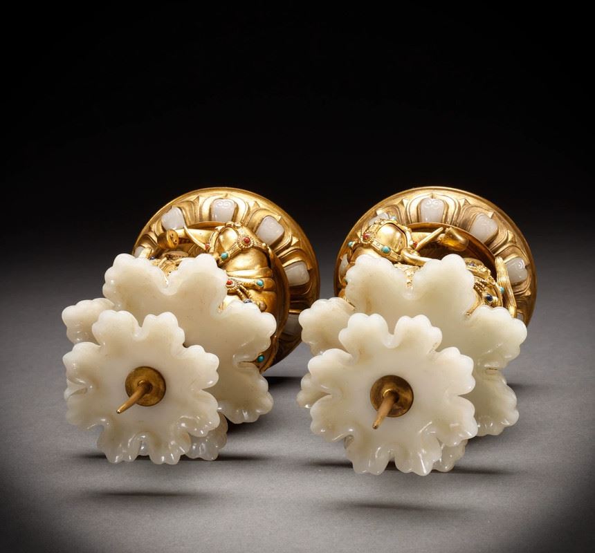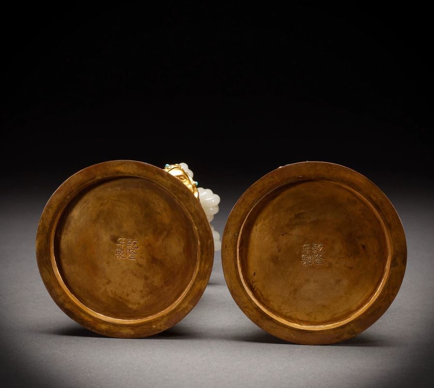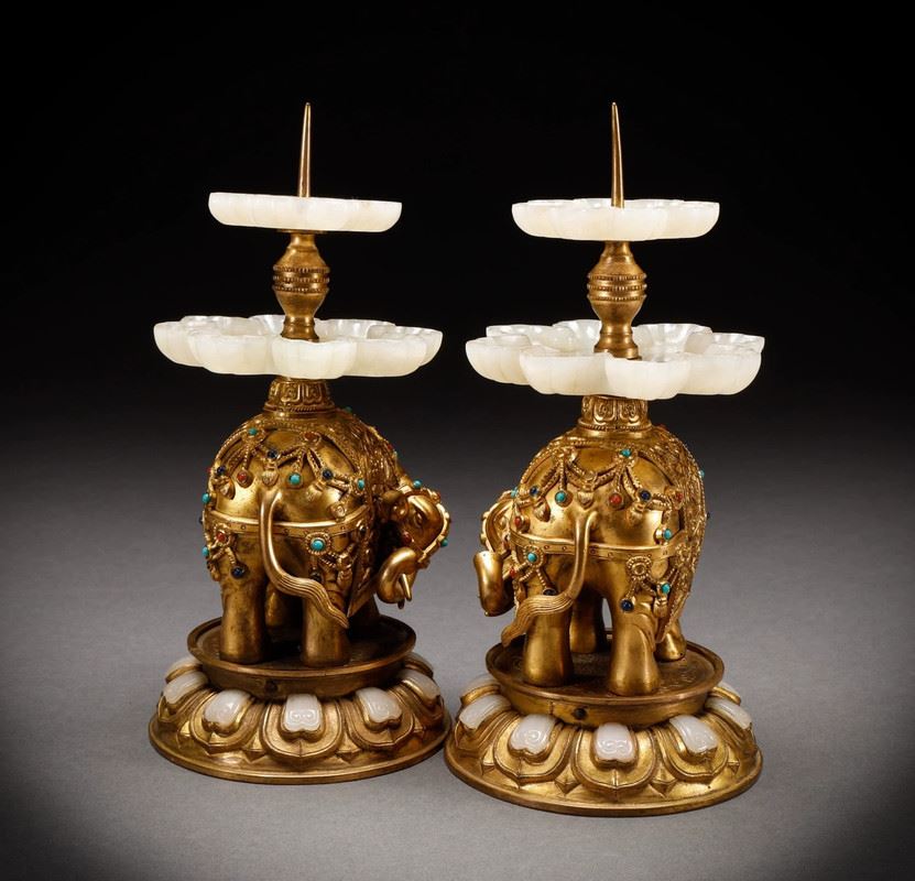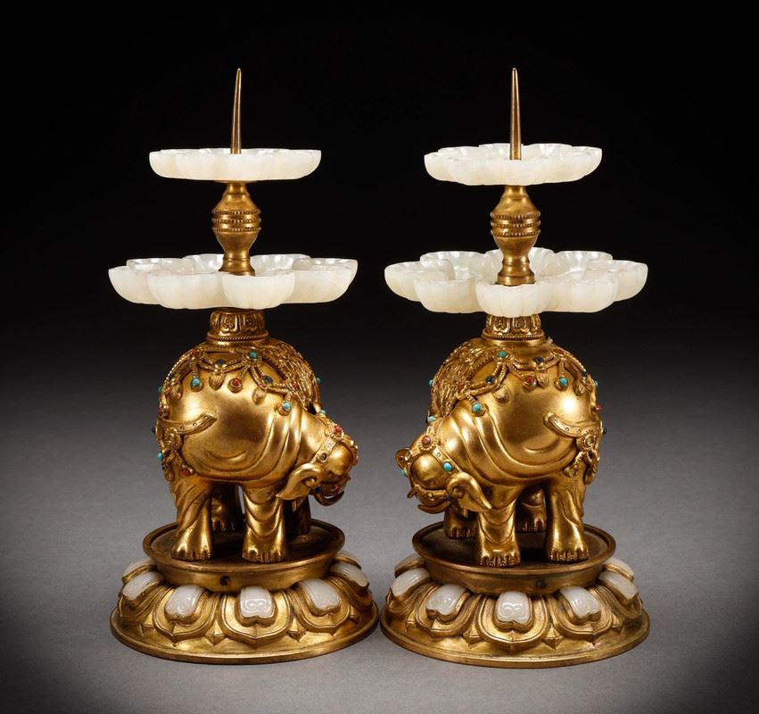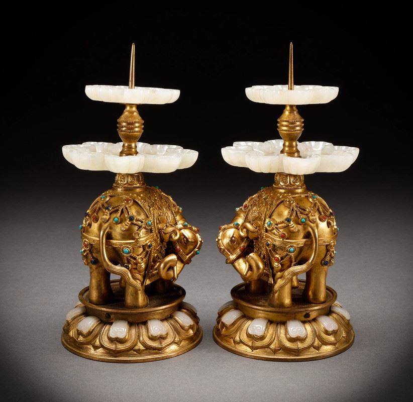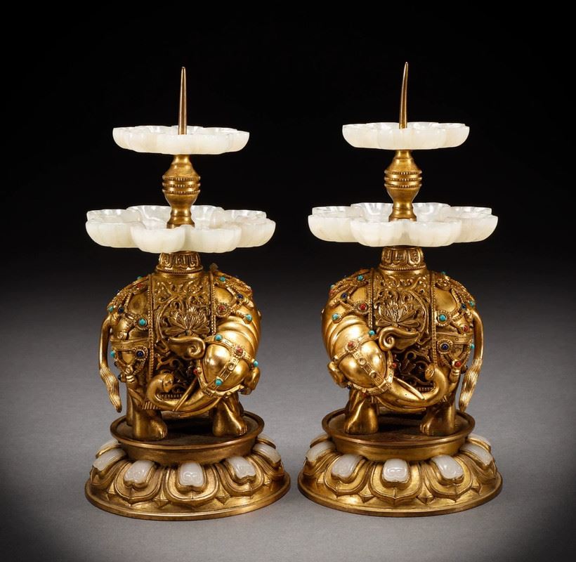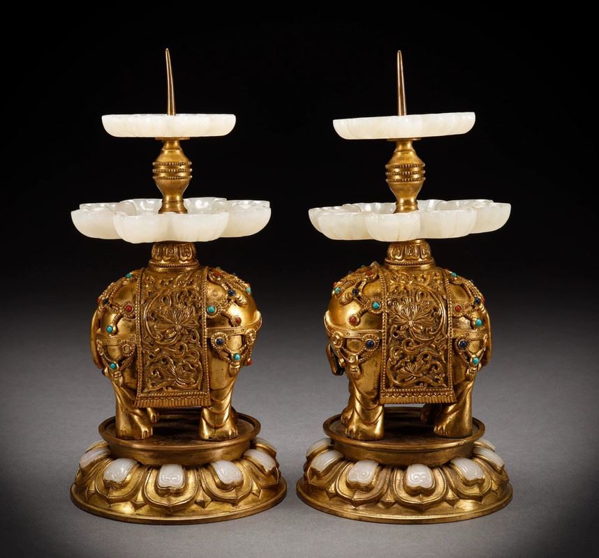 This pair of gilded copper inlaid gemstone Hetian jade elephant candleholders is meticulously crafted, showcasing the extraordinary charm of Qing Dynasty court craftsmanship. The base of the candleholders is made from fine copper, gilded to add a luxurious touch. The elephant design symbolizes strength and good fortune, with Hetian jade and gemstones intricately inlaid, presenting vibrant colors and vividly reflecting traditional art’s refinement and elegance. Each candleholder is adorned with a beautiful jade tray, combining functionality with artistry, making it a highly collectible piece of craftsmanship.