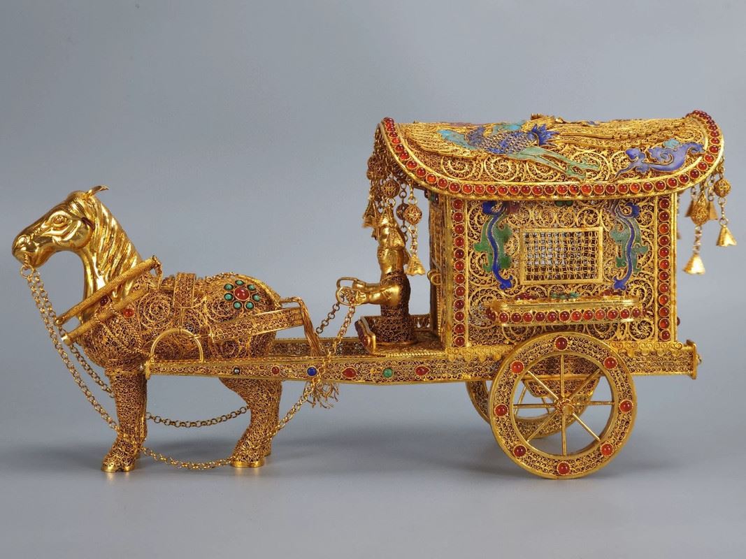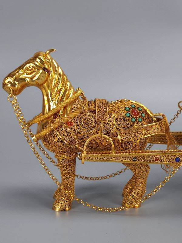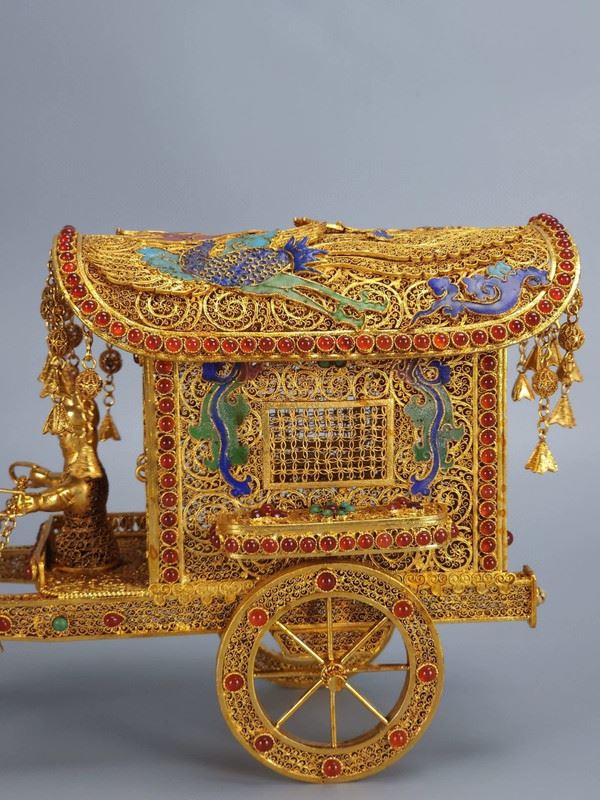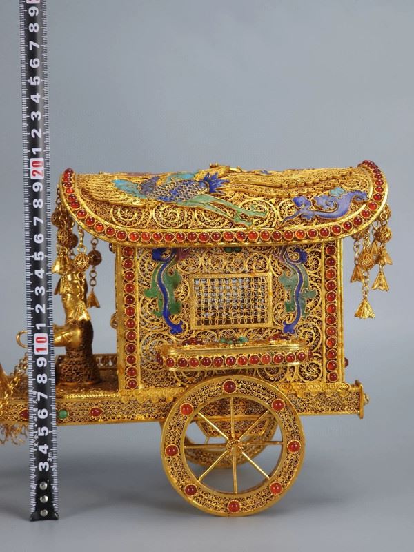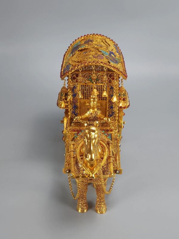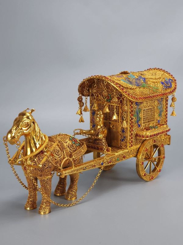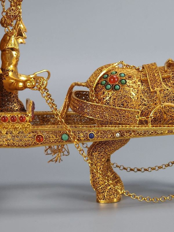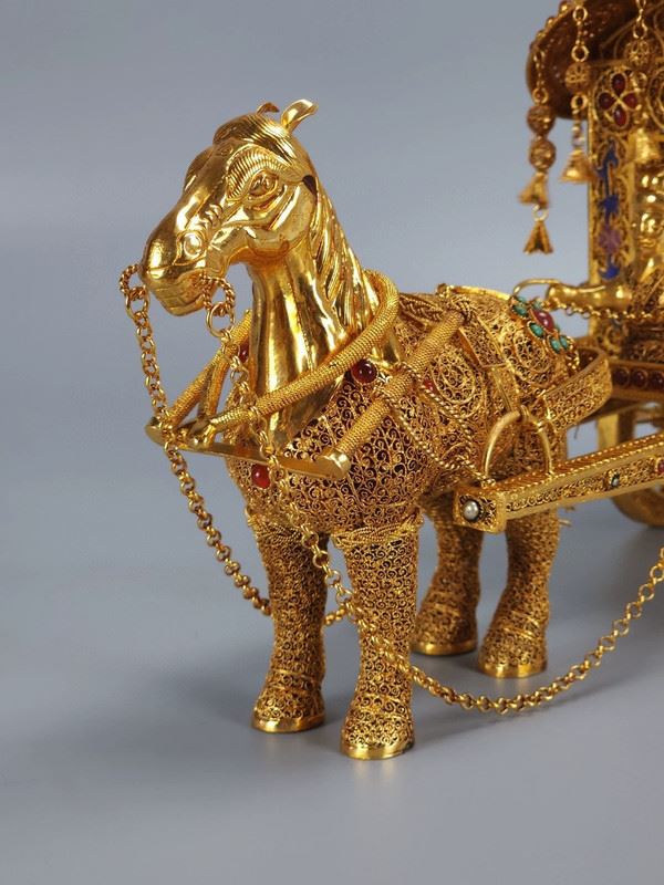 This gilded gold filigree chariot with horse showcases the unique charm of Qing Dynasty court art through its exquisite craftsmanship and luxurious design. Every detail of the chariot, from the finely carved horse to the embellished carriage, reflects a high level of craftsmanship. The intricately carved figures inside the carriage and the delicate gemstone inlays further enhance the value of this artwork. The entire piece represents the perfect combination of traditional goldwork and jewelry craftsmanship, exuding the opulence of ancient nobility and making it a highly collectible imperial art treasure.