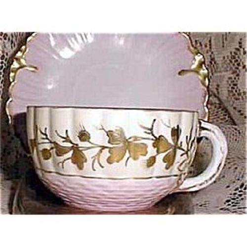 Presenting an exquisite beauty produced by Laviolette Limoges porcelain cup and saucer. Laviolette did superb artistry in the latter part of the 1890's through the turn-of-the-century.<BR><BR>The set is painted in a delicate pink tint with a hint of Lavender and lavishly enhanced with burnished gold. Deeply fluted Lotus flower and petal mold pattern and is of the finest quality porcelain, intricate in sculpted relief detail. The mold detail is quite lovely and gives one the impression of an open floating Lotus, providing the proper framework to accentuate the skilled hand painting. <BR><BR>I am happy to report this lovely has survived in excellent condition. There is no damage to the porcelain, likewise the gilding is in a near perfect state, with very minor gold wear on the handle. A wide gilded band of leaf and thistle on creamy white porcelain compliments the outer cup area.<BR><BR>This stunning set will find favor in the finest cup and saucer collection. Carries the Laviolette mark used from 1896 through 1906. Mold is shown in Mary Frank Gaston's Third Edition, Plate 728, page 286.<BR><BR>