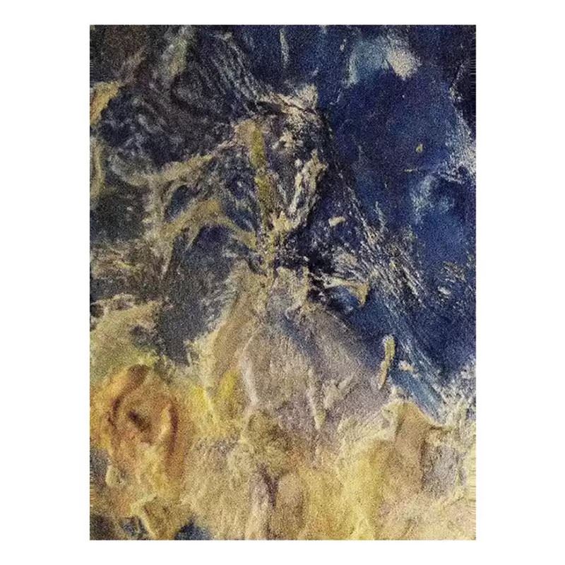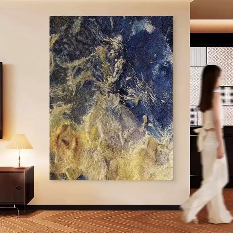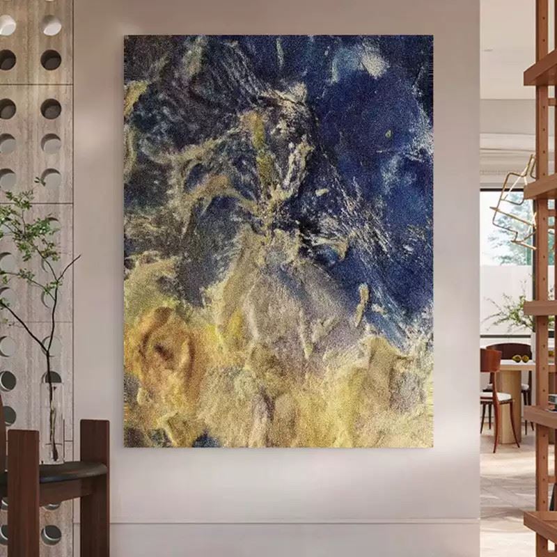 This artwork creates a mystical mirage through the fusion of deep blues and gold. The shimmering gold intertwines with the soft blue, almost telling an untold story. The clash of colors and textures in the piece reveals a sense of motion and depth, as if flowing golden powder spills from the canvas, creating a dreamlike effect. Each stroke conveys a unique artistic charm, filled with visual impact while sparking the viewer’s imagination, as if one is immersed in a fantastical realm. Dimensions: 24 x 31 inches.