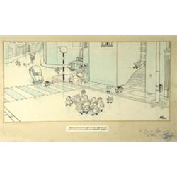 Giles- Original watercolour 'My Dad won't like this merger he's got a page from my horror comic and I've got the racing page from his paper' personally signed to Jack Vemar from Giles, 25cm x 53cm