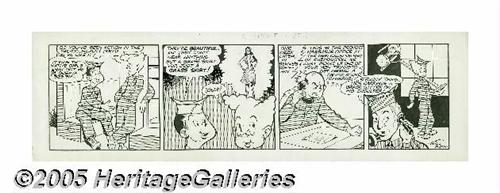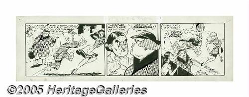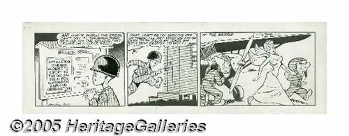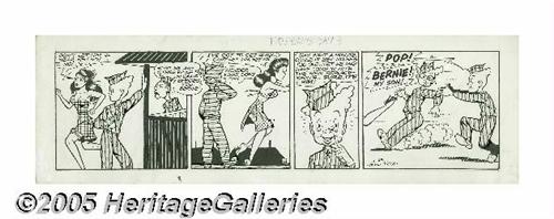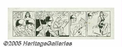 <B>Gill Fox - Bernie Blood Daily Comic Strip Original Art, Group of 5 (Stars and Stripes, undated, circa 1940s).</B></I> Sex and the military would not seem to be easy bedfellows, but Private (later Corporal) Gill Fox managed to work a smokin' babe into just about every installment of <I>Bernie Blood</B></I> for <B>Stars and Stripes</B></I>. Most likely the G.I.s appreciated his efforts. These five strips feature not only that unflappable cad Bernie, but also his equally amorous pop, who is seen chasing after a lovely gal with a butterfly net in one strip. Amazingly, there's also a topless gal in one strip; apparently the censorship standards at <B>S&S</B></I> were a lot laxer than in mainstream America! The image area measures 21" x 5.5" and the art is in Excellent condition, with moderate overall aging. <I>From the collection of Gill Fox.</B></I>