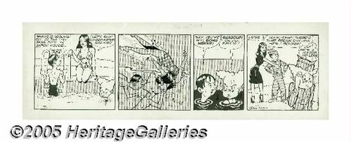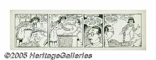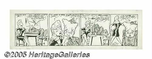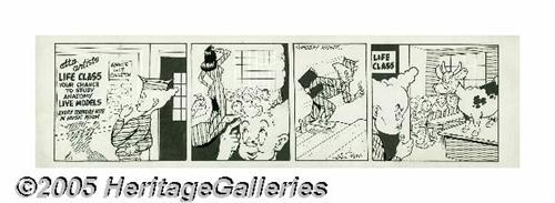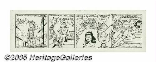 <B>Gill Fox - Bernie Blood Daily Comic Strips Original Art, Group of 5 (Stars and Stripes, undated, circa 1940s).</B></I> Private Gill Fox (later promoted to Corporal!), H.Q. 63rd Division, drew these babe-filled dalies for <B>Stars and Stripes</B></I>, featuring the misadventures of bumbling private Bernie Blood. Maybe the reason that some curvy gal appears in every strip is that Fox was exceptionally good at drawing them, and maybe it was because the G.I.s demanded it, but either way, the real benefactor is the winner of this lot, who will be the proud owner of some of the best good-girl art ever produced. The image area on the strips measures 21" x 6", and the art is in Very Good condition, with moderate aging and some creasing at the corners. A cornucopia of good-girl art, yours for the taking! <I>From the collection of Gill Fox.</B></I>