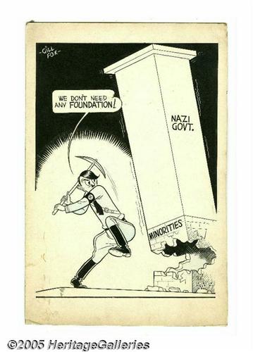 <B>Gill Fox - Editorial Cartoon Original Art (circa 1942).</B></I> The supremely talented Gill Fox was a master of many media -- comic books, comic strips, illustrations, and editorial cartoons. With unlimited versatility, Fox penciled, inked, and sometimes toned his masterpieces on coquille board, in an effort to extract every ounce of emotion from whatever subject fell between the crosshairs of his astute wit. This cartoon, featuring "Der Fuhrer" himself, has an image area of 9" x 12.5". There are some small stains along the left bottom edge, otherwise the work is in Excellent condition. <I>From the collection of Gill Fox</B></I>.