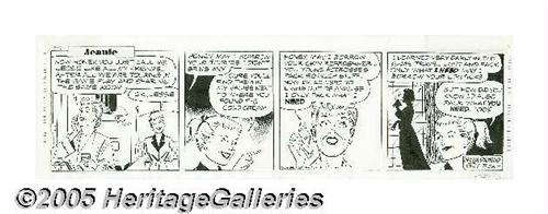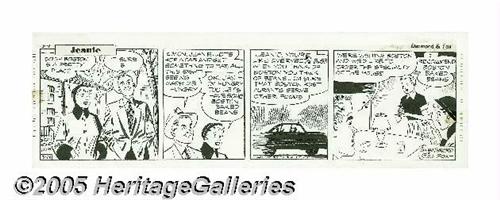 <B>Gill Fox - Jeanie Daily Comic Strip Original Art, Group of 5 (New York Herald Tribune, 1953).</B></I> Jeanie visits historic Boston while on her road tour, and gets a new roommate named Jessie. The trials and tribulations of an aspiring actress were well-travelled in this charming strip by Diamond and Fox. These five consecutive dailies are dated 3-16 through 3-20-53. The art is in Excellent condition with minor overall aging. The image area of each strip measures 16" x 4.5". <I>From the collection of Gill Fox.</B></I>