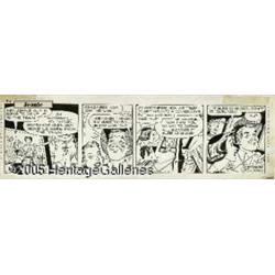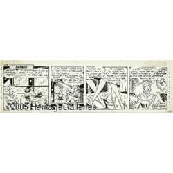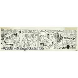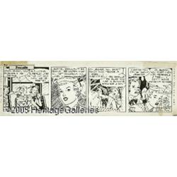 <B>Gill Fox - Jeanie Daily Comic Strips Original Art, Group of 5 (New York Herald Tribune, 1952).</B></I> There's romance in the air! Writer Selma Diamond brings a decidedly feminine approach to these five <I>Jeanie</B></I> comic strips from 1952. Jeanie and her friend, Susan, return to New York City from the country, leaving behind summer romance in anticipation of fall, winter and spring romance! These warm and lively strips are drawn by Gill Fox, who certainly knows a few things about the art of lovely ladies. This lot has five consecutive dailies dating from 9-2 to 9-6-52. The image area of each daily is 16.25" x 4.25", and aside from a slight stain in the last panel of the 9-4 strip, they are all in Excellent condition. <I>From the collection of Gill Fox.</B></I>