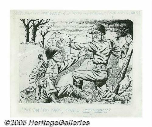 <B>Gill Fox - Stars and Stripes Comic Strip Original Art, dated 5-8-45 (Stars and Stripes, 1945).</B></I> Two G.I.s learn the meaning of VE-Day in this triumphant cartoon by Gill Fox, celebrating the end of the war. "Put that pin back Joe... <I>it's over!!</B></I>" Probably the most important illustration in Fox's run of material for <B>Stars and Stripes</B></I>, this wonderful piece features his usual slick ink work, augmented by crayon on pebble board. A real gem for any collector of WWII material, this is a true piece of history. The image area measures 12" x 9" and is in Very Good condition with some creasing in the lower right corner, and overall aging. <I>From the collection of Gill Fox</B></I>.