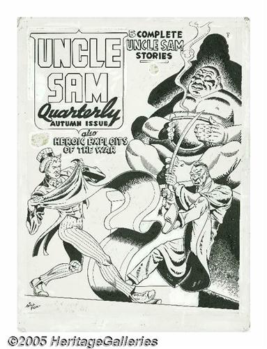 <B>Gill Fox - Uncle Sam Quarterly #4 Cover Original Art (Quality, 1942).</B></I> The living embodiment of the American ideal, Uncle Sam, was <B>National Comics</B></I>'s lead feature from his debut in issue #1, until he made his final Golden Age appearance in issue #45. The red, white, and blue clad hero also appeared in his own title, <B>Uncle Sam Quarterly</B></I>, which ran eight issues between 1941 and 1943. Here, from the cover of his fourth issue, Sam pulls the rug out from under "The Mongrol Man," a poke at Emperor Hirohito, by Gill Fox. The image area measures 13.5" x 18.5", and although the paper exhibits a bit of aging, and there are several glue stains from missing paste-ups, the art is in Very Good condition. <I>From the collection of Gill Fox</B></I>.