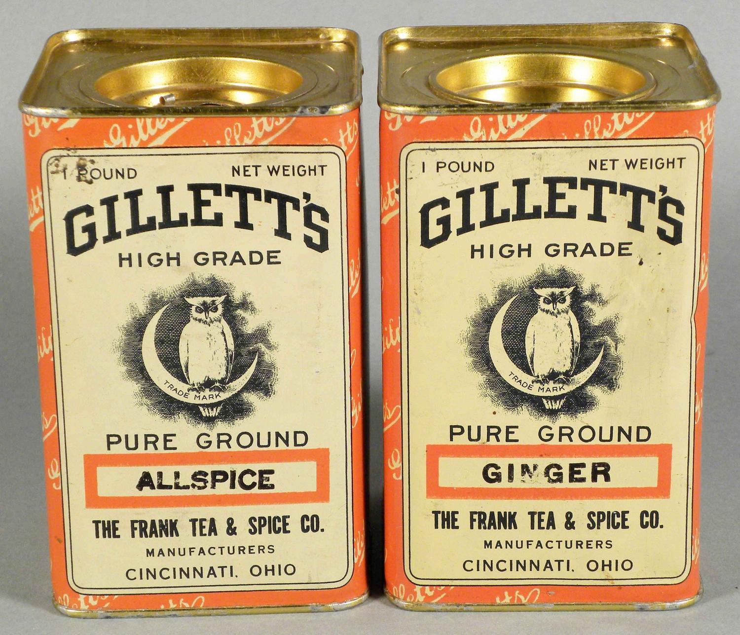 Gillett's High Grade 1# Spice Tins. All Spice & Ginger. The Frank Tea & Spice Co., Cincinnati, Ohio. Minor dents in ginger tin and minor rubs, both in excellent condition. Starting bid $30