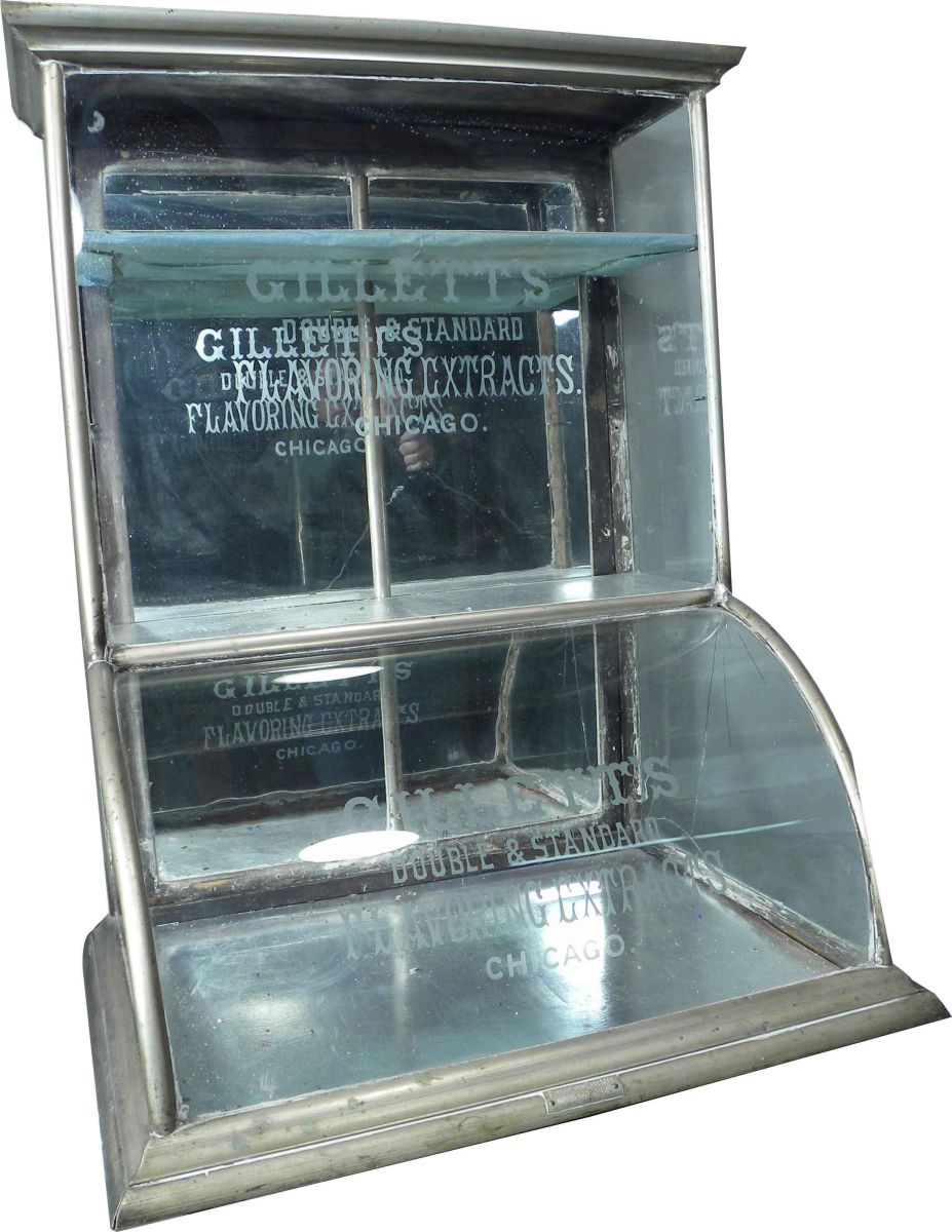 Gillett's Single Tower Nickel Showcase. Gillett's Flavoring Extracts, Chicago. Eureka Showcase Mfg. Monk & Co. Proprietors, Chicago. Two broken flat glass panels otherwise good original condition. 27 1/2 X 35 1/2 X 20 1/2 inches.
