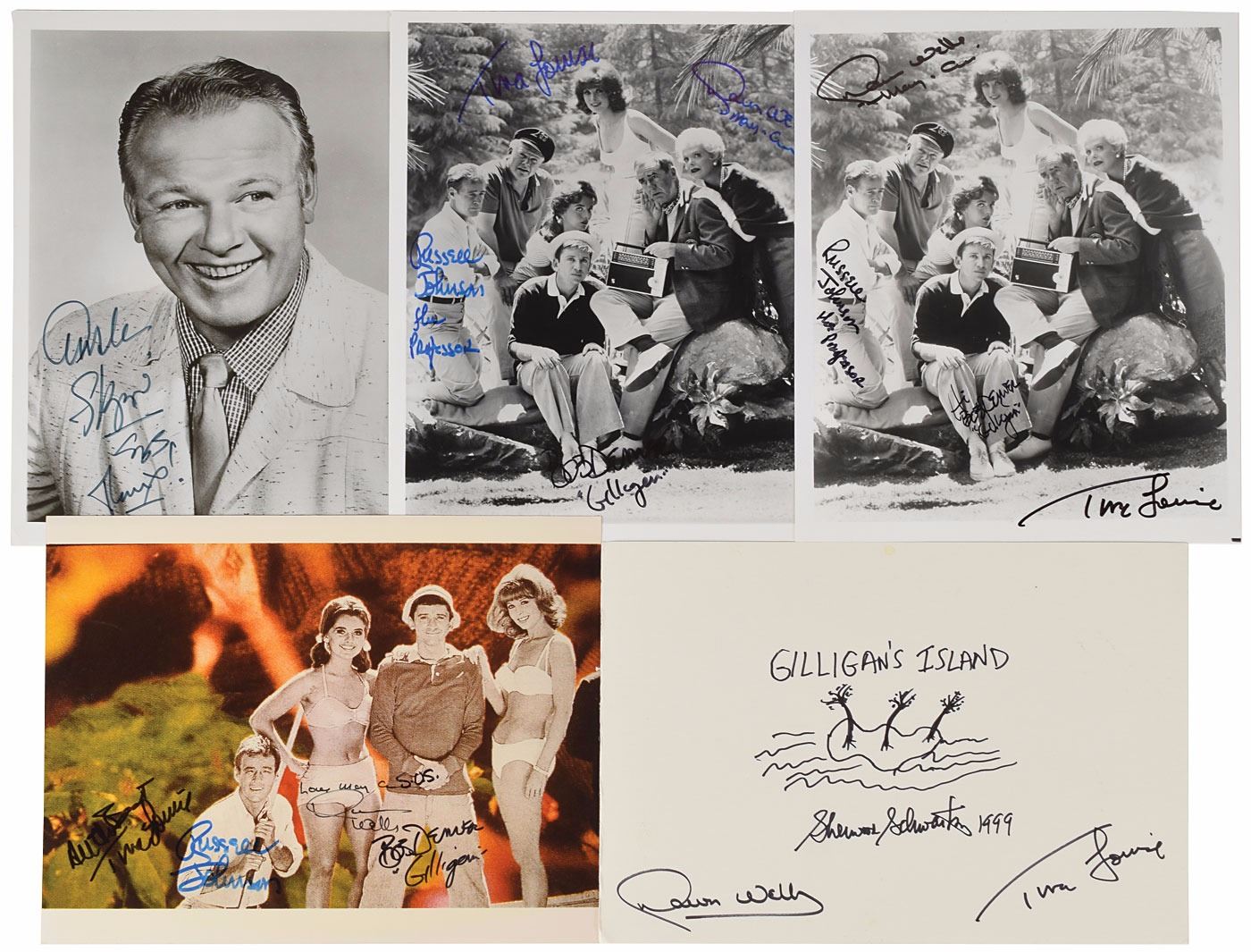 Five items: a color glossy 10 x 8 photo of four actors from Gilligan's Island, signed in felt tip by Bob Denver, Russell Johnson, Tina Louise, and Dawn Wells; a glossy 8 x 10 photo of Alan Hale Jr., who has signed in black felt tip; two glossy 8 x 10 photos of the show's cast, both signed in felt tip by Denver, Johnson, Louise, and Wells; and an original felt tip sketch of a remote island by show creator Sherwood Schwartz, who adds "Gilligan's Island" above, and signs his name below. Also signed in the lower corners by Wells and Louise. In overall fine condition.