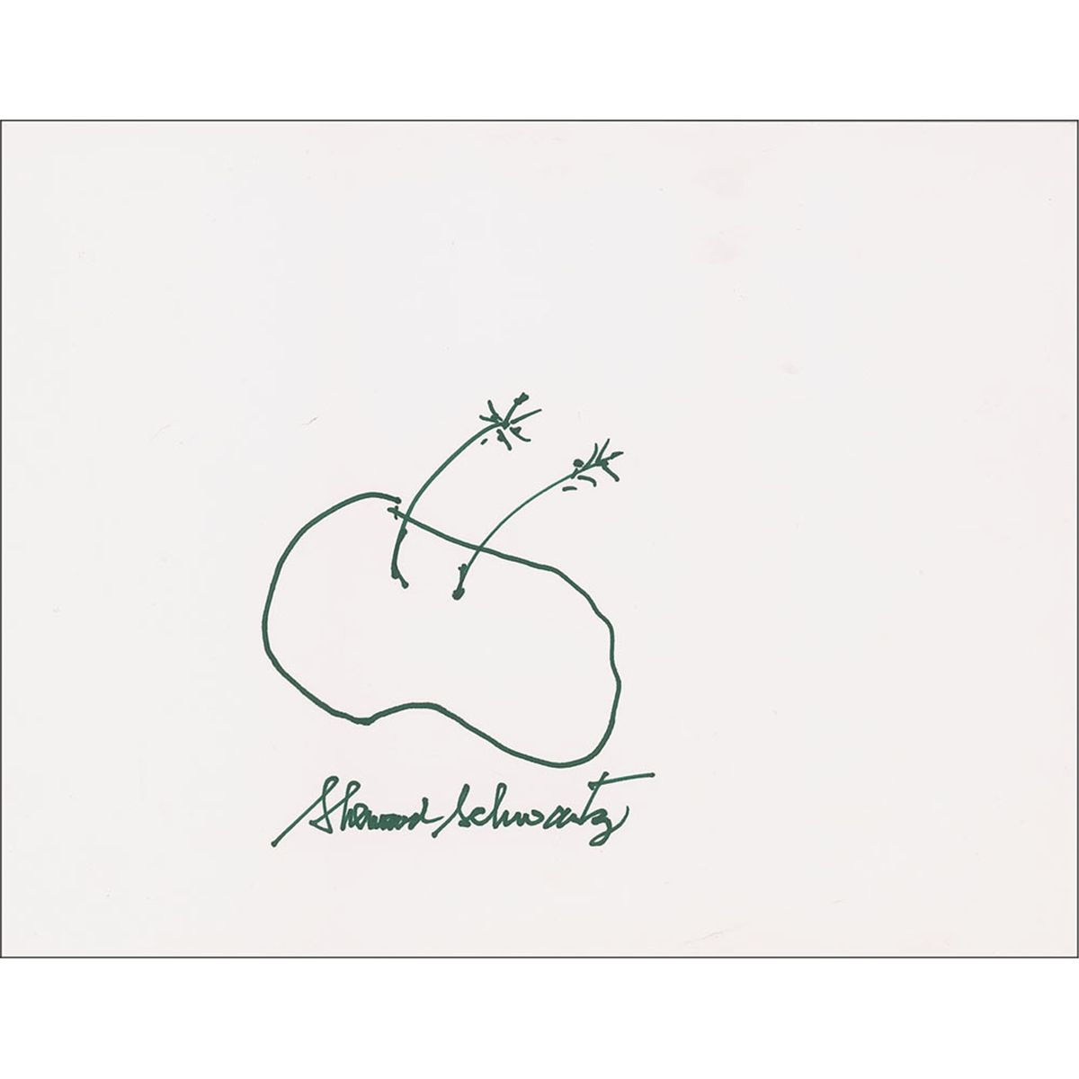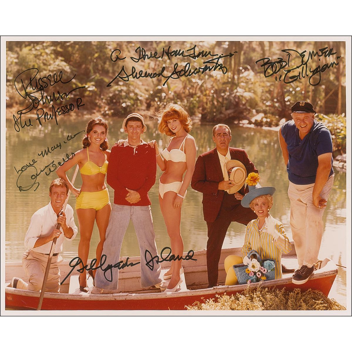 Two items: satin-finish 10 x 8 photo of the castaways, signed in black felt tip by Russell Johnson, Dawn Wells, Sherwood Schwartz, and Bob Denver; and an original green felt tip sketch of an uncharted desert isle on an 11 x 8.5 card done by creator Sherwood Schwartz. In fine condition.