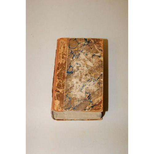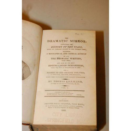 Gilliland, Thomas. The Dramatic Mirror: Containing the History of the Stage, From the Earliest Period to the Present Time; Including a Biographical and Critical Account of All the Dramatic Writers..... 2 Volumes in 1. London: Printed for C. Chapple, 1808. First Edition. 12mo - over 6¾" - 7¾" tall. Hard Cover. Ex-Library. Good Condition. 17 engraved plates as called for. Frontis, xii, 1048pp, bound in 3/4 leather & marbled paper, gilt decorated spine, marbled page edges, marbled endpapers. Covers rubbed, edge/corner wear, lacks 1/3 of backstrip, hinges taped, binding tight.