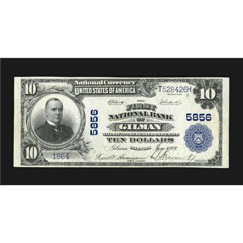 <B>Gilman, IL</B></I> - $10 1902 Plain Back Fr. 633 <B>The First NB</B></I> Ch. # 5856<BR>A lovely example with everything one could want in a National, including bank rarity, full originality, blazing fresh colors, and bold pen signatures of Marie W. Hausmann, Asst. Cashier. <B>Gem Crisp Uncirculated.</B></I><BR><I>From The Lincoln Collection</B></I><BR><BR><b>Shipping:</b> Coins & Currency (<a target="_blank" href="http://www.heritageauctions.com/common/shipping.php">view shipping information</a>)
