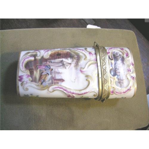 We offer a magnificent porcelain etui dating from the second half of the 18th century. It is a pure white hald paste porcelain. IOn one side there are paintings of a harbour with several figures, surrounded by pink and gold scrolls . It should be indicated taht the porcelain is shaped to take these scrolls.On the other side there is a couple on the banks of a lake or fiord and above a thatched cottage on a bank. Either end is decoated in a mauve coloured paintyings. In one case there is village and shore with a sailing vessel, whereas on the other end is a shore scene with two women walking.
