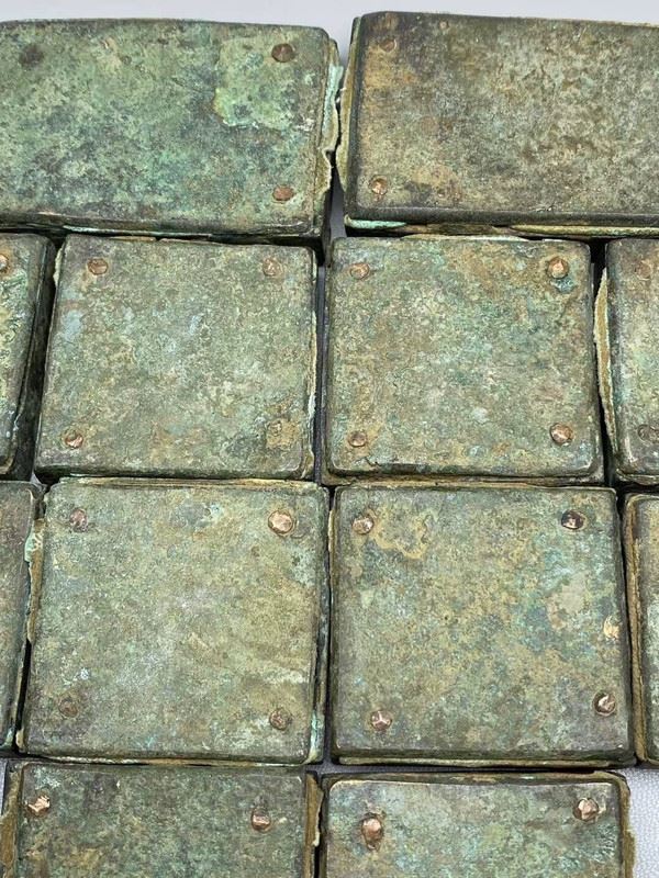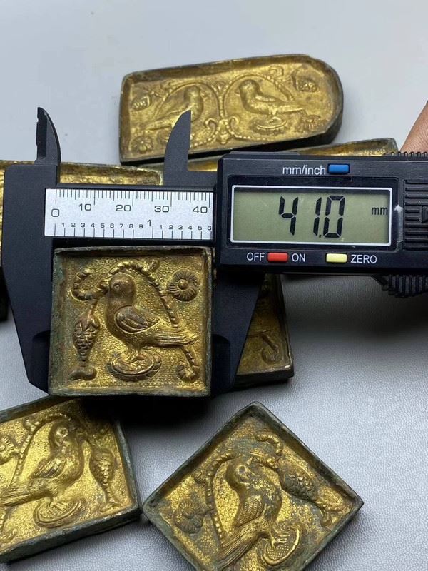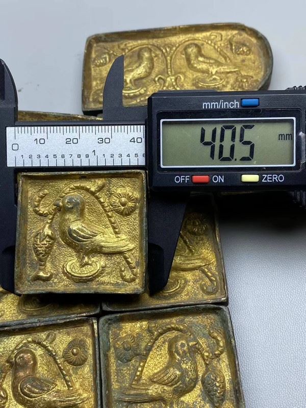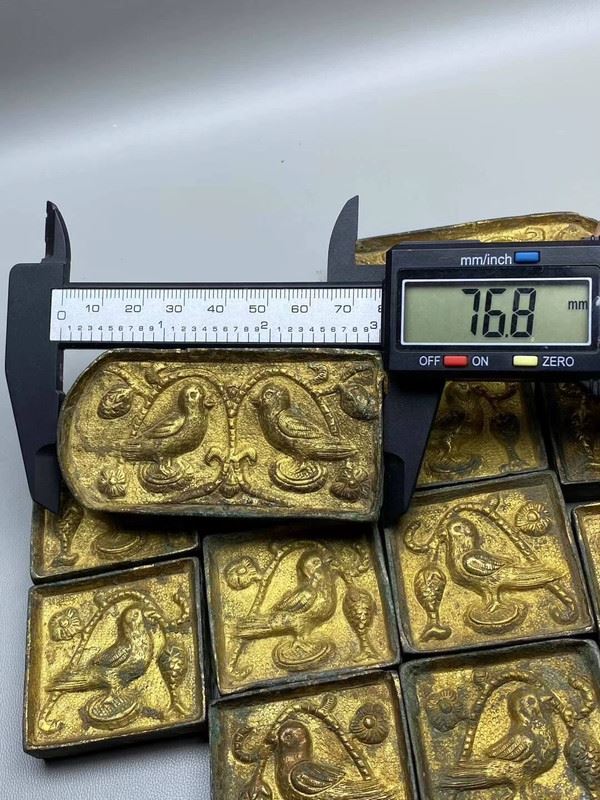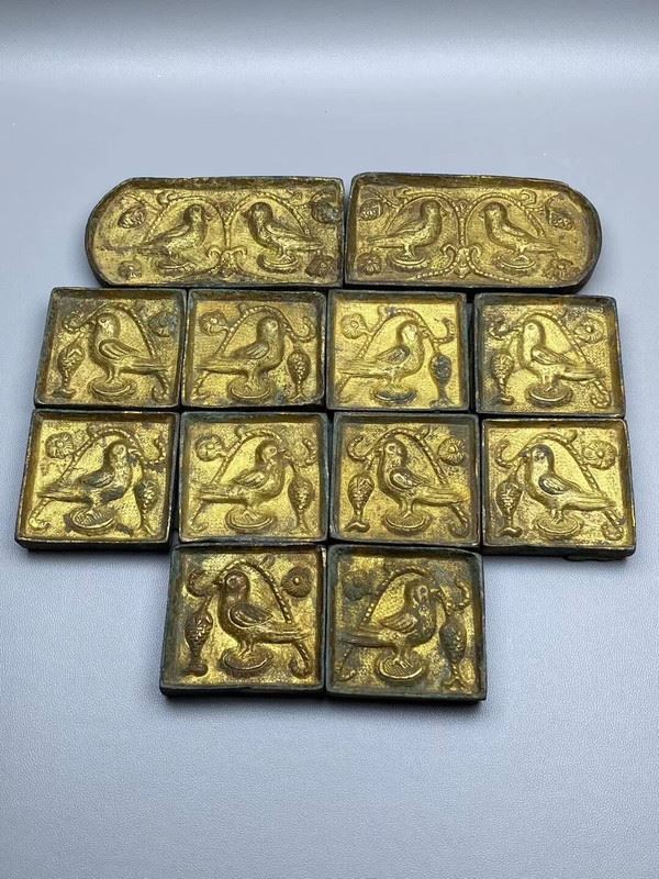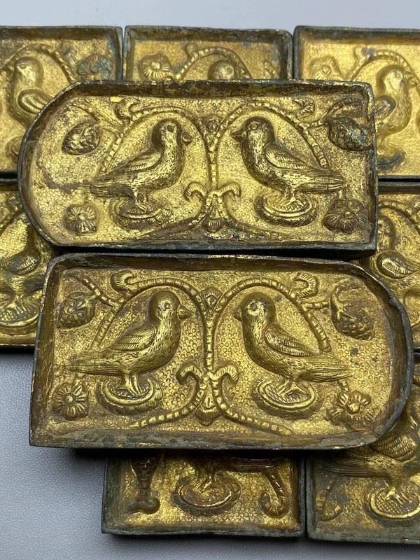 This set of plaques is crafted in metal with a gilt surface, each featuring a lively bird perched among floral and fruit motifs. The design symbolizes prosperity and good fortune, with the golden highlights contrasting against the darker base. Such decorative plaques were often used in religious objects, architectural embellishments, or furniture inlays, combining aesthetic appeal with symbolic meaning.