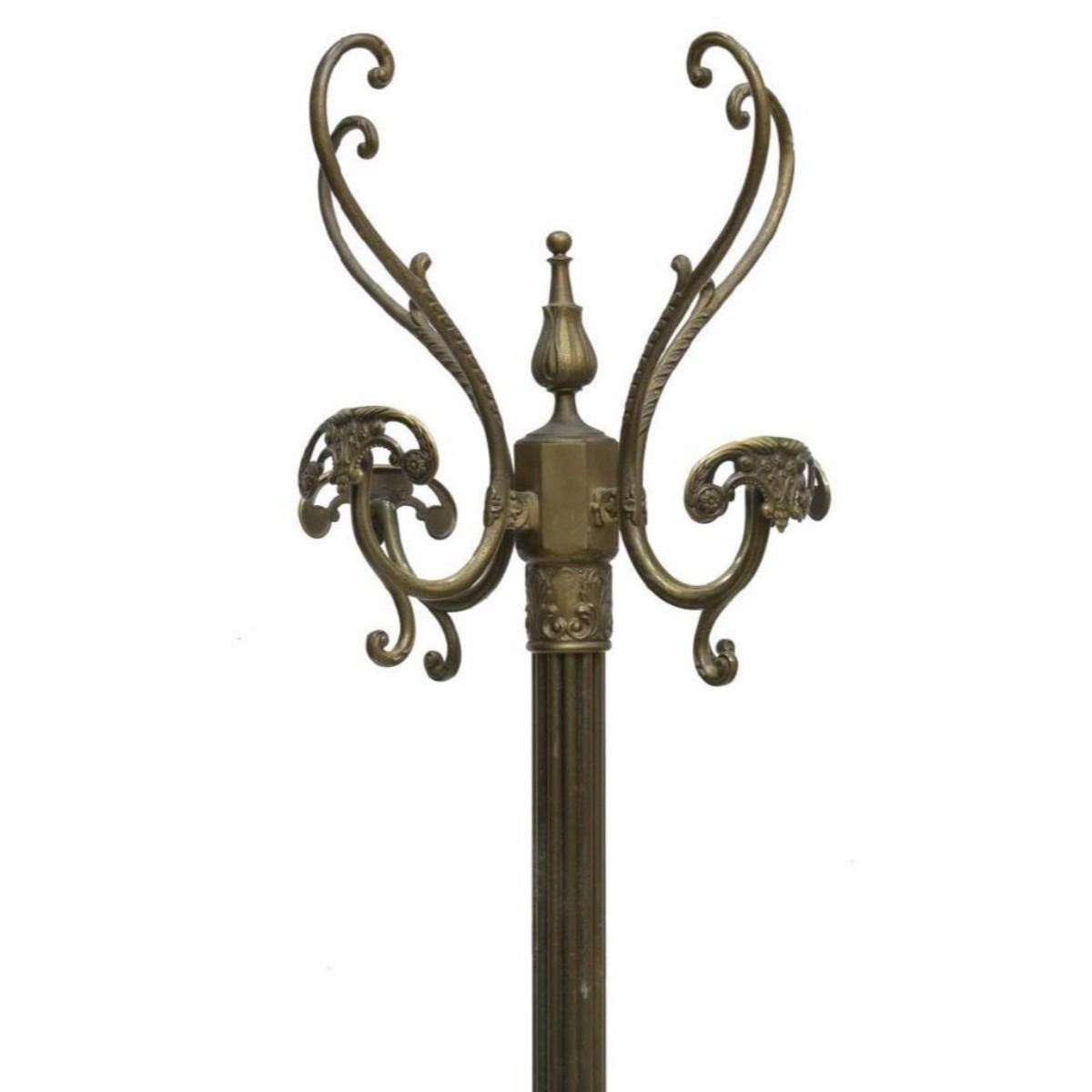 Gilt brass standing hall tree, having vasiform finial, issuing four arms, ending in hat and coat hooks, fluted standard, having acanthus leaf accents, rising on tripartite base, approx 73.75"h, 19.75"w, 18"d