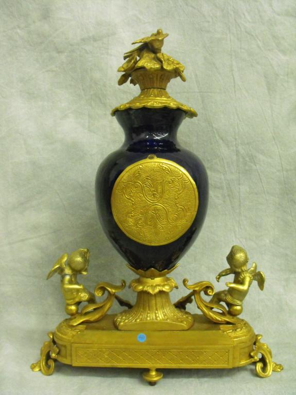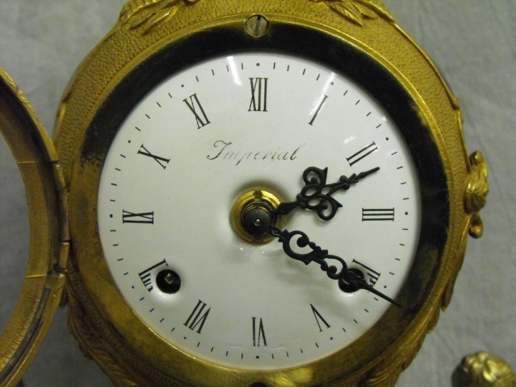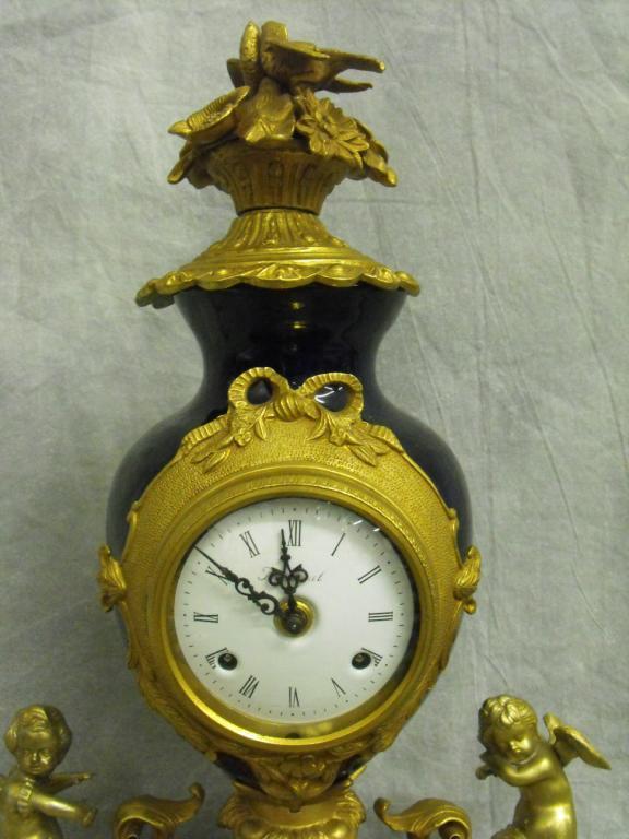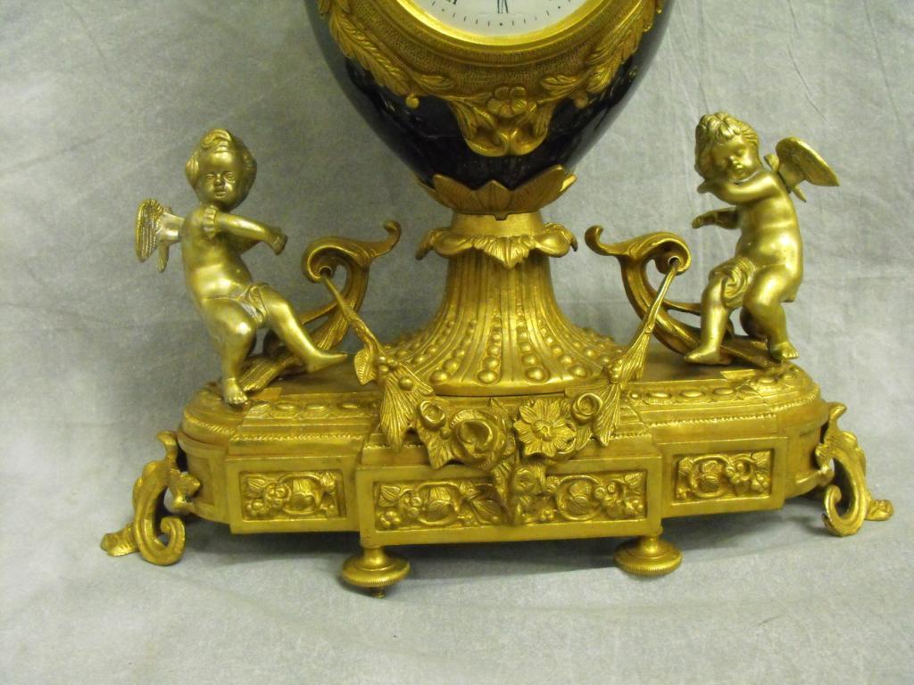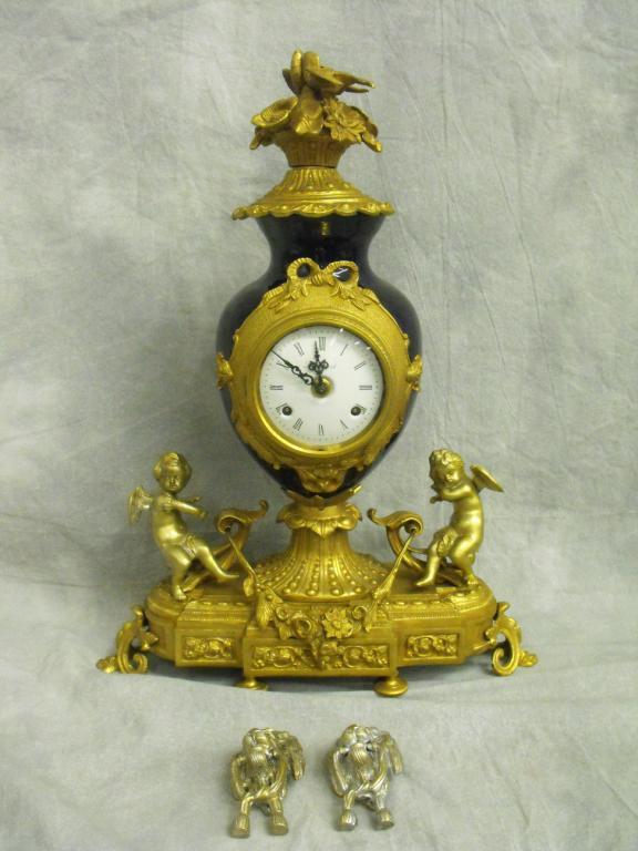 Louis Napoleon Style gilt bronze figural clock with 8 day hour and half hour bim bam strike. Clock door opening onto white metal face with Roman numerals, side of base has pair of bronze cheriubs. Also has cast bronze lion head handles