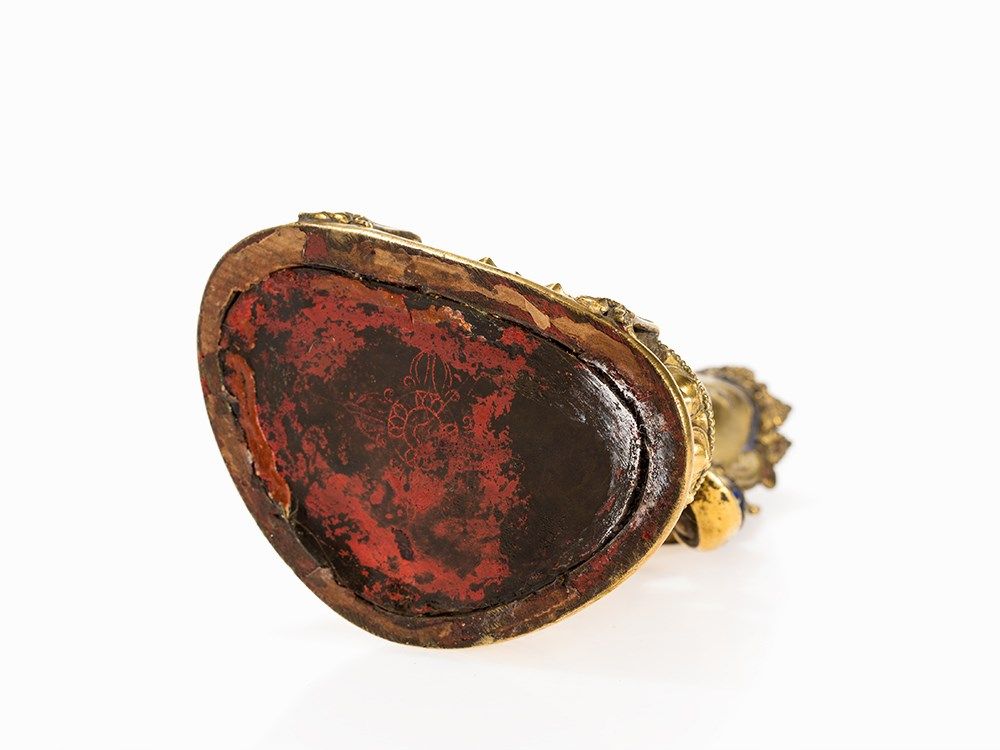 The Buddha Amitayus is also known as the Buddha of ‘Boundless Life’ and is an emanation of Amitabha. His body is covered with precious jewelry. The hands are meditative folded in his lap and a vase-like vessel, which is filled with Ambroisa, can be found therein.