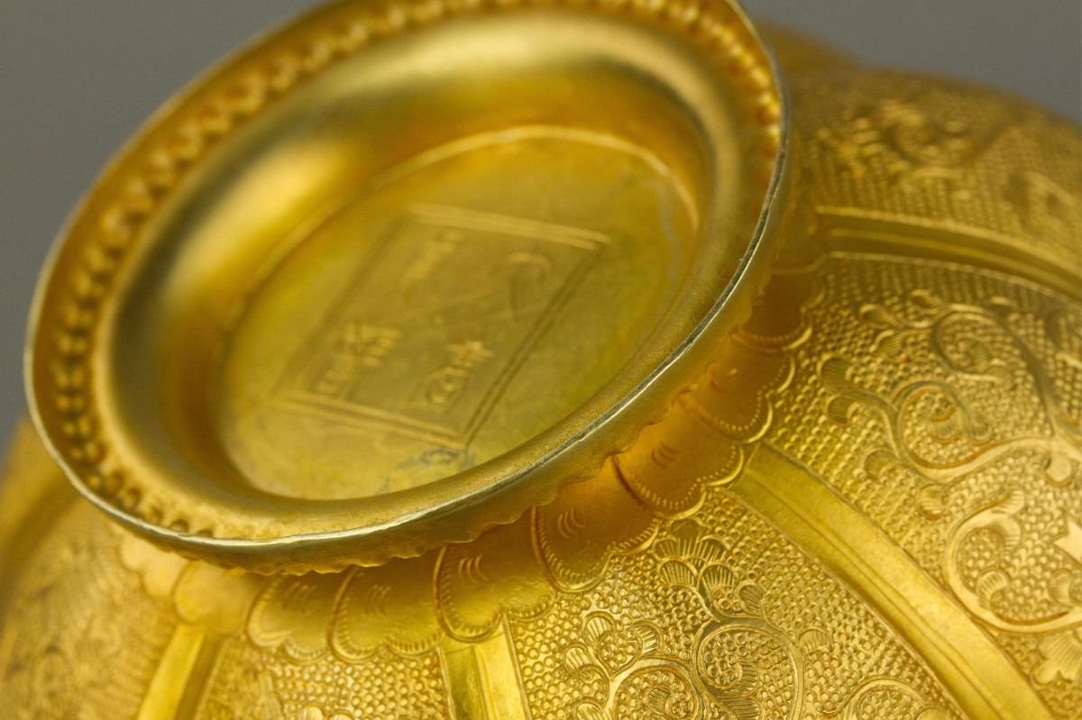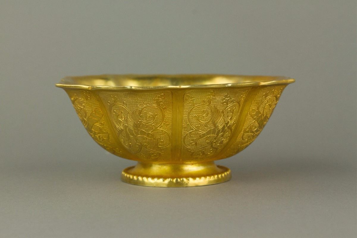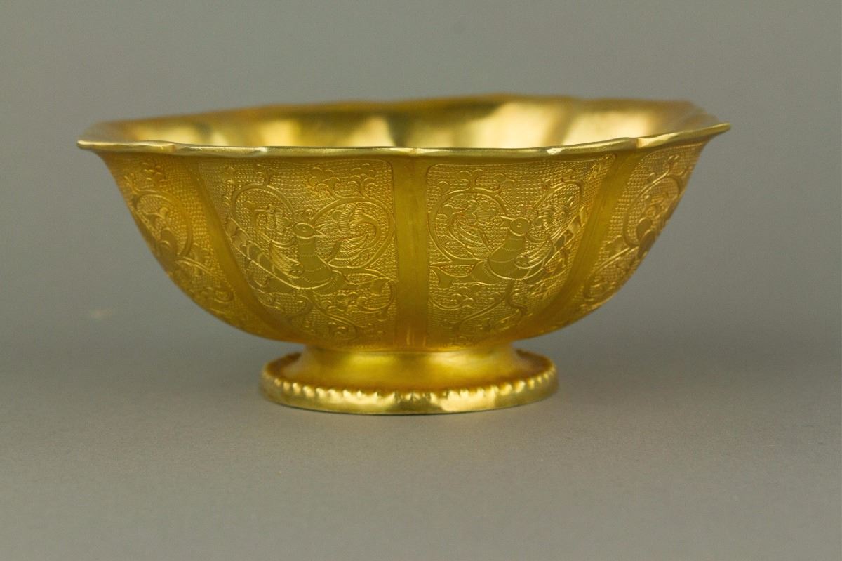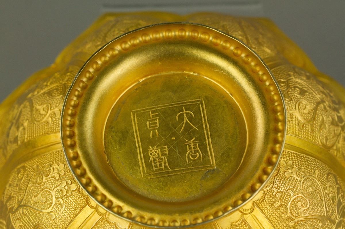 Chinese gilt bronze cast bowl; of eight-lobed sides with everted rim; carved with panels enclosing phoenix emblems; four-character Zhenguan mark on base; H: 5 cm, D: 12.5 cm, 288 grams