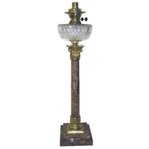 This exceptional antique oil lamp in Greek classical style has its original hardware and features a gilded bronze Corinthian capital, variegated red marble shaft and stepped pedestal marble base with additional gilt bronze mount. Recently cleaned and wired for use. "Palmer" control knobs. Measures 31.5" high and 7.5" wide and deep. Weighs an estimated 20-30 lbs. This is one of three exceptional antique oil lamps we currently have for sale. This item resides on the upper east side of Manhattan in New York city, and may be seen in person by appointment. Thanks for visiting. Please let us know if you have any questions or comments.