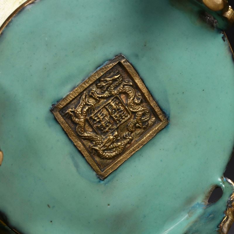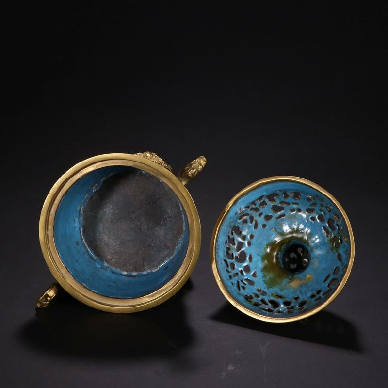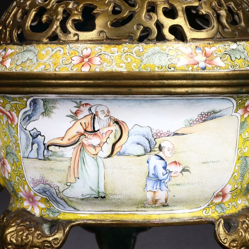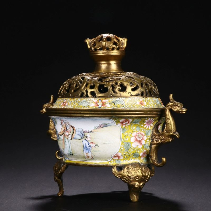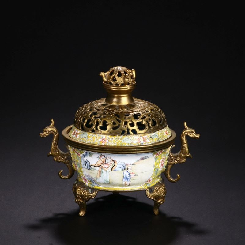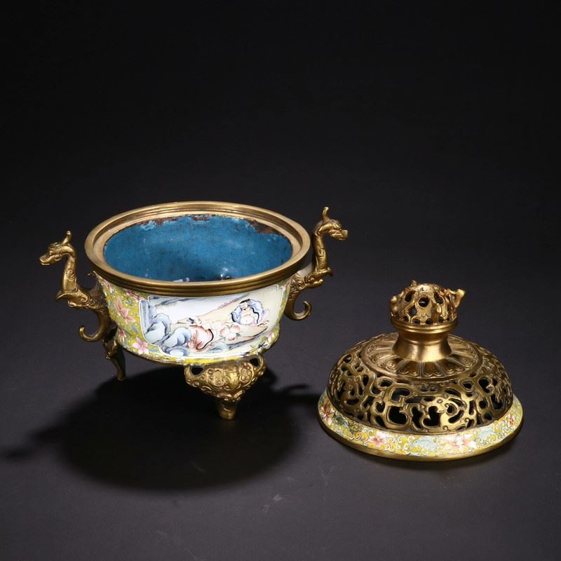 This censer is crafted on a copper body with painted enamel decoration, depicting figural scenes and floral motifs in vivid colors. The gilt twin dragon handles are lively and majestic, while the three-legged base ensures a stately presence. The openwork gilt cover adds elegance, combining both practical and ornamental value.