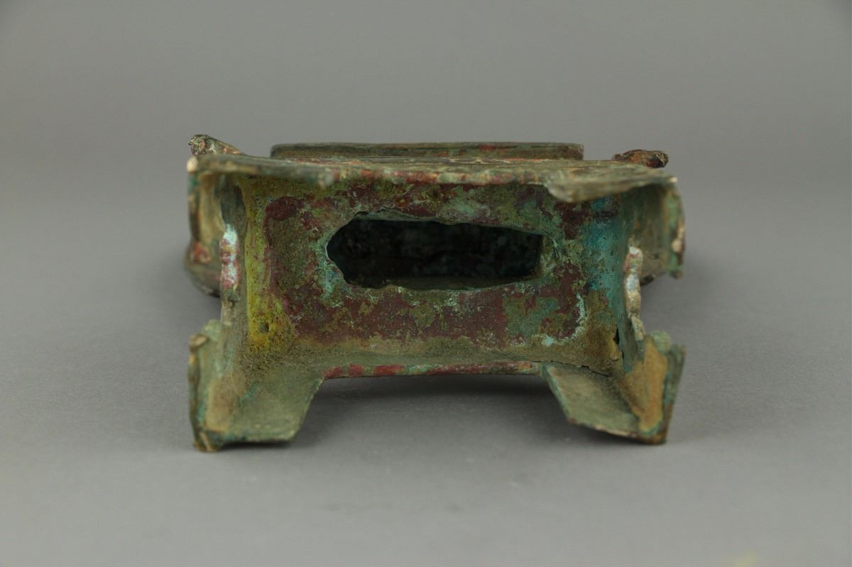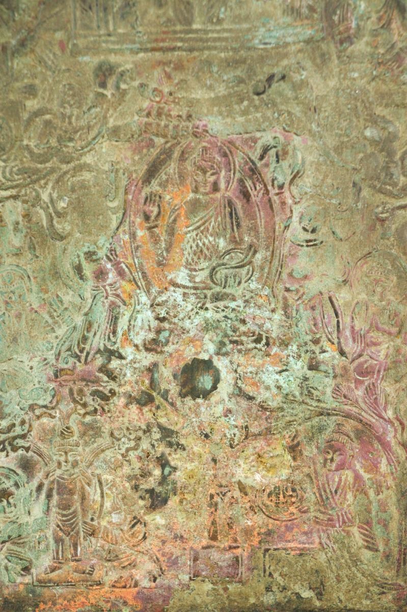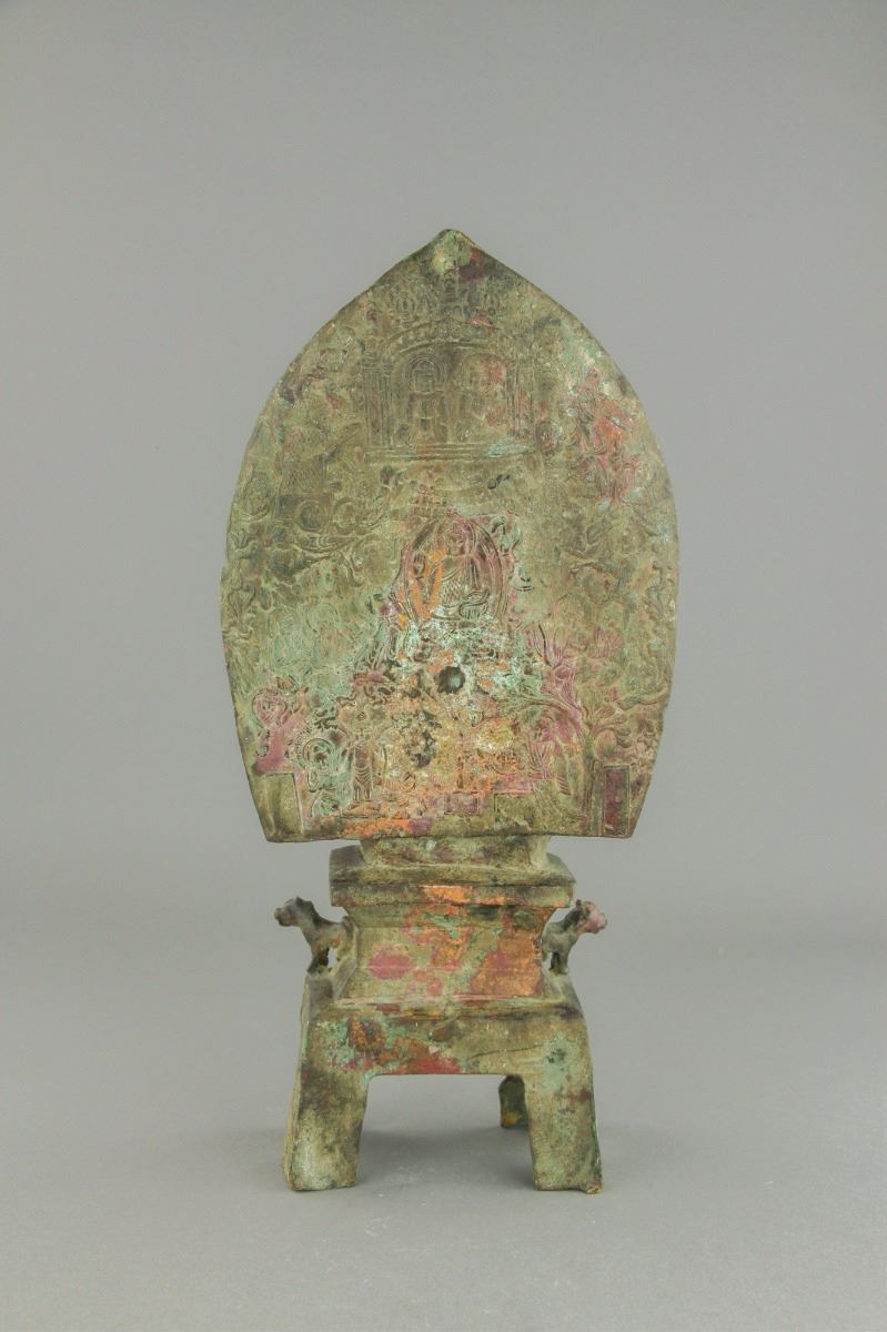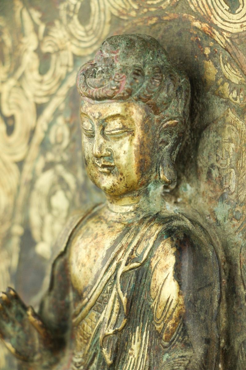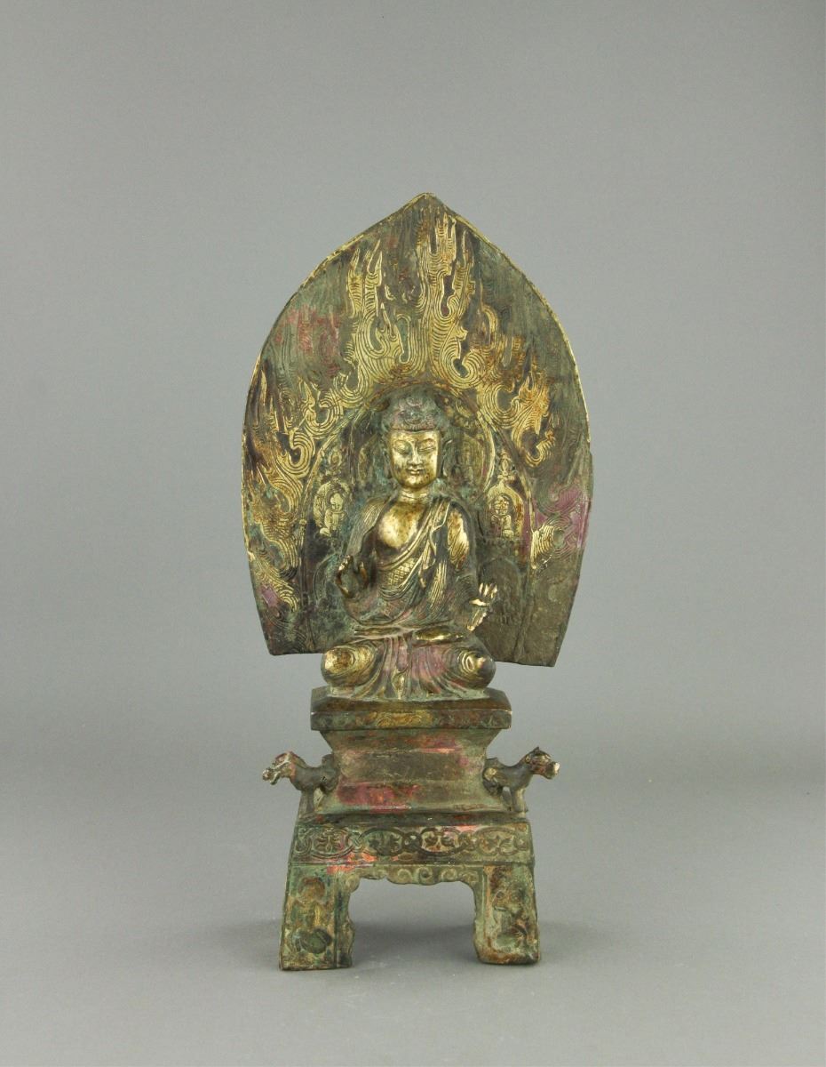 Wei Dynasty gilt bronze figure of Shakyamuni Buddha; depicting meditating Buddha seated in vajraparyankasana with the right hand in abhaya mudra and the left hand in avakasha mudra; supported by a tiered base flanked by two tiny beasts and a four-legged plinth; the mandorla cast in low relief with flames on front and Buddha figures on back; H: 32 cm, W: 15 cm, 1961 grams
