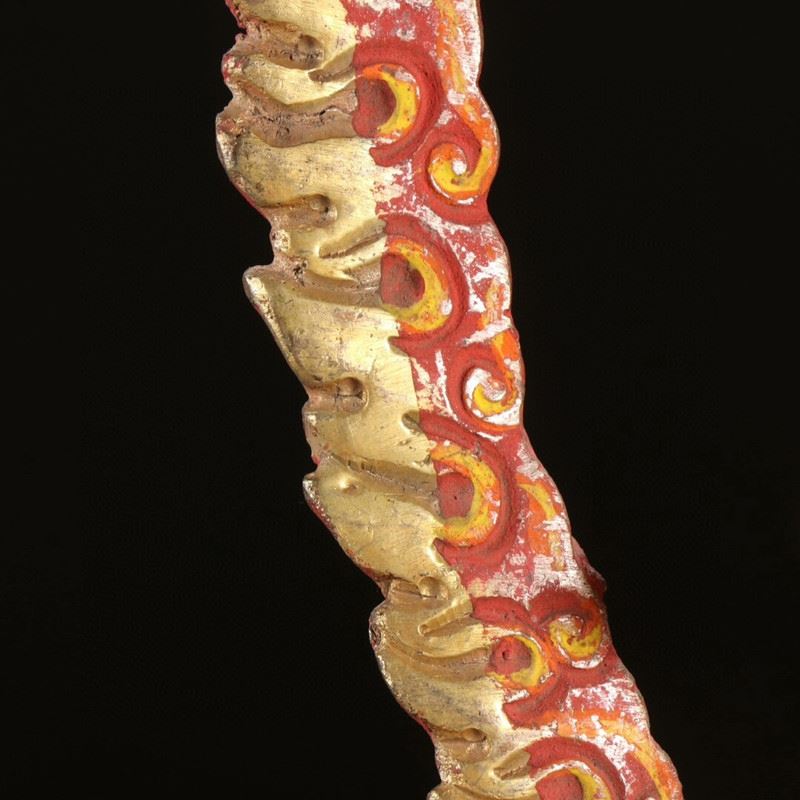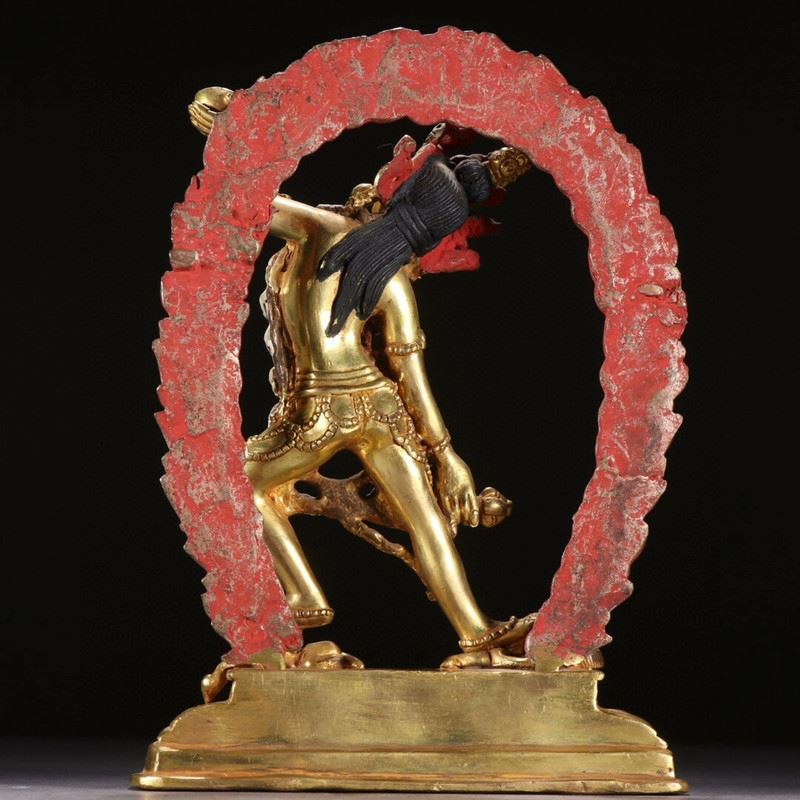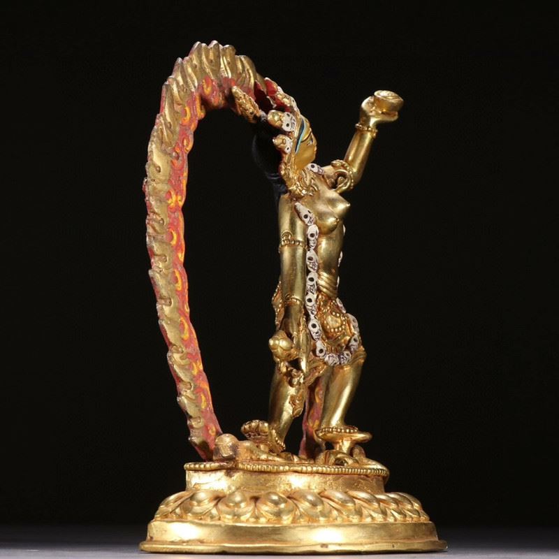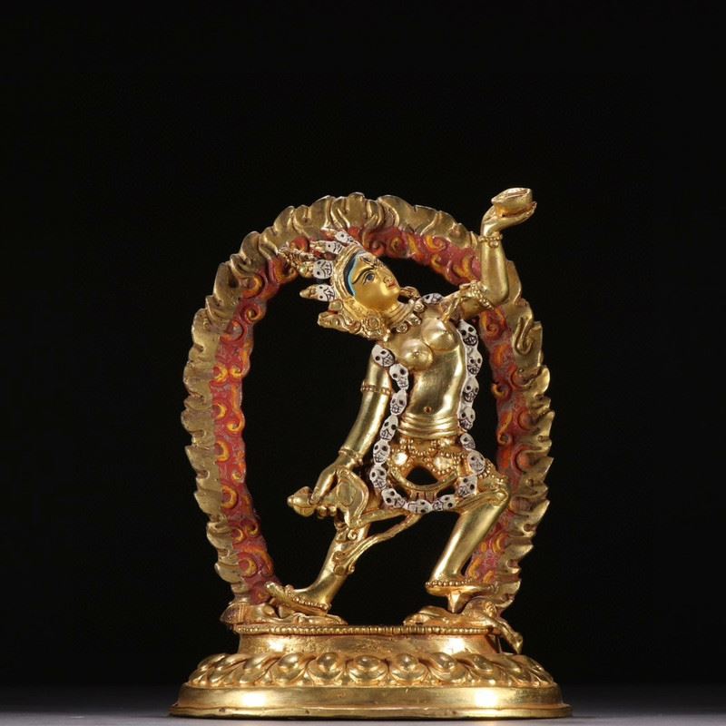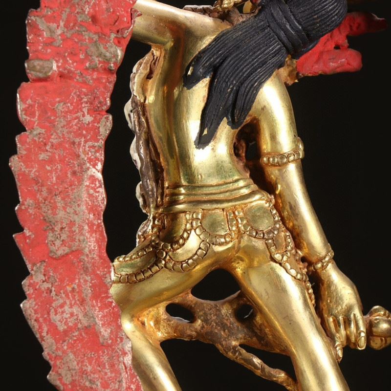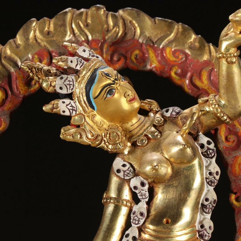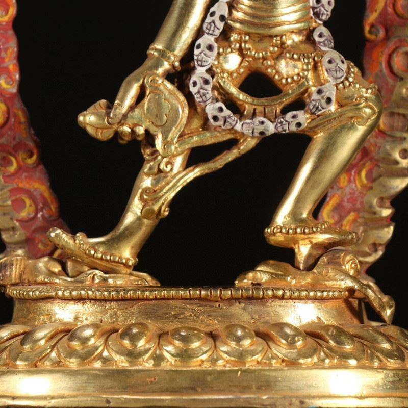 Dancing within a flaming aureole, Vajrayogini raises a skull cup and wields a crescent chopper, adorned with bone ornaments and a skull garland while trampling obstacles—symbolizing wisdom burning away ignorance. The rich gilding and painted details lend vivid presence.