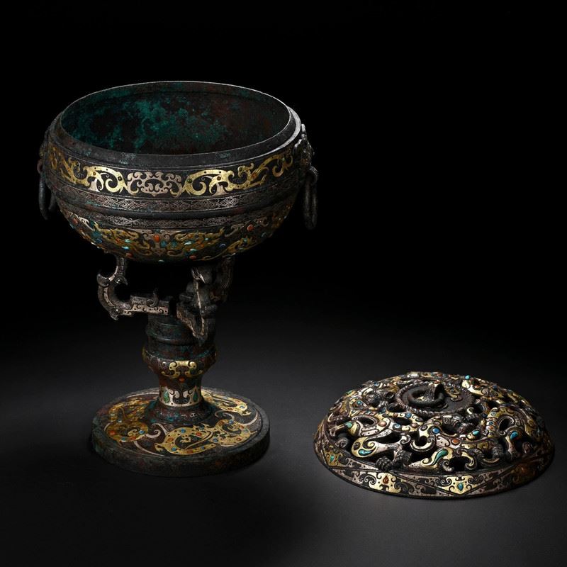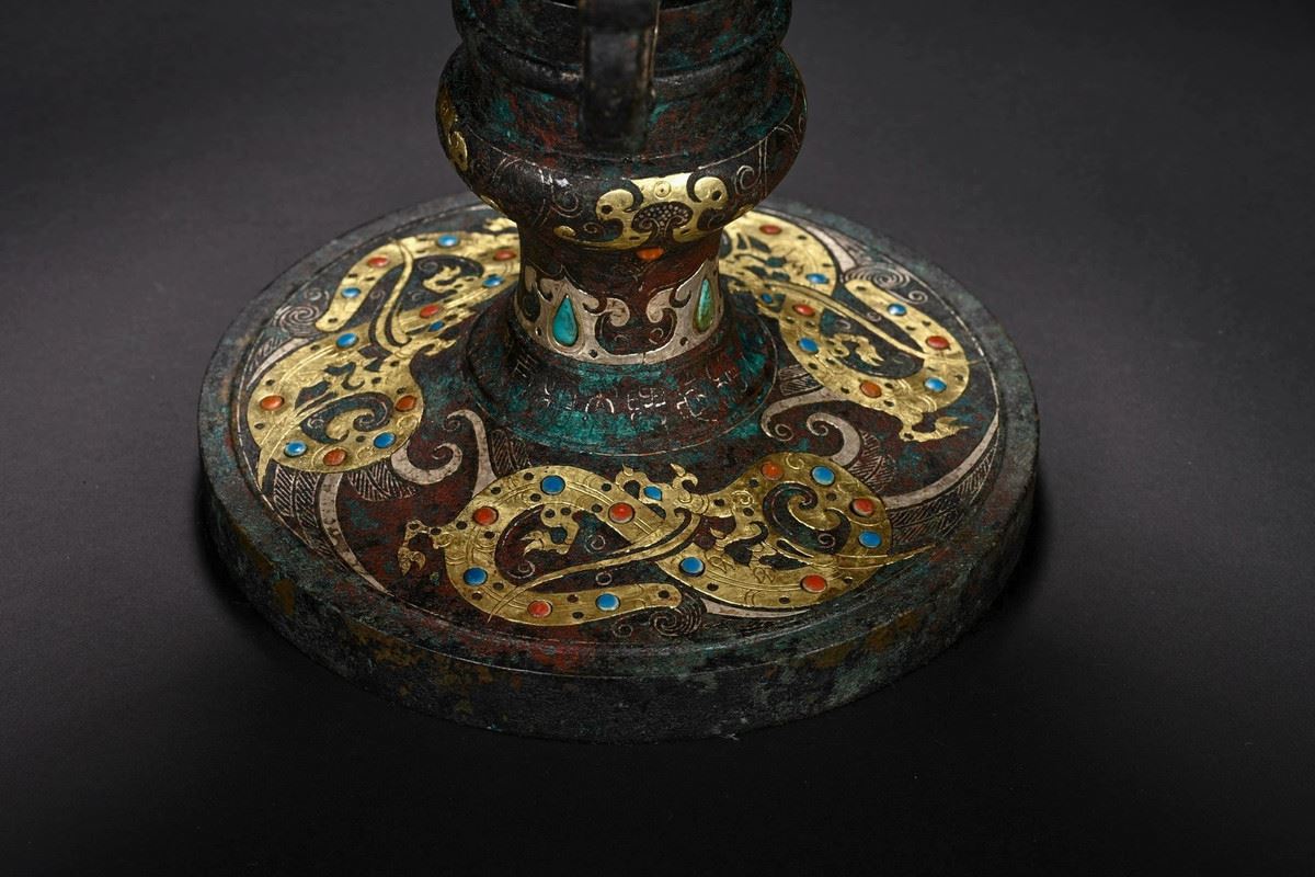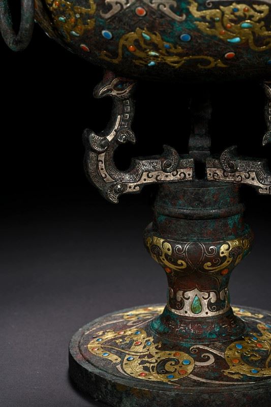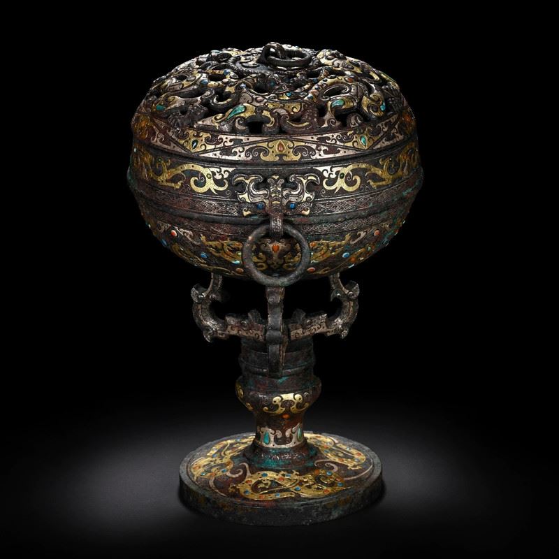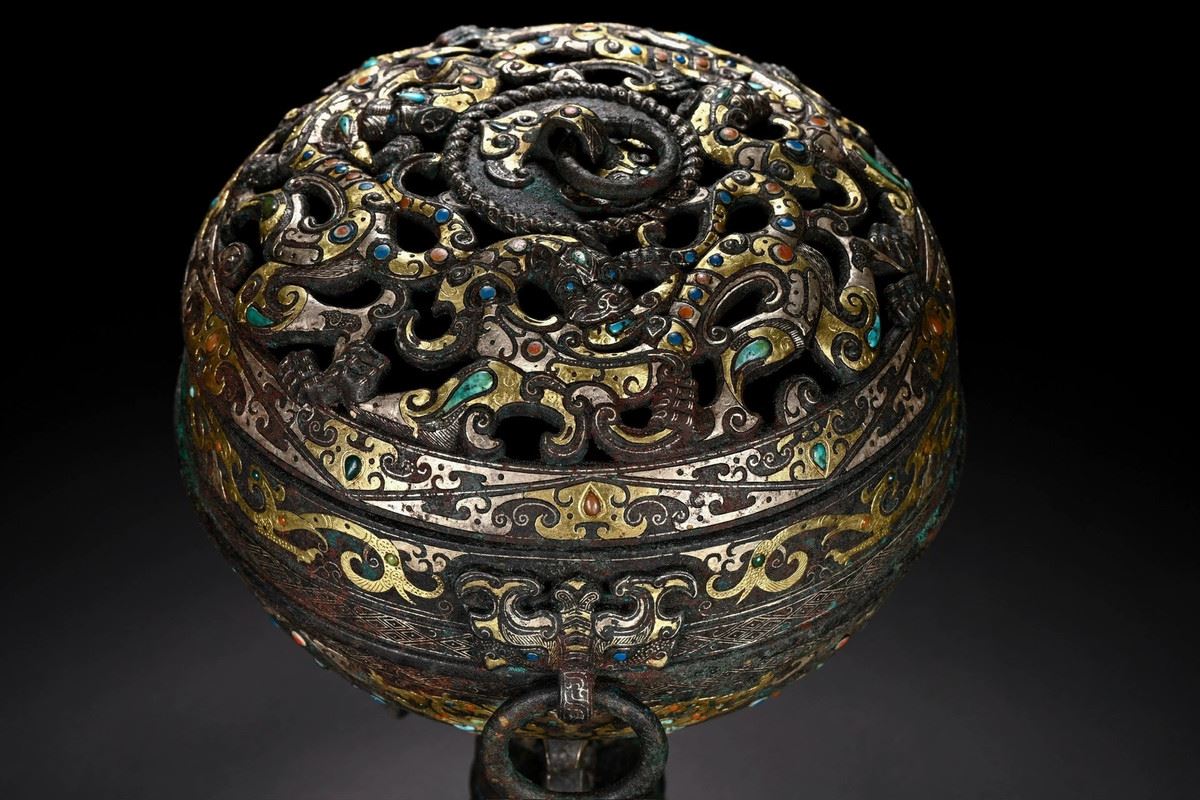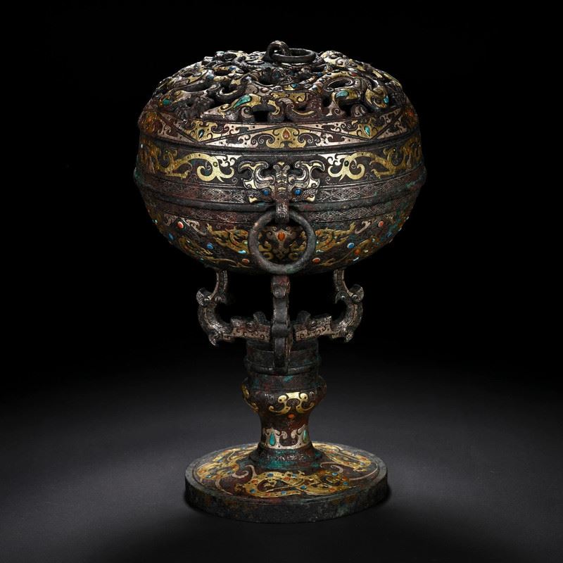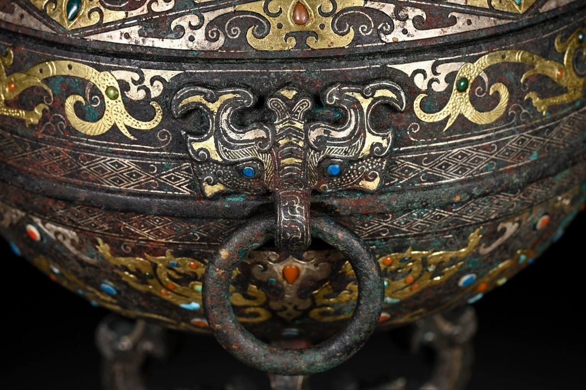 This gilt bronze incense burner showcases exquisite craftsmanship and ancient artistic traditions. The top of the burner is intricately carved with detailed floral patterns, presenting a traditional Chinese aesthetic. Surrounding it are colorful gemstones, enhancing its decorative appeal. The overall shape features a round, spherical structure that exudes both dynamism and antiquity. The base is supported by a sturdy pedestal, adorned with splendid metal carvings, highlighting the artisan's superb skills.