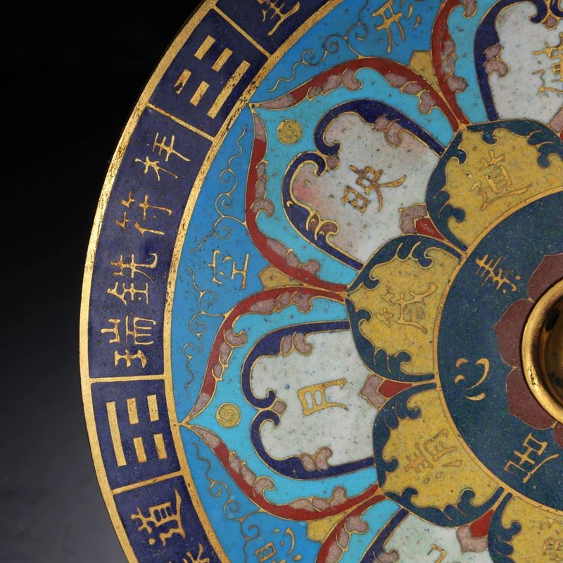 copper cloisonné enamel Ba Gua mirror employs traditional cloisonné craftsmanship, combining fine wirework and enamel to showcase vibrant blues and gold. The central mirror surface features the Ba Gua pattern, symbolizing the balance between yin and yang, and the surrounding intricate decorations further emphasize its profound cultural significance. This mirror is not only a superb example of traditional craftsmanship but also a unique symbol of ancient Chinese culture and philosophical thought.