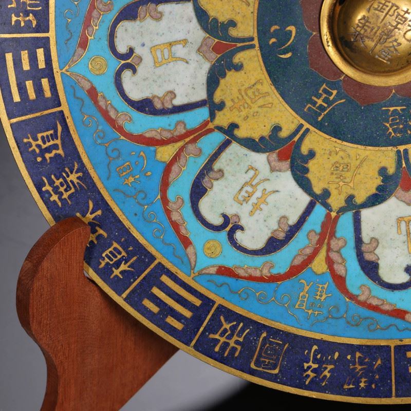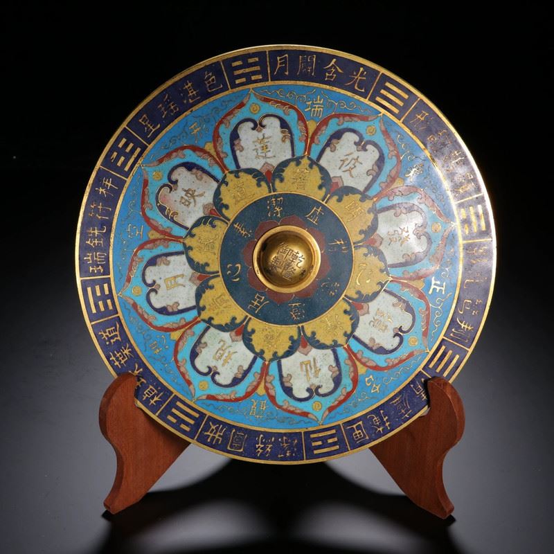 copper cloisonné enamel Ba Gua mirror employs traditional cloisonné craftsmanship, combining fine wirework and enamel to showcase vibrant blues and gold. The central mirror surface features the Ba Gua pattern, symbolizing the balance between yin and yang, and the surrounding intricate decorations further emphasize its profound cultural significance. This mirror is not only a superb example of traditional craftsmanship but also a unique symbol of ancient Chinese culture and philosophical thought.