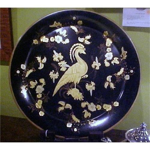 </font></strong>This is quite a stunning tray. On a black ground, the designs of exotic plants and a spectacular plumed bird are hand painted in gold. The tray measures 20" in diameter and is in excellent condition with only the most minor surface scratches. Early 20th century I believe.</font>