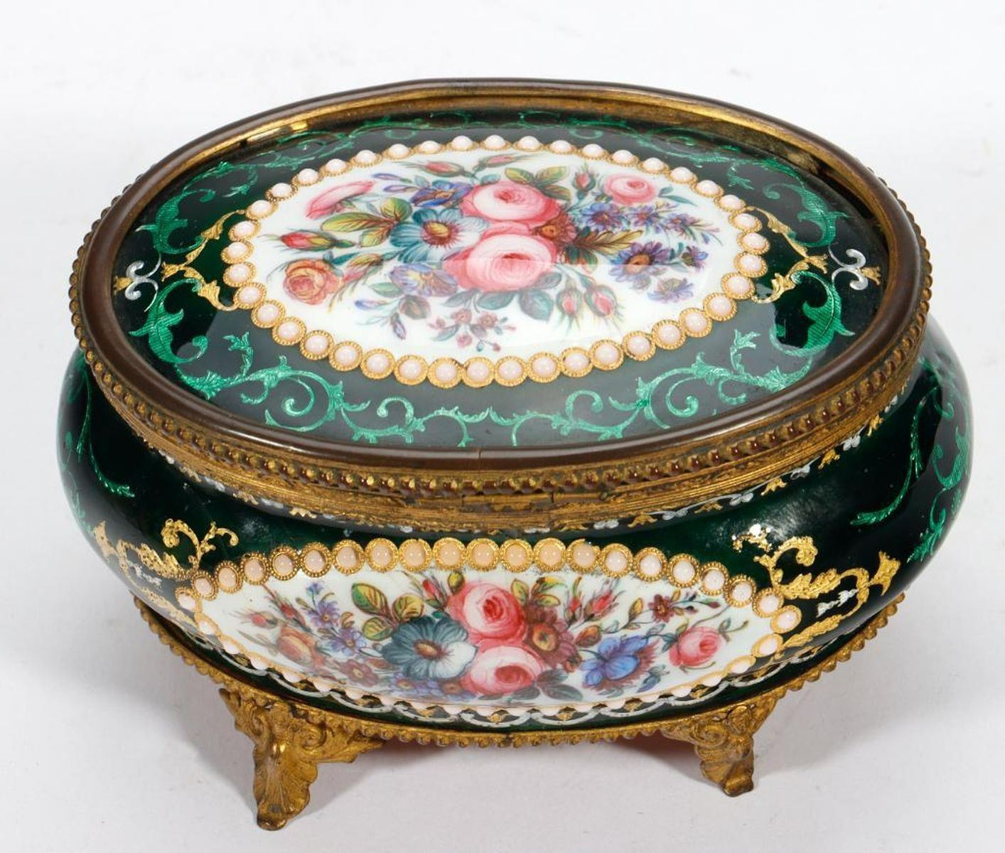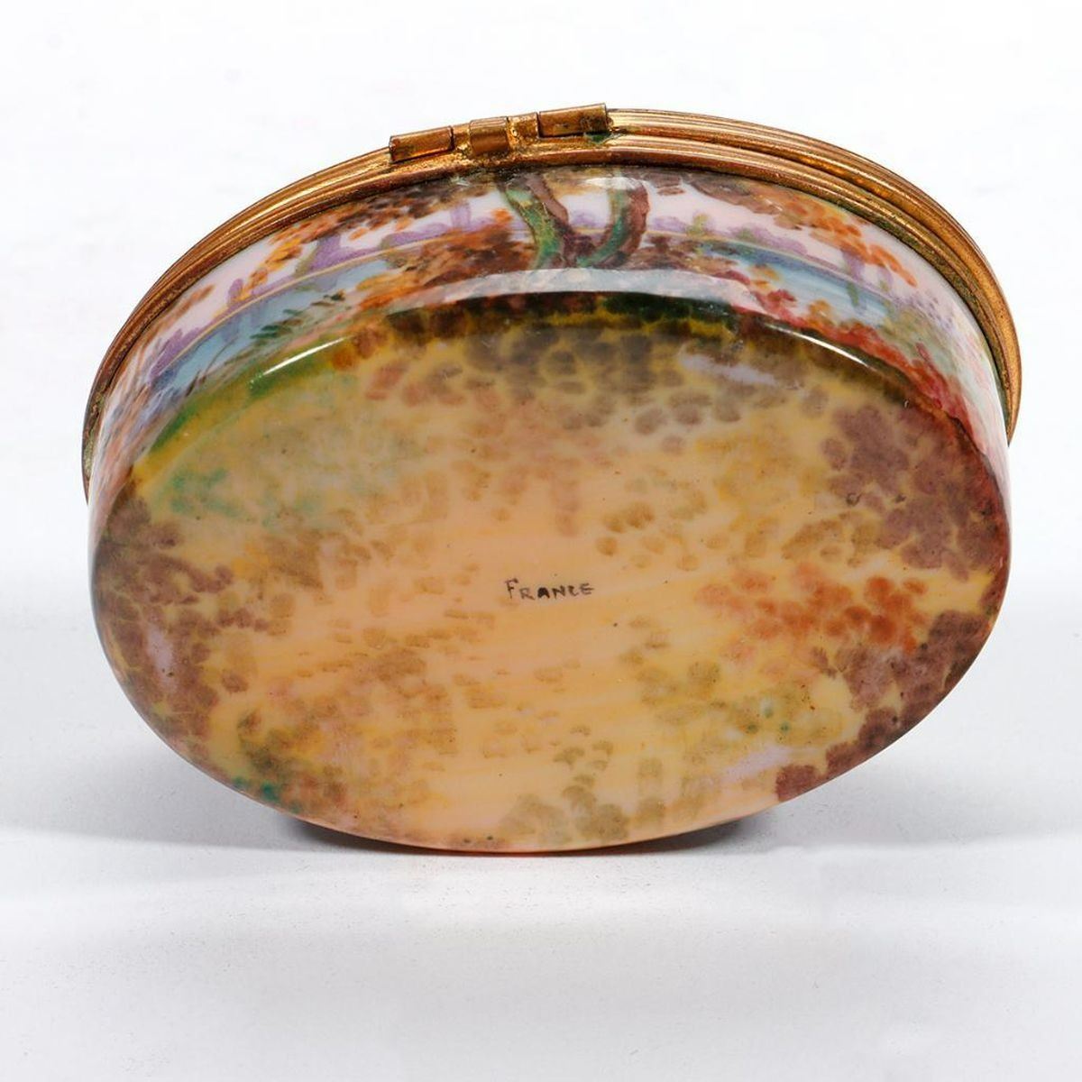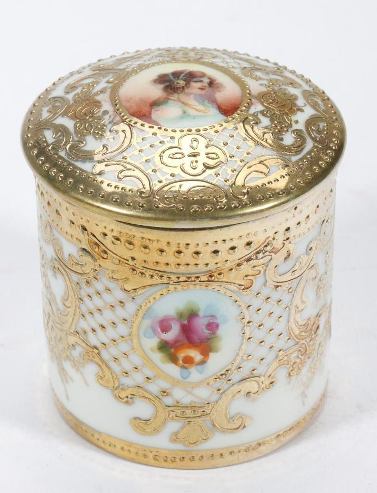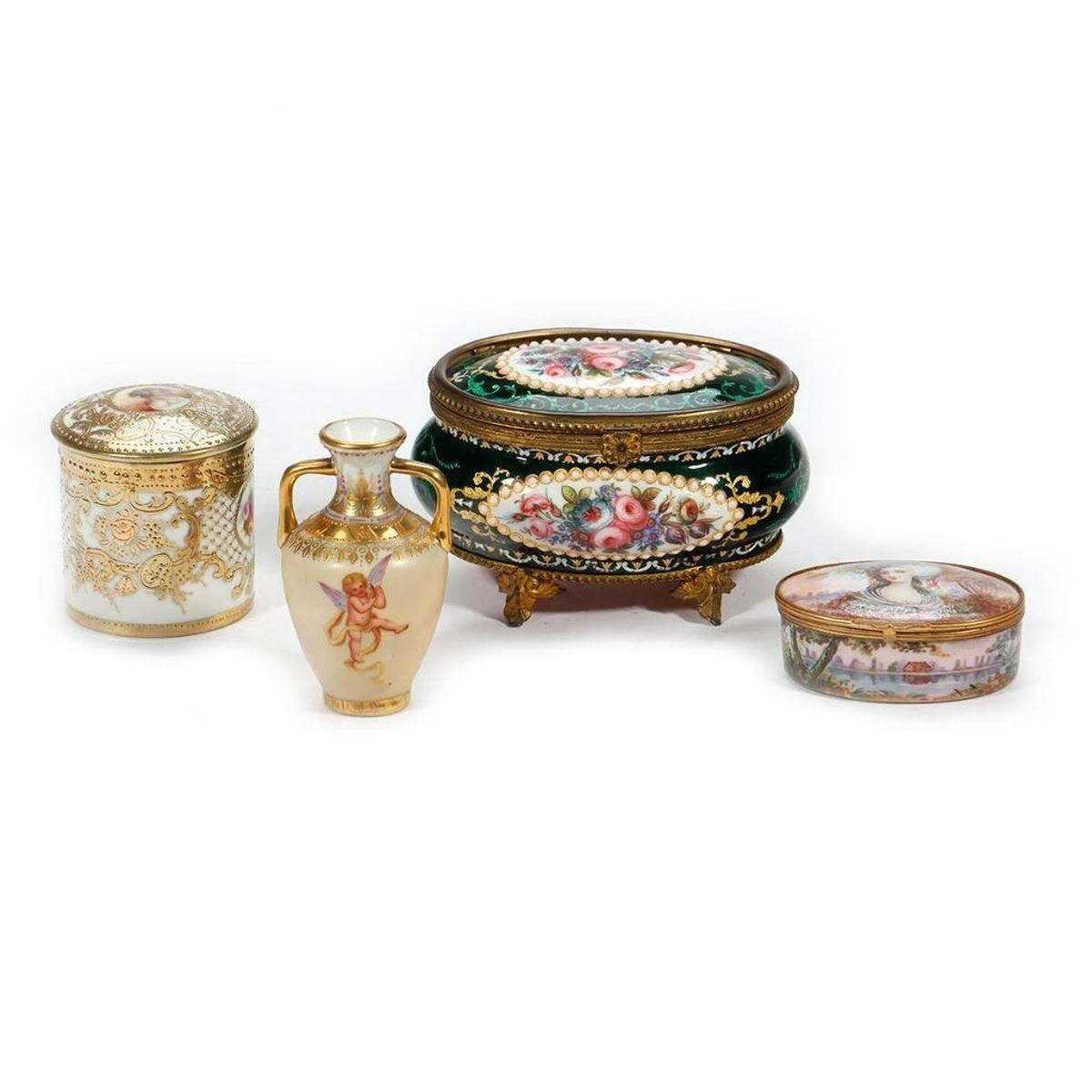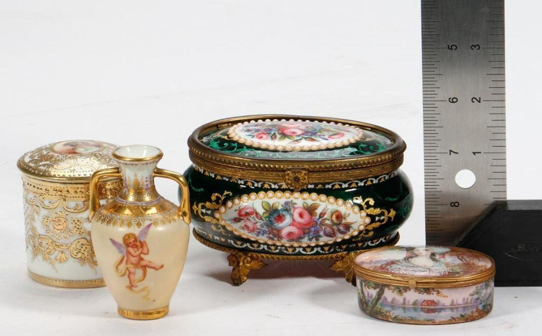 The oval box with silk lining (2 1/2in. h. x 4 1/2in.); together with a gilt porcelain lidded box, marked "Hand / Painted / [leaf] / (Nippon" 2 1/4in. h.); a gilt enameled box, marked "Ganet" and "France" (2 1/2in. long); and a tiny gilt vase, marked "[blue beehive] / Germany / Abundantia" (3in. h.). All in good condition; the larger box with wear to gilt, the silk lining worn/loosened.