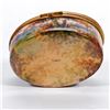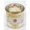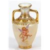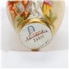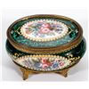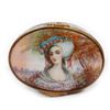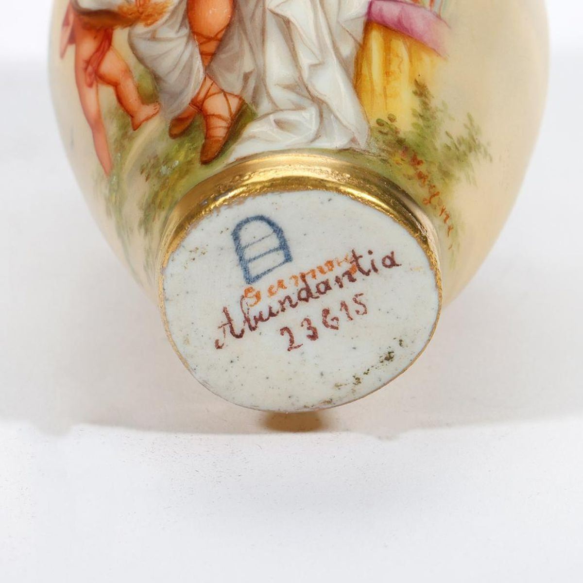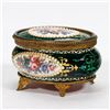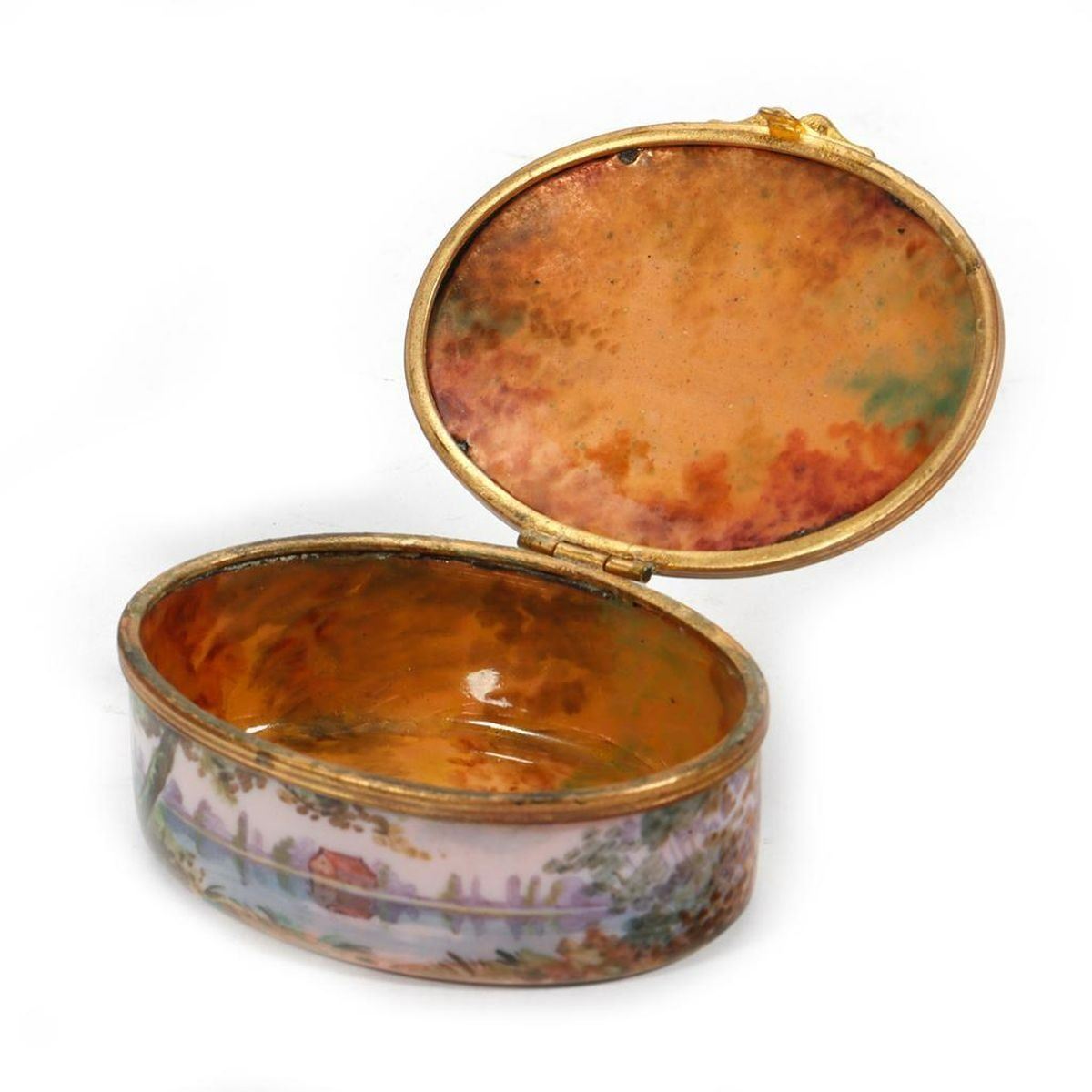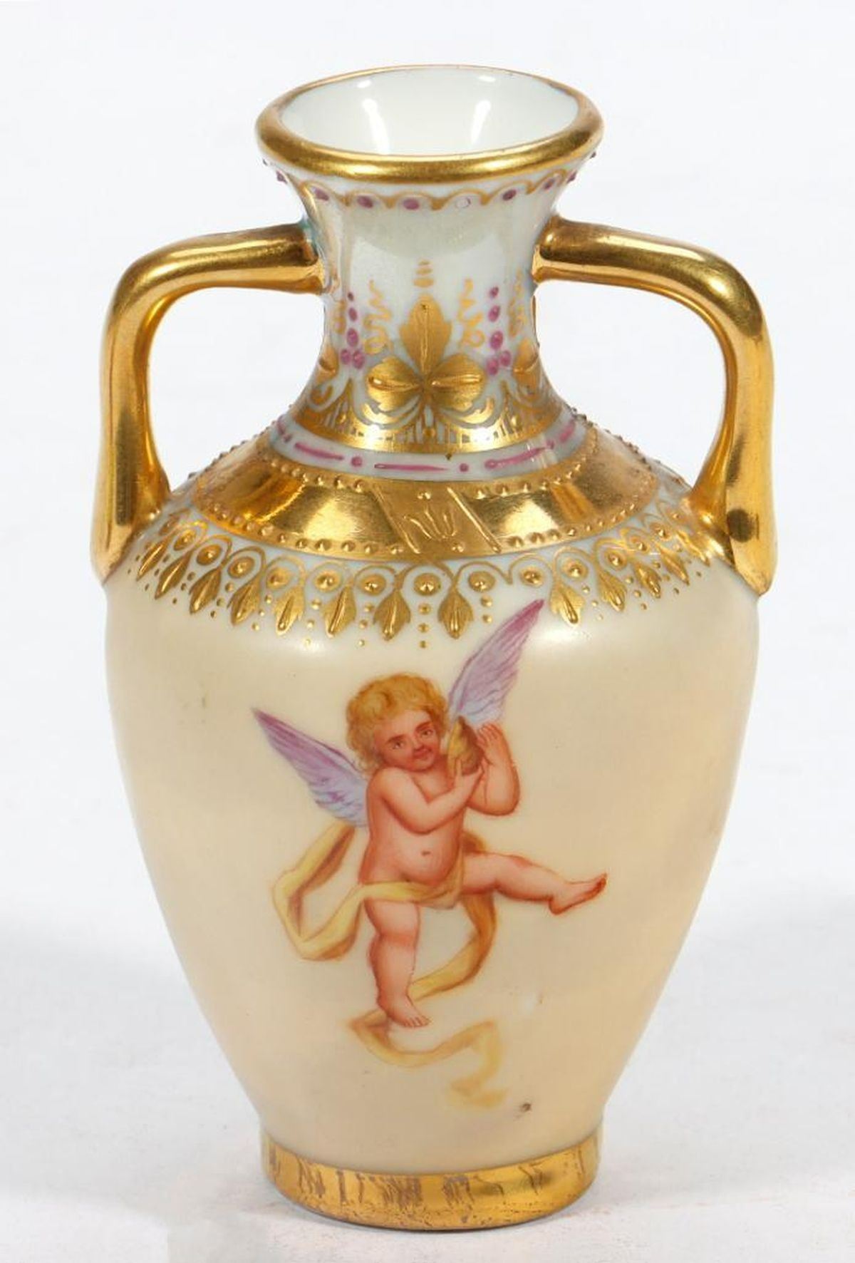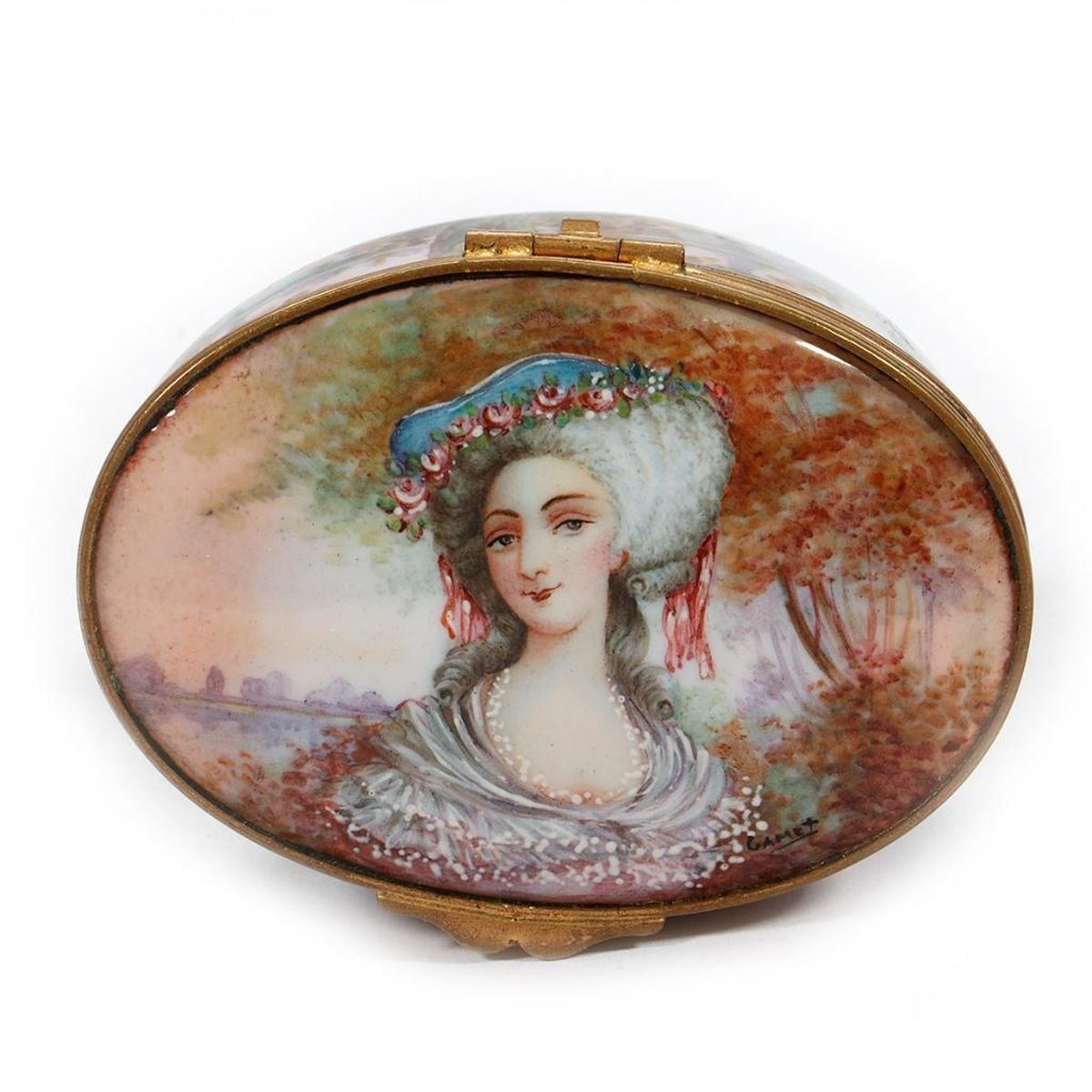 The oval box with silk lining (2 1/2in. h. x 4 1/2in.); together with a gilt porcelain lidded box, marked "Hand / Painted / [leaf] / (Nippon" 2 1/4in. h.); a gilt enameled box, marked "Ganet" and "France" (2 1/2in. long); and a tiny gilt vase, marked "[blue beehive] / Germany / Abundantia" (3in. h.). All in good condition; the larger box with wear to gilt, the silk lining worn/loosened.