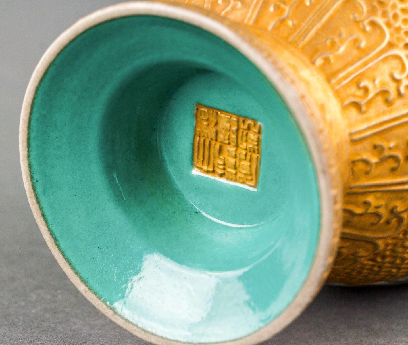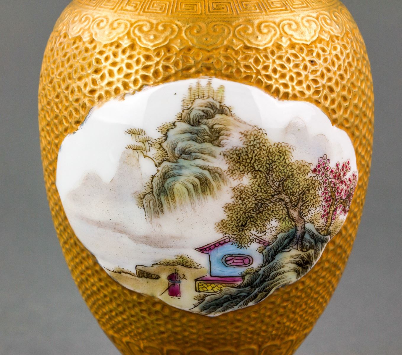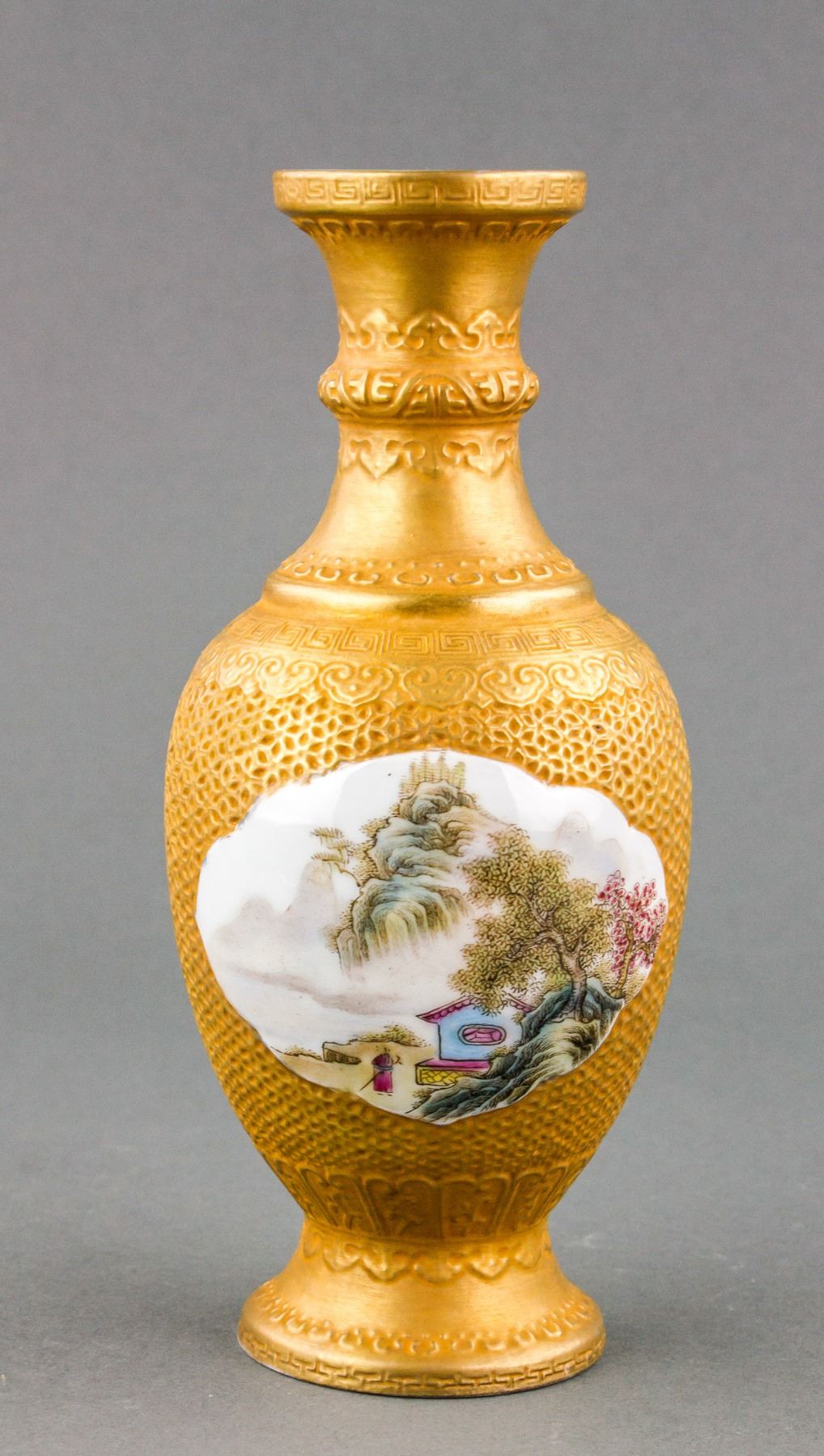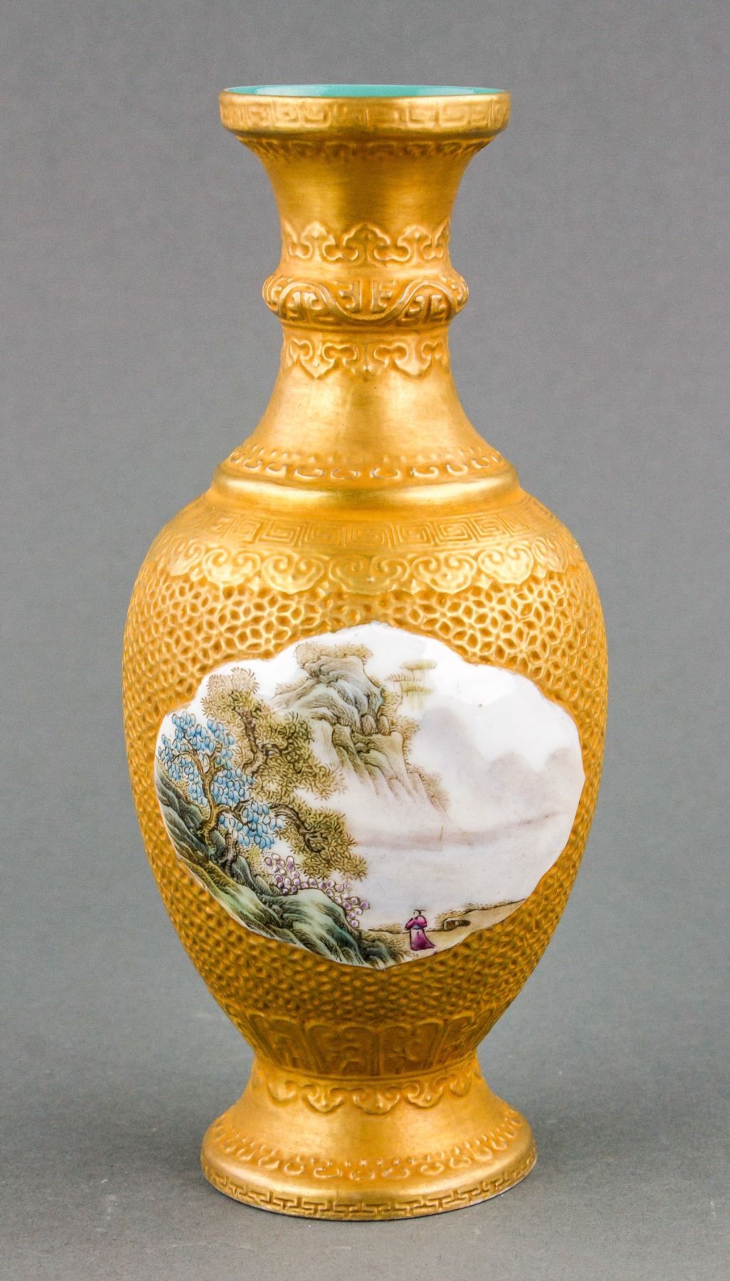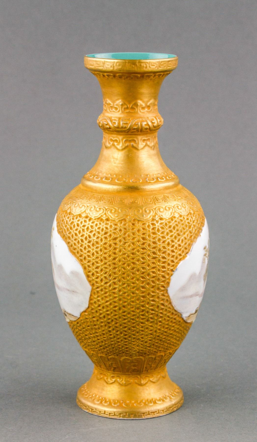 Chinese Famille Rose porcelain vase; of ovoid body tapering to a splayed foot; the waisted neck decorated with raised bands and galleried rim; painted with figure and landscape enclosed by two ruyi-shaped panels; the gilt ground carved with auspicious patterns in low relief; gilt six-character Qianlong mark on turquoise-glazed base; H: 22 cm, W; 8 cm, 407 grams