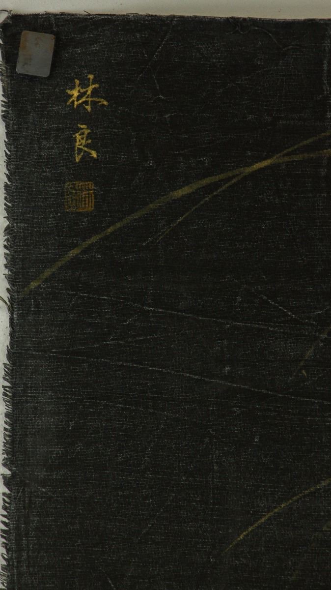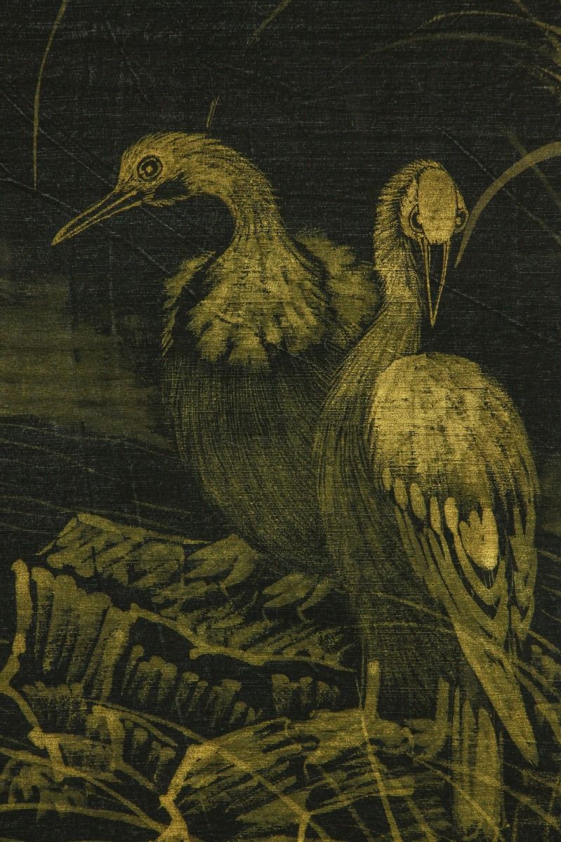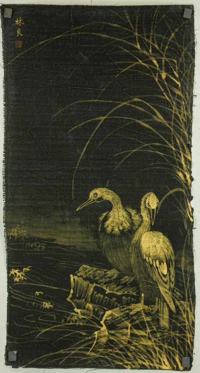 Pair of cormorants besides river; Chinese gilt ink on textile; signed Lin Liang and inscribed with one artist seal; 94 cm × 51 cm