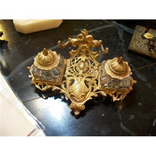 <tr><td>Title:Gilt Metal Double Inkwell & Pen Rest</td></tr>