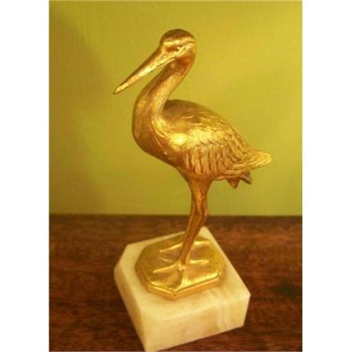 Offered here is a lovely small statue of an egret or stork, finely cast and gilt finished. It stands on a marble base with mitred corners. The bird stands approximately 5.5" high including the base. This is probably not terribly early...no more than 30-40 years old, but it does have the look and appeal of a much earlier item.
