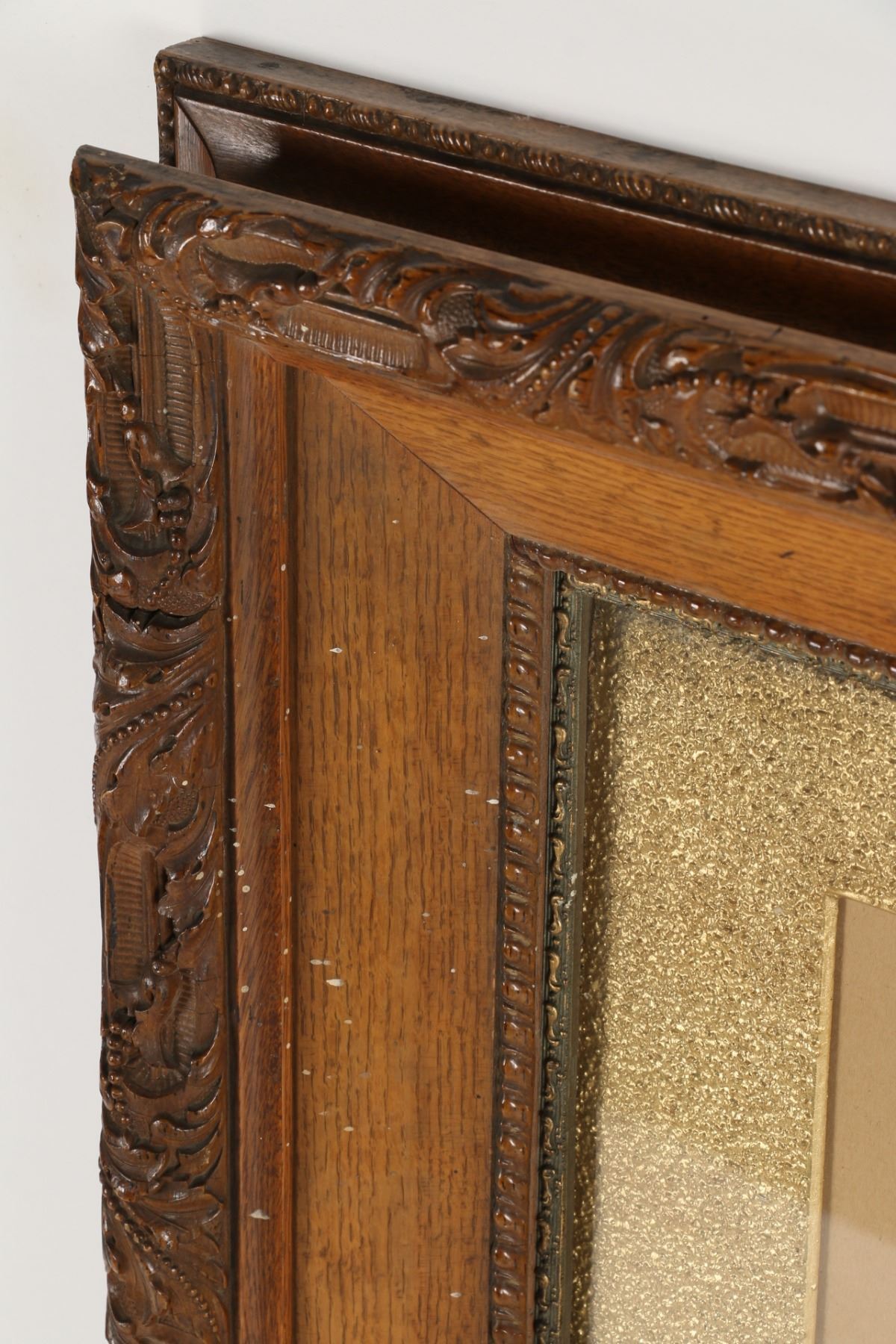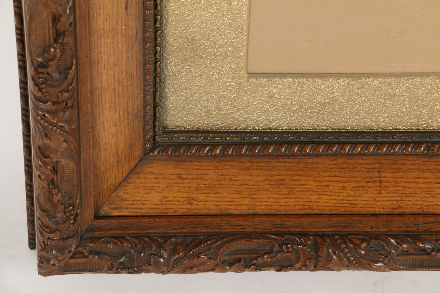 Heavy quarter-sawn oak with plaster appliqué. Fits works 21.5” x 17.5”.