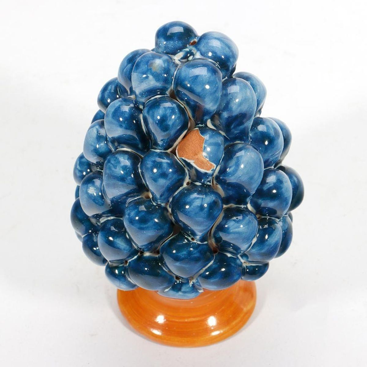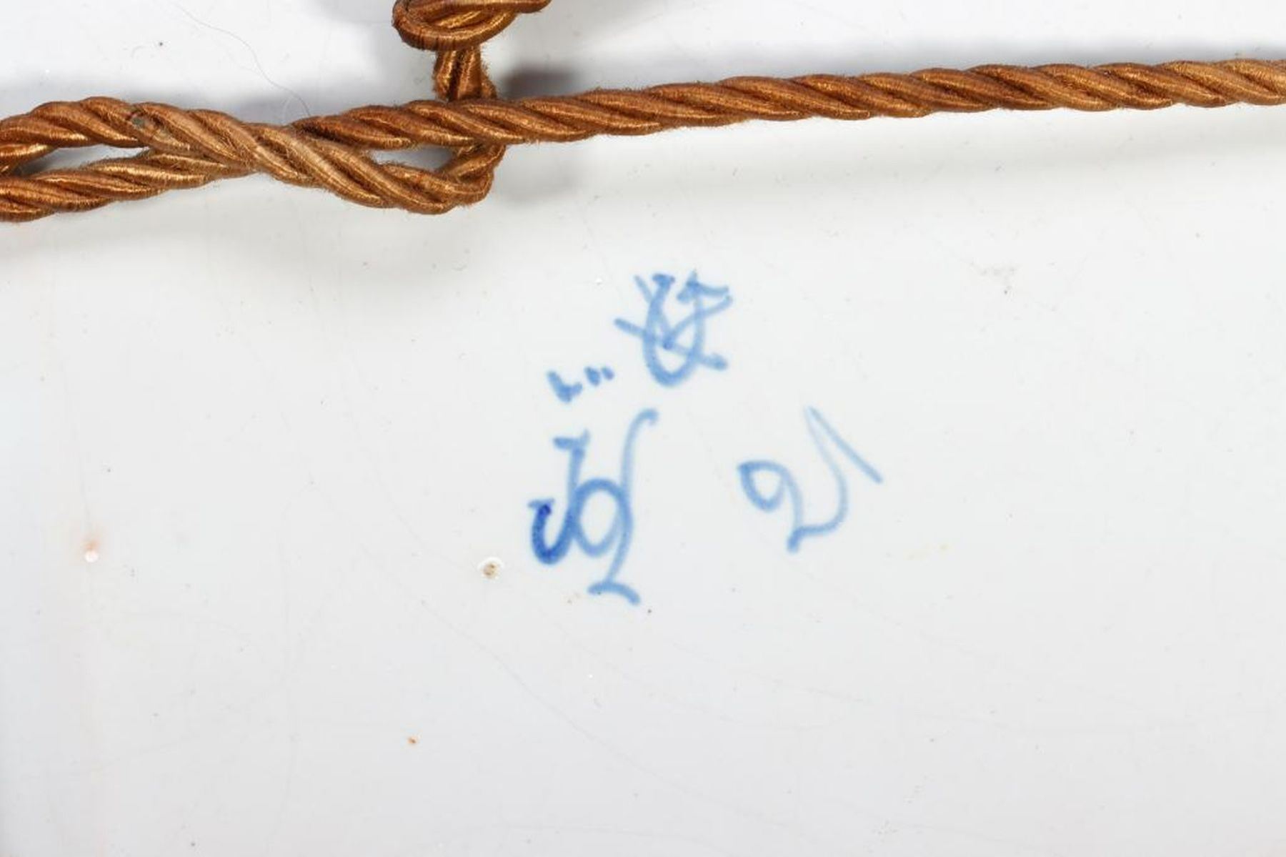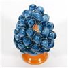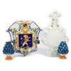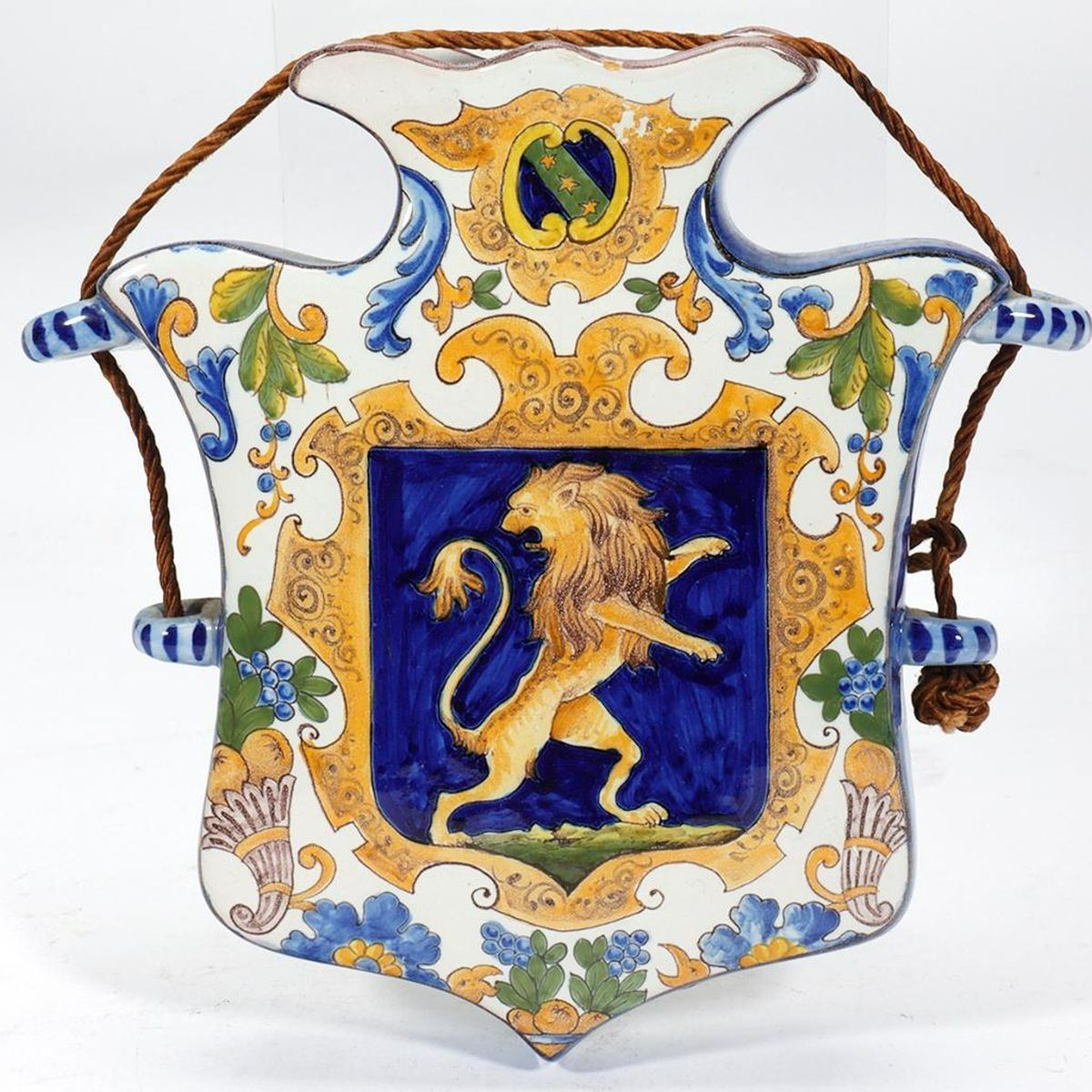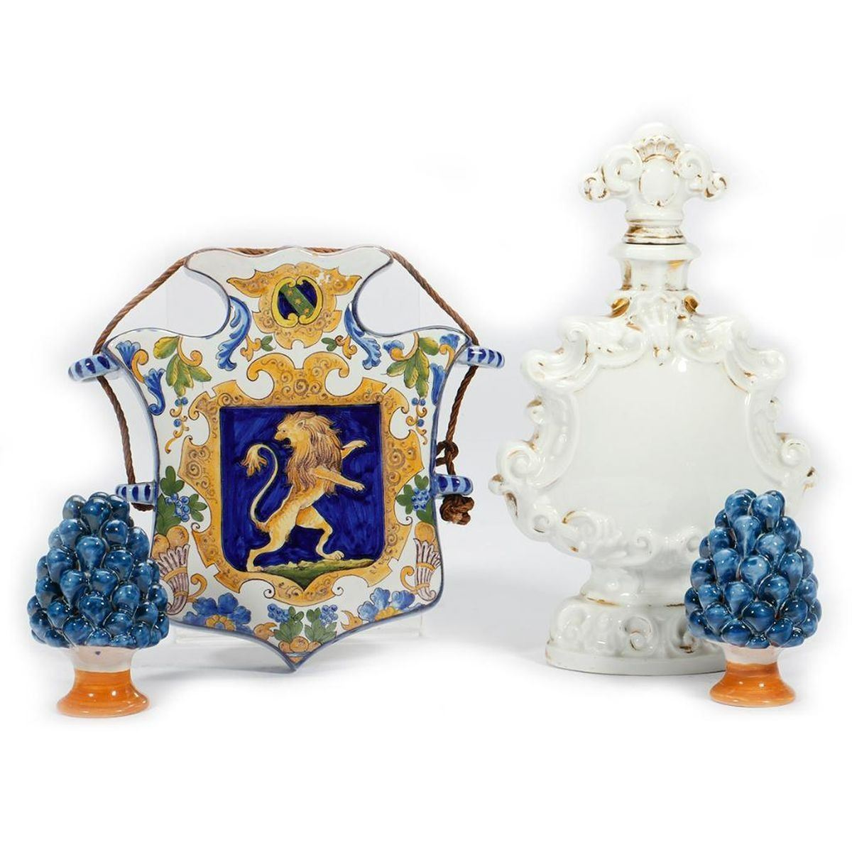 The scrolling shaped decanter with stopper; together with a decorative ceramic flask (signed "CK / Jol / 21," and grapes. Decanter: 10 1/2in. h. Flask: 8in. x 8 1/2in. Grapes: 4in. h. Condition: No chips/cracks on decanter, but gilt worn off; small chip on rim of flask, and chips on a few grapes.