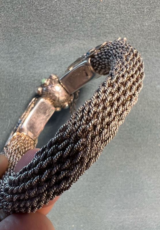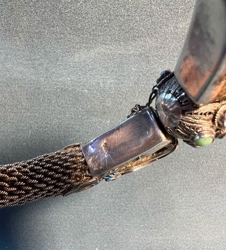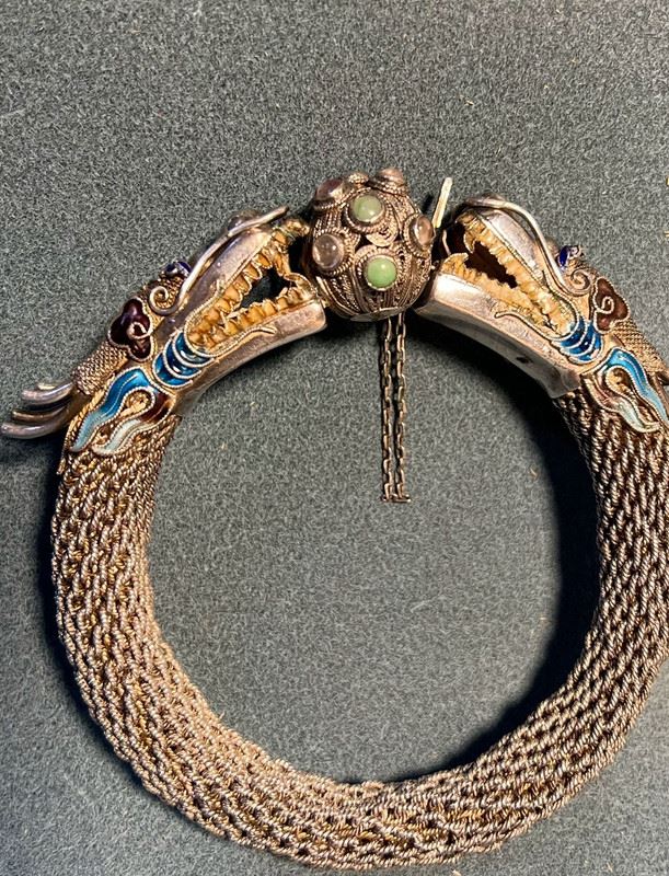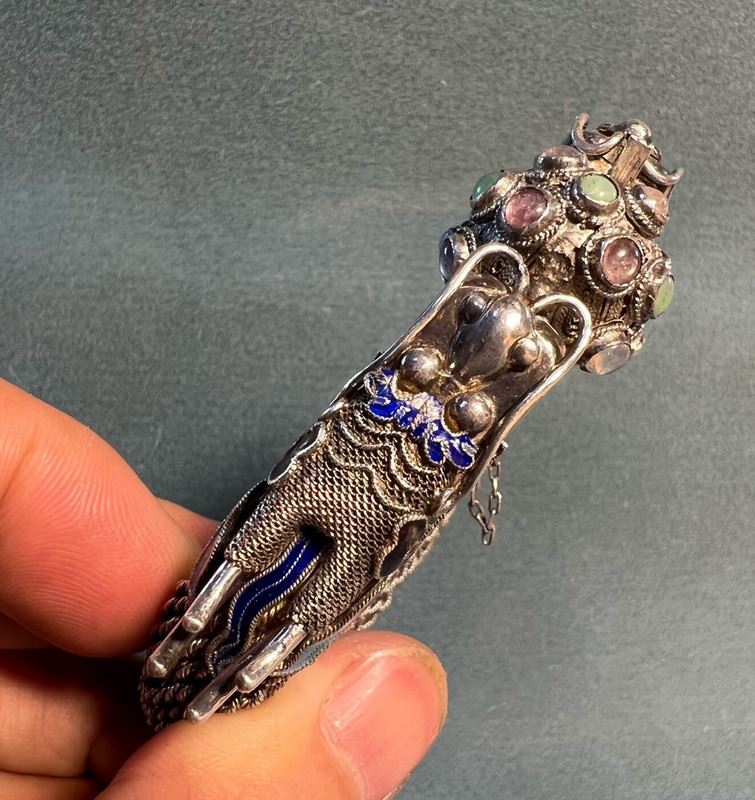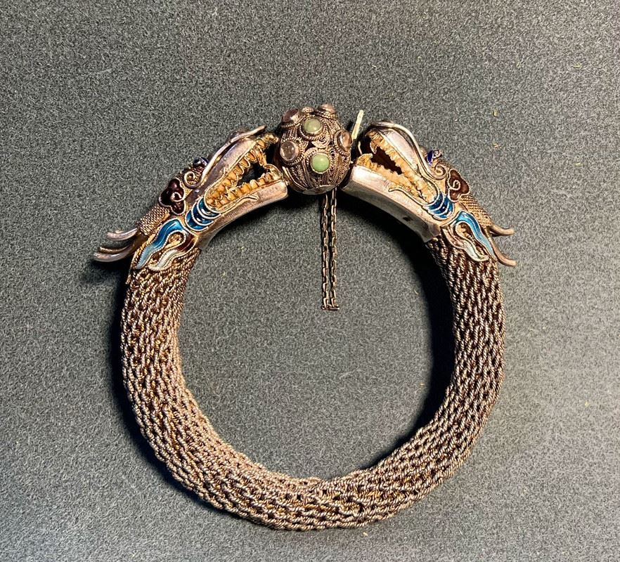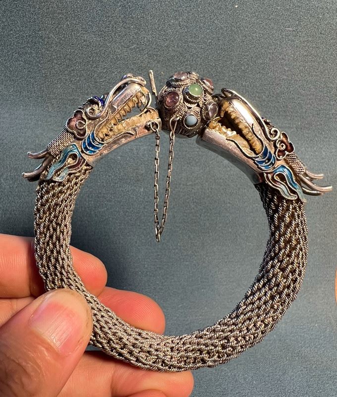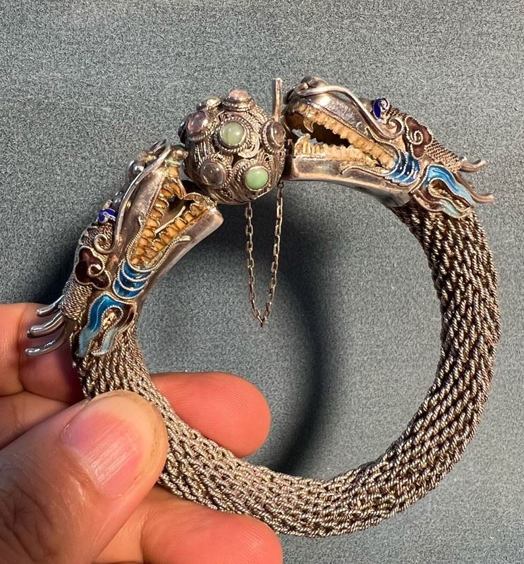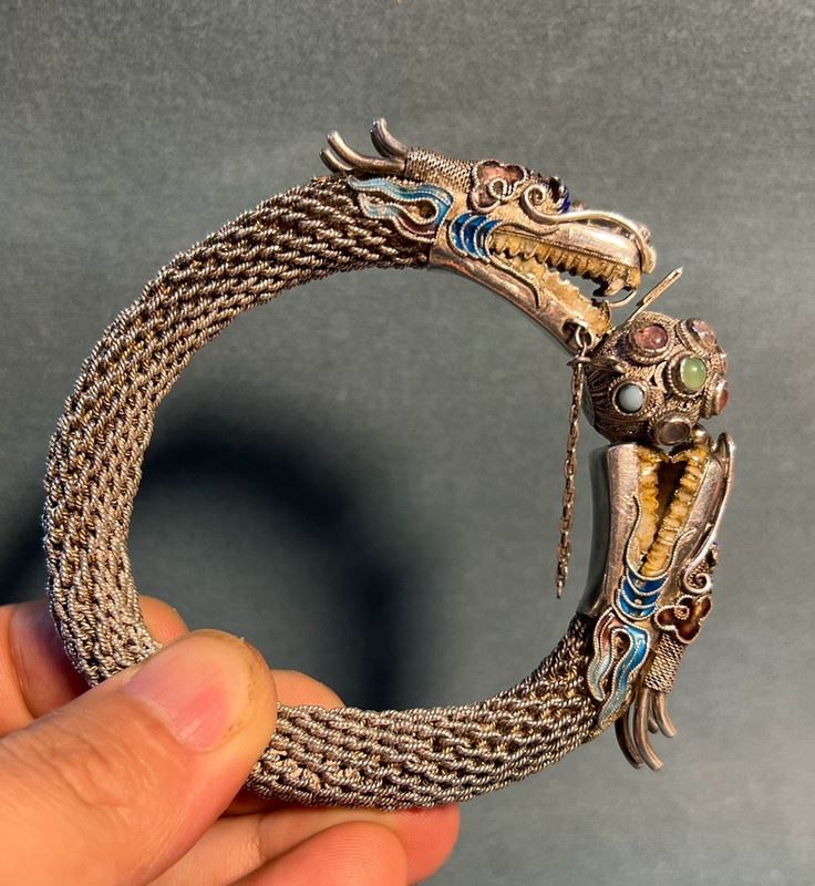 This bracelet is crafted in silver with partial gilding and cloisonné enamel accents. Both ends are finely sculpted as dragon heads, each rendered with lifelike details, grasping a central bead, symbolizing auspicious power and protection. The central orb is further decorated with turquoise and cabochons, enhancing its precious appearance. The band is woven from multiple strands of silver chains, creating flexibility and a luxurious texture. Exquisite in craftsmanship and rich in symbolism, this bracelet represents both refined adornment and traditional cultural heritage.