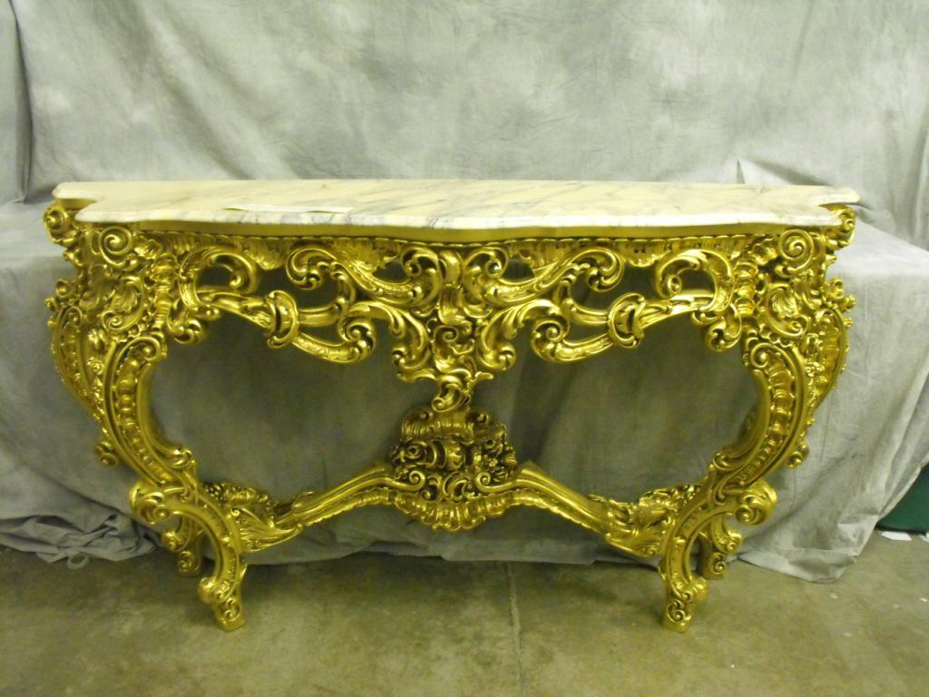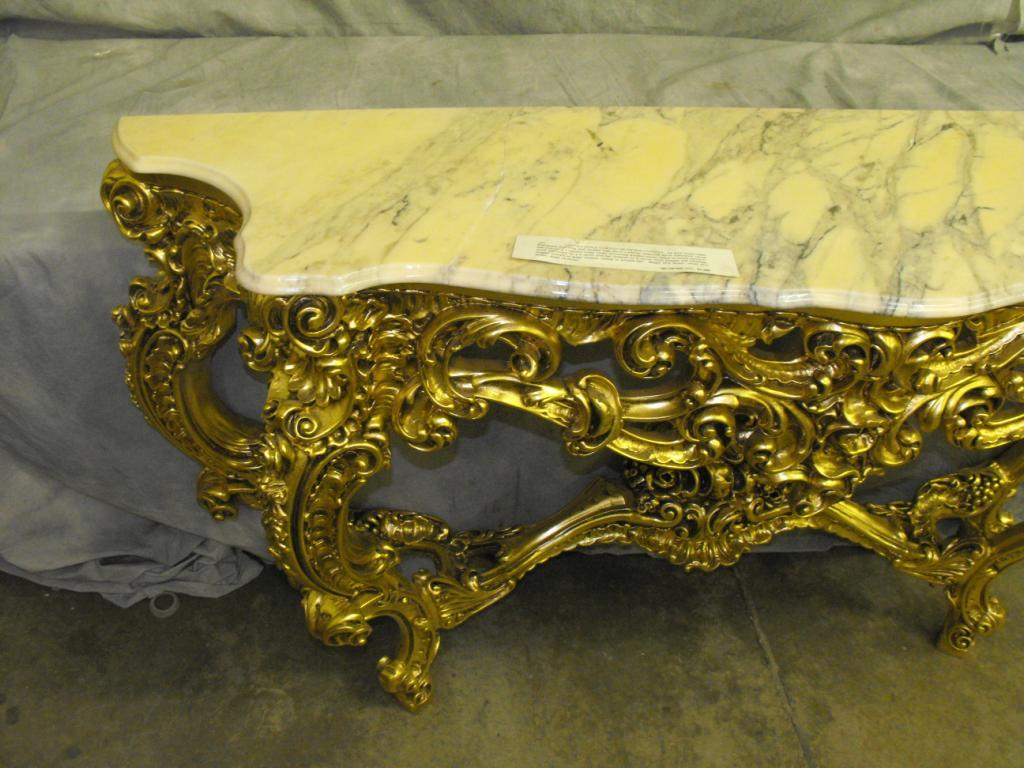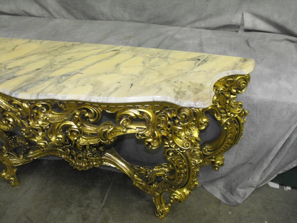 Portuguese Marble Top Above a Pierced Serpatine Apron Elaborately Carved and Centered By a Massive Volute Cluster of Swirling Acanthus Leaves, Raised on Foliate Carved C-Scroll Legs Leading Outwards to Grape Cluster ending in Scrolled Toes