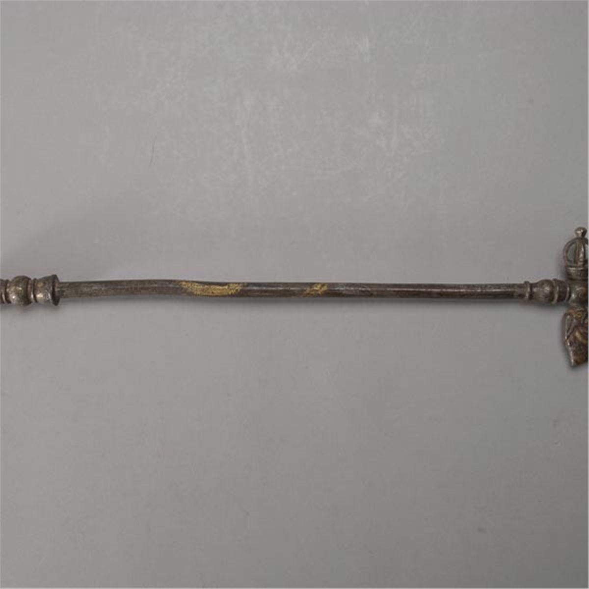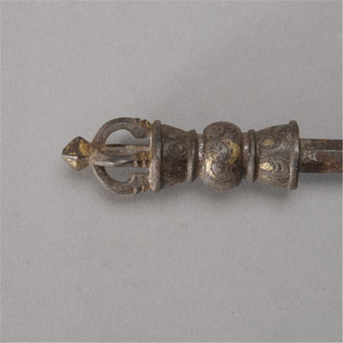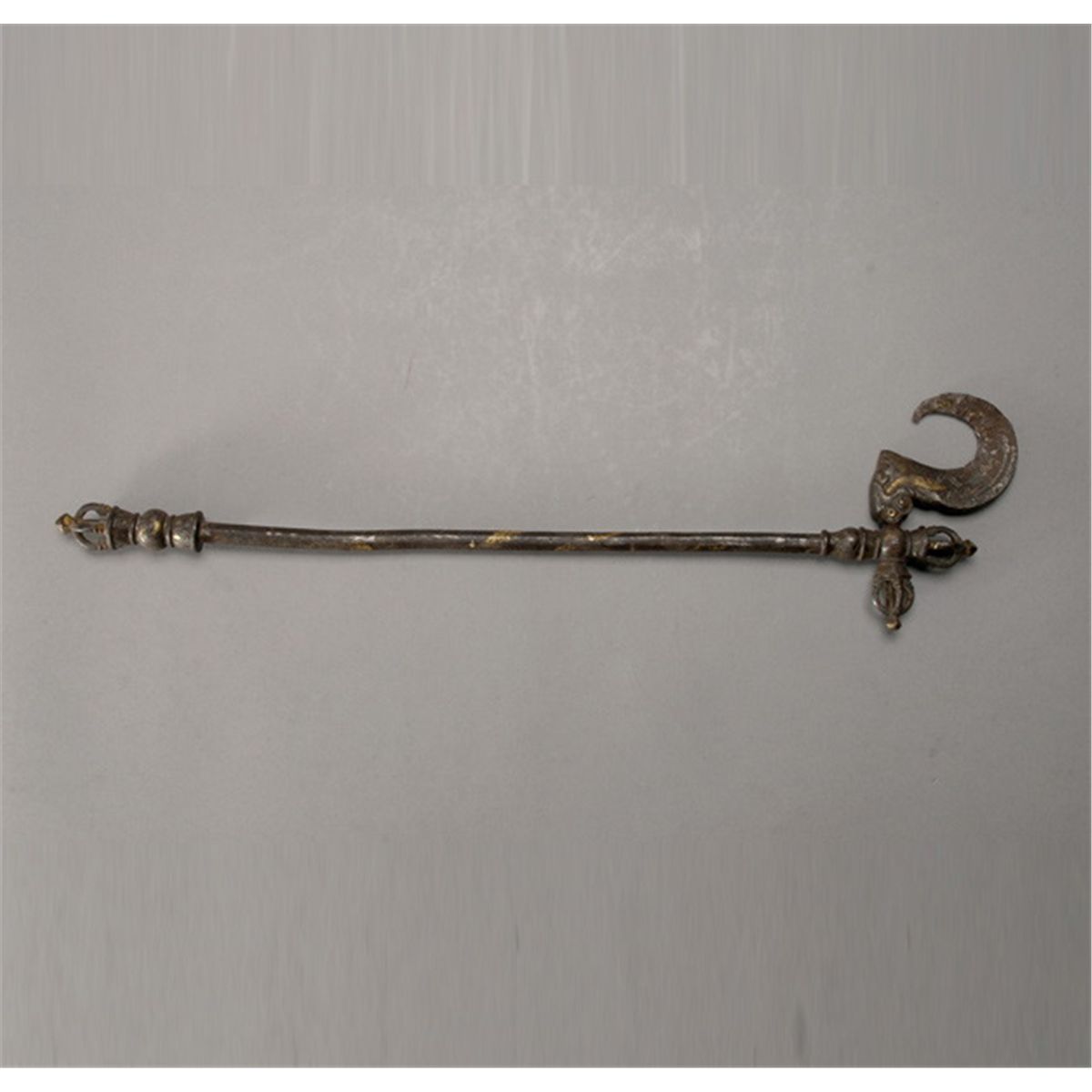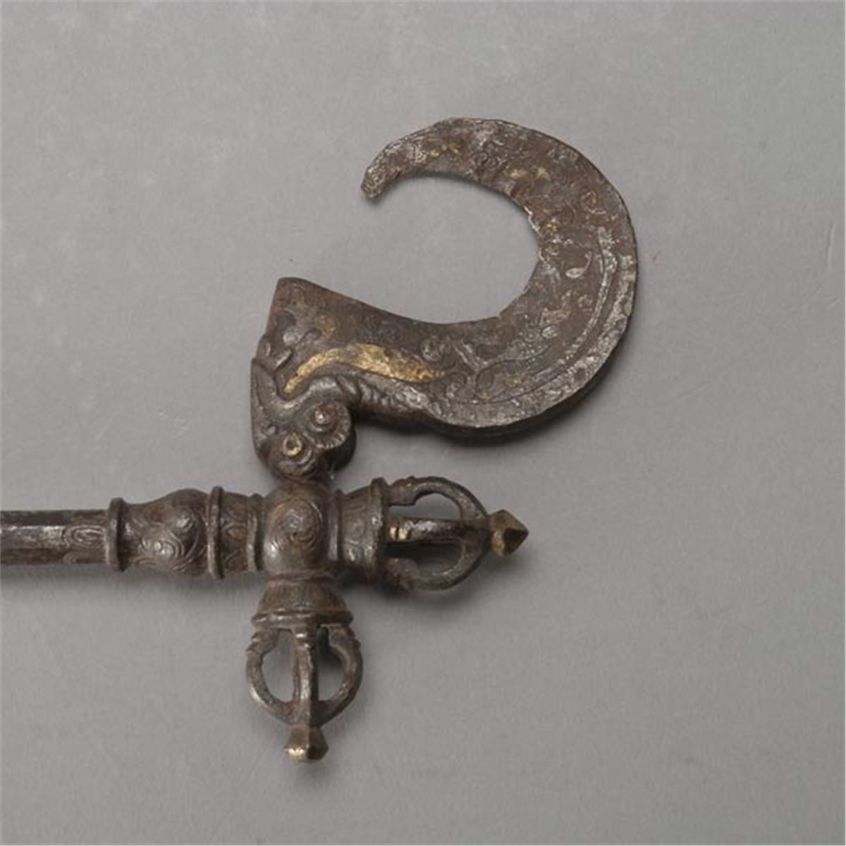 A Gilt and Silver-Decorated Iron Vajra Hook (dorjey chagkyu), The flat hook issued from the mouth of a makara mask connected with a reticulated prong via a rounded hub, the grip with a facet finish set between two spherical prongs, the surfaces decorated with stylized dragons , lappet bands, and yinyang symbols, some areas heightened in either gilt or silver. 14th/15th Century, Length: 16 1/4 inches (41.3 cm) Provenance:Acquired from Sotheby's New York Sale in 1990's.