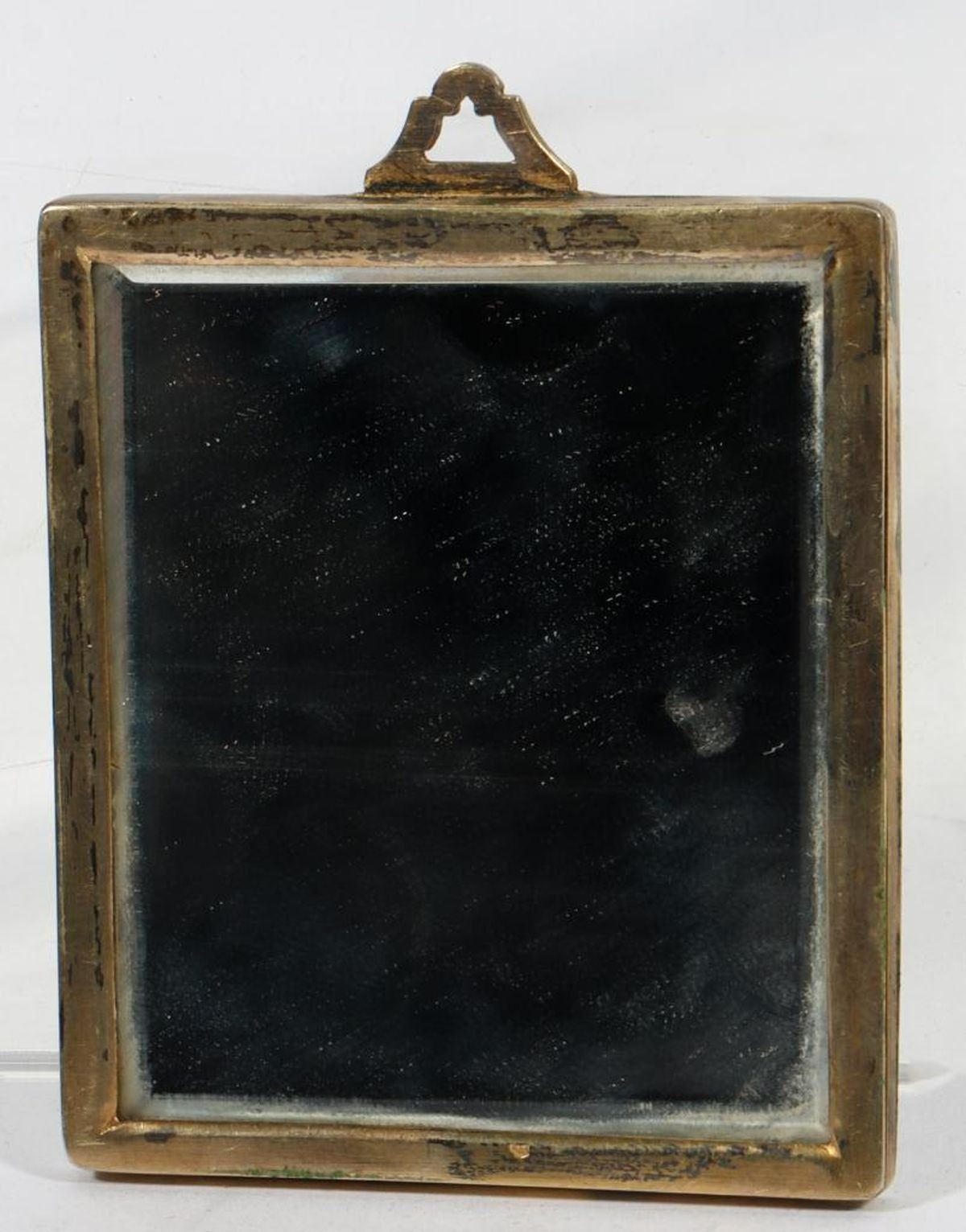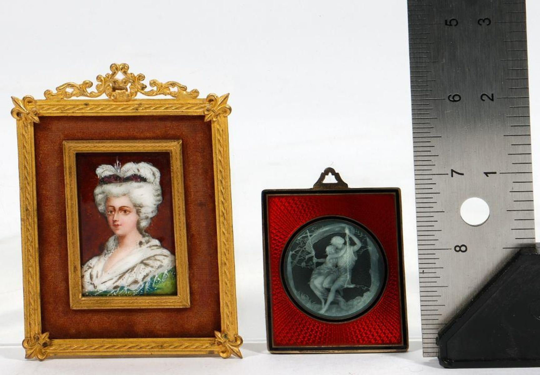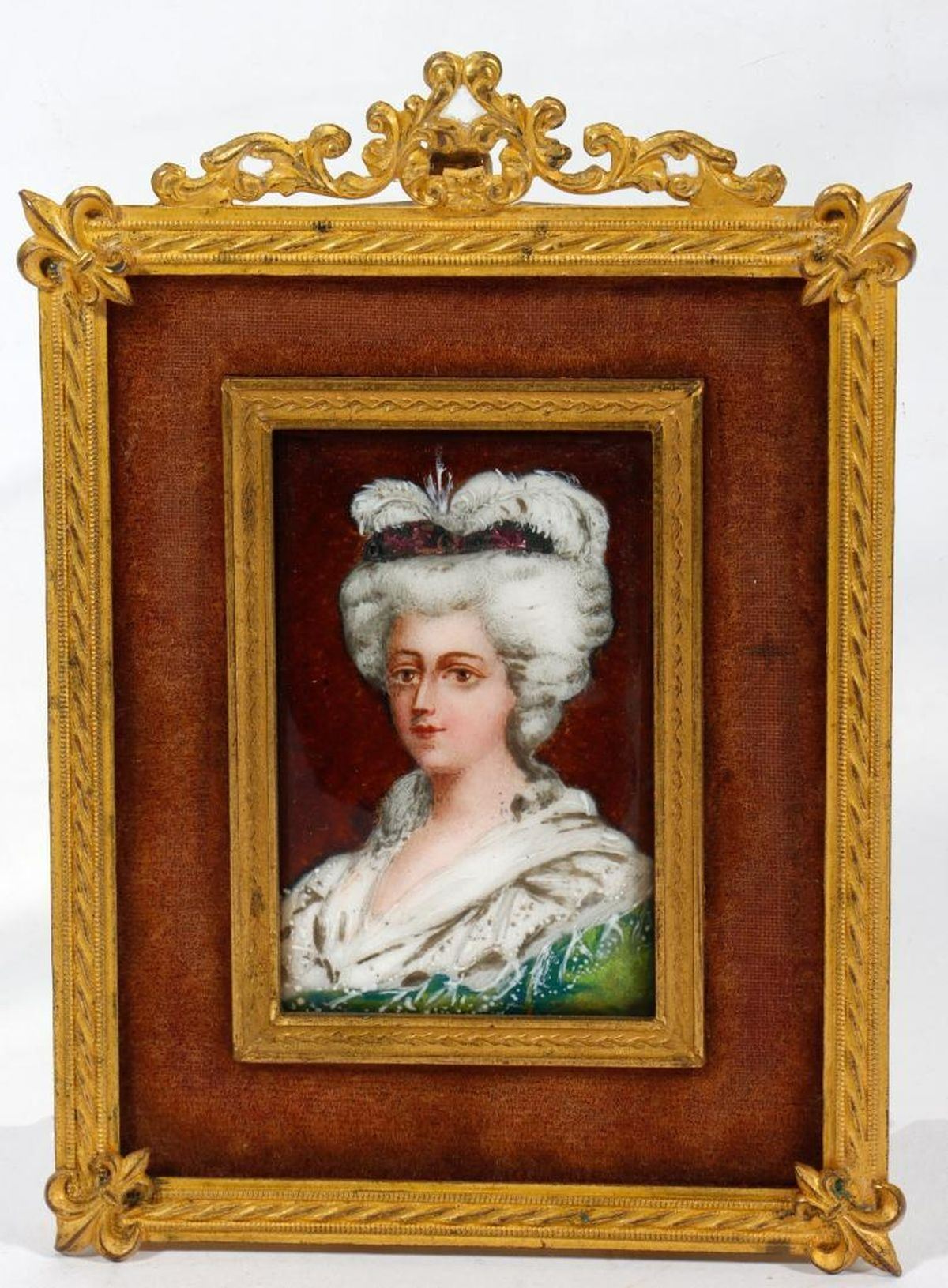 The portrait of an 18th century lady set in a gilt and velvet/flocked matte; together with a French Neoclassical style decorated enameled silver-plated mirror, with maker's marks (EUL [?] in squared-end diamond) and "France". Miniature: 2in. x 1 1/2in. (portrait); 4in. 4 3/4in. (frame) Mirror: 2 1/8in. x 1 13/16in. Condition: Both in good condition; the velvet of miniature matte is very worn.