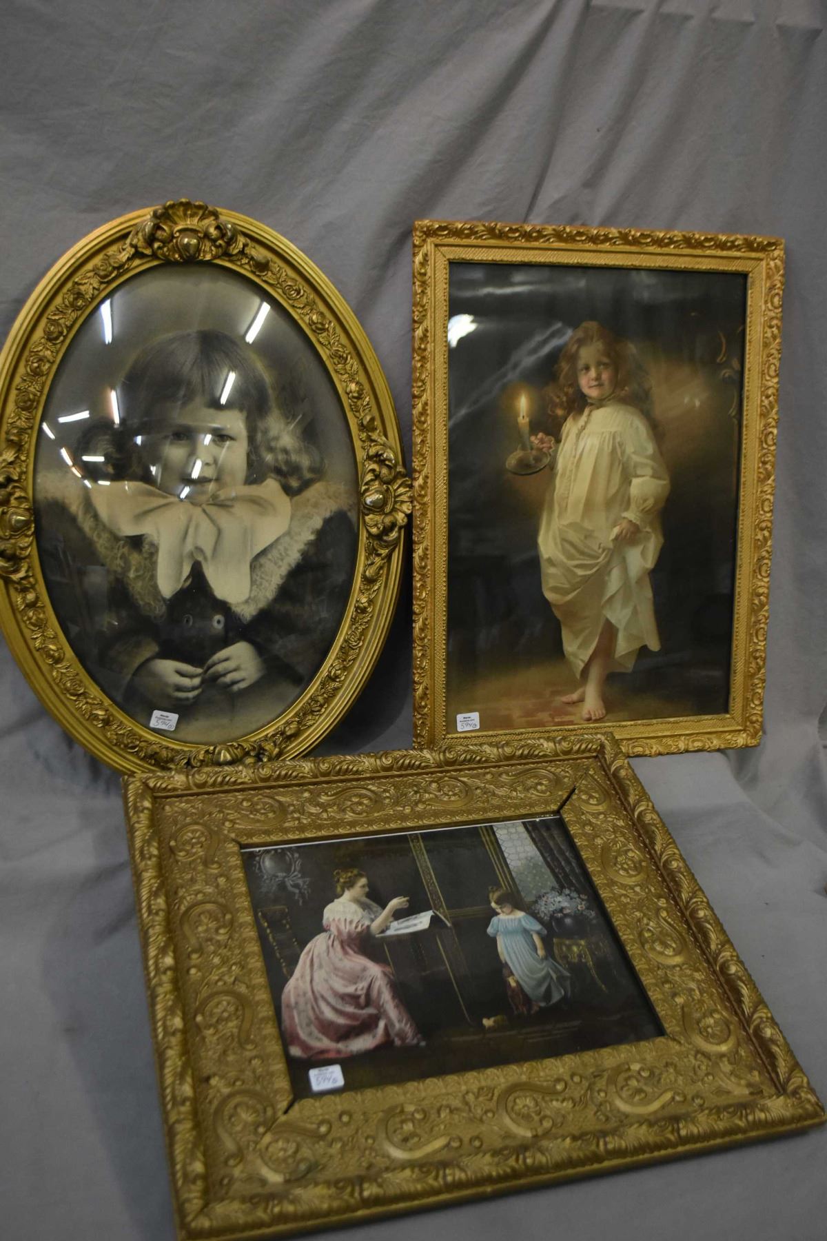 Gilt framed convex glass oval print of a young girls, plus a gilt framed parlour scene and a small girl in nightdress
